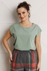 Блуза полуприлегающего силуэта со спущенной линией плеча, выполнена из блузочной ткани (тянется). Горловина округлой формы. В боковых швах по низу небольшие разрезы.