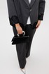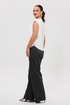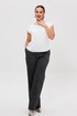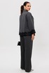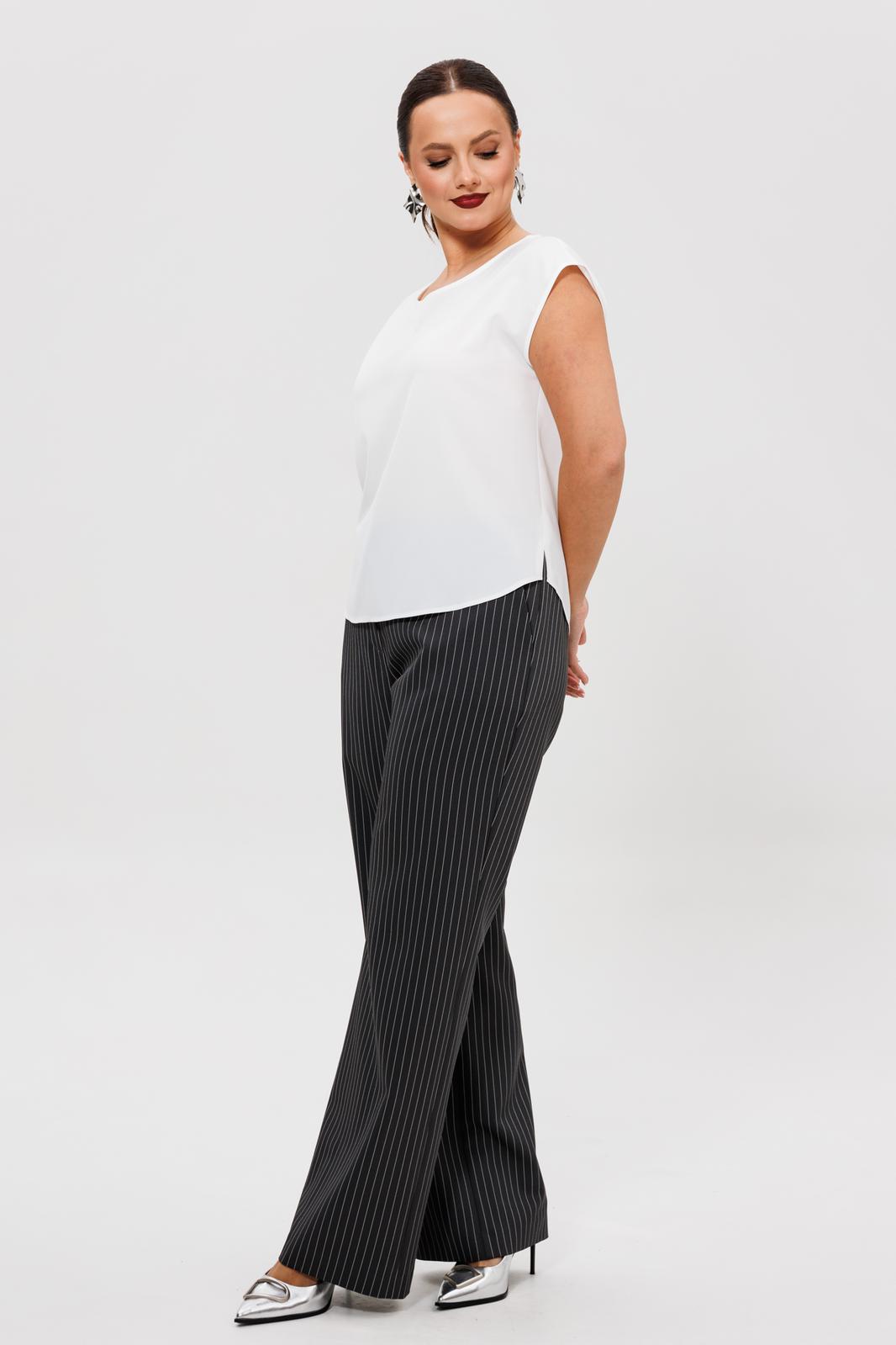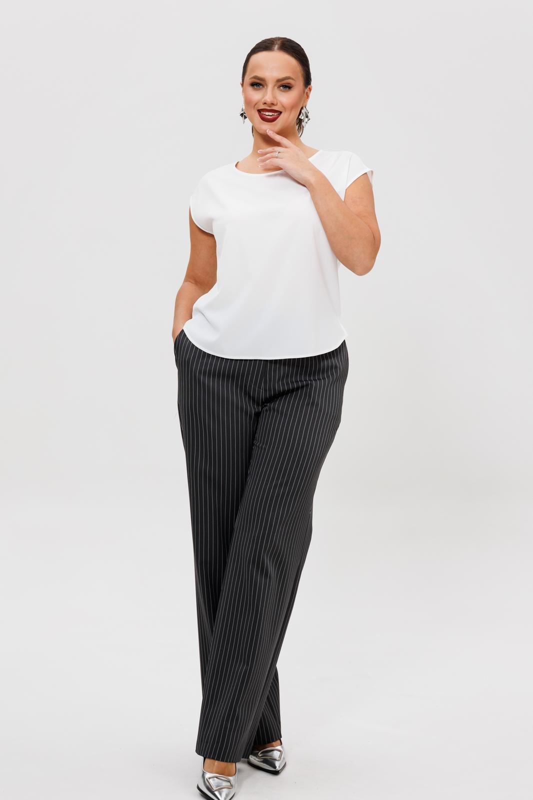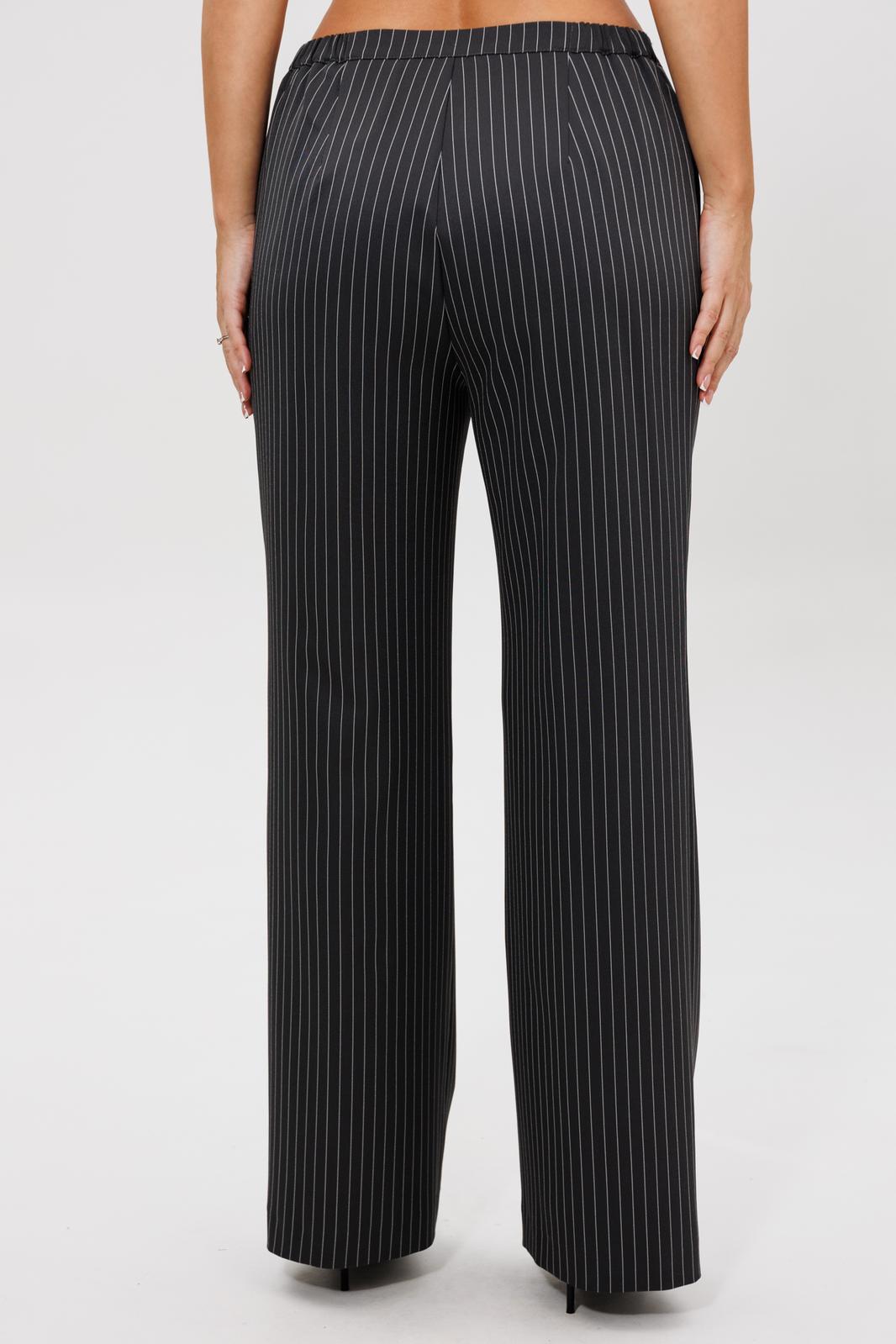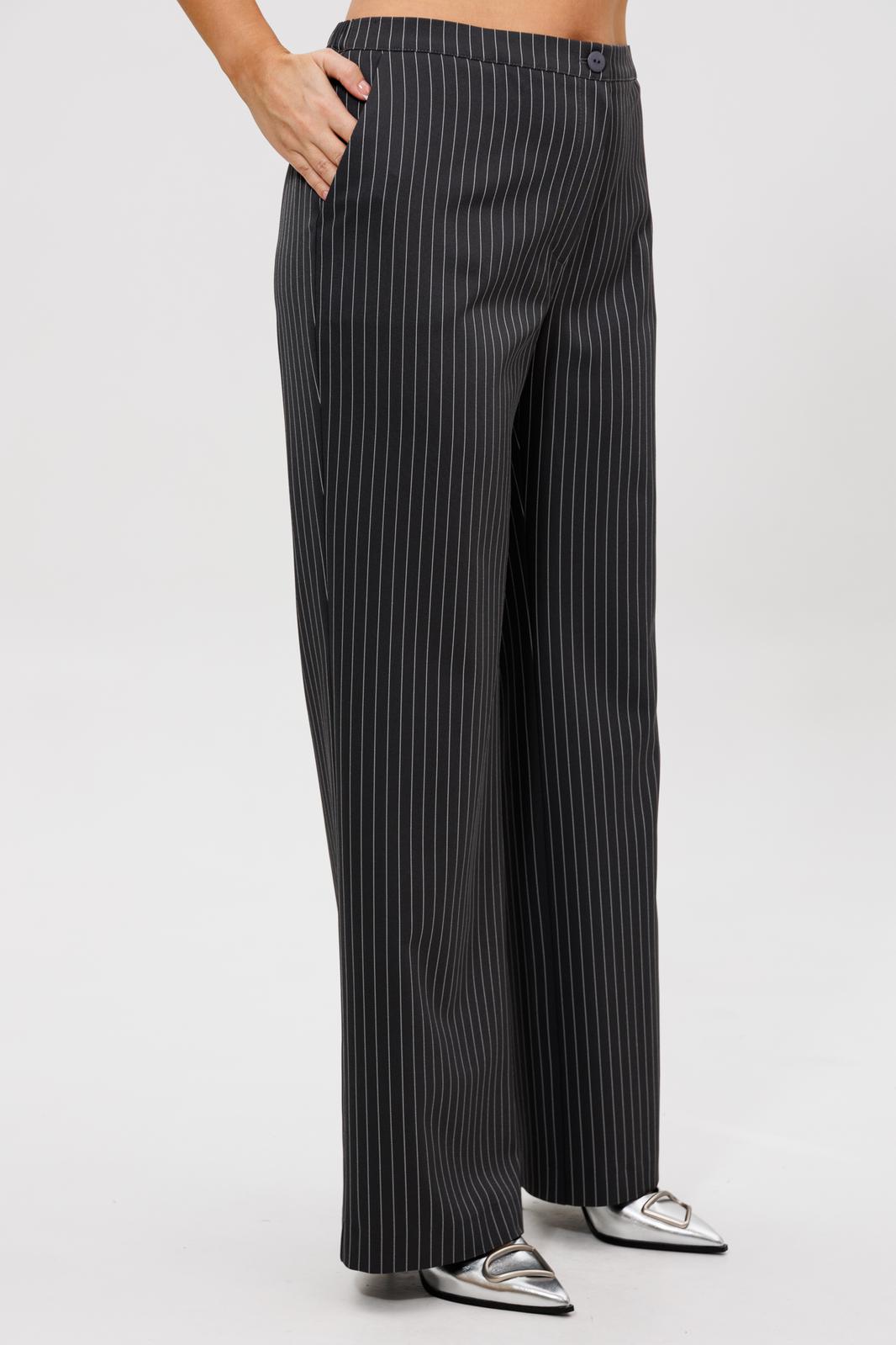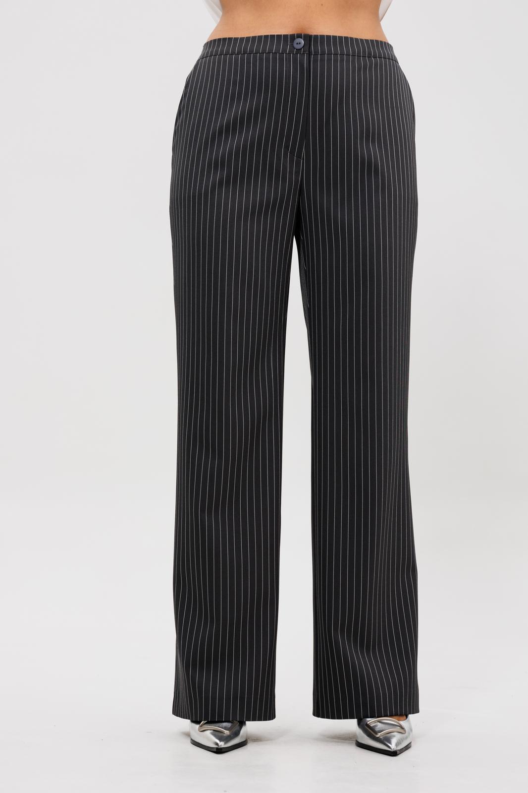 Брюки прямого кроя с высокой посадкой, выполненные из костюмной ткани в тонкую полоску (чуть тянется) с наклонными карманами в боковых швах. По срезу банта застежка-молния. Верхний срез оформлен поясом с эластичной резинкой по задней половинке.