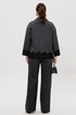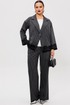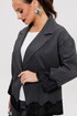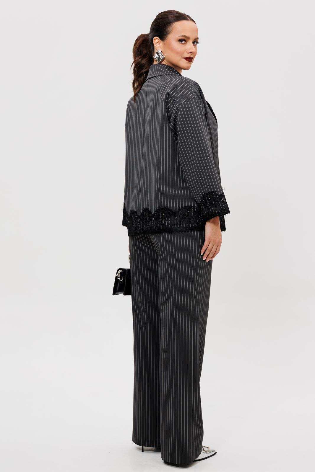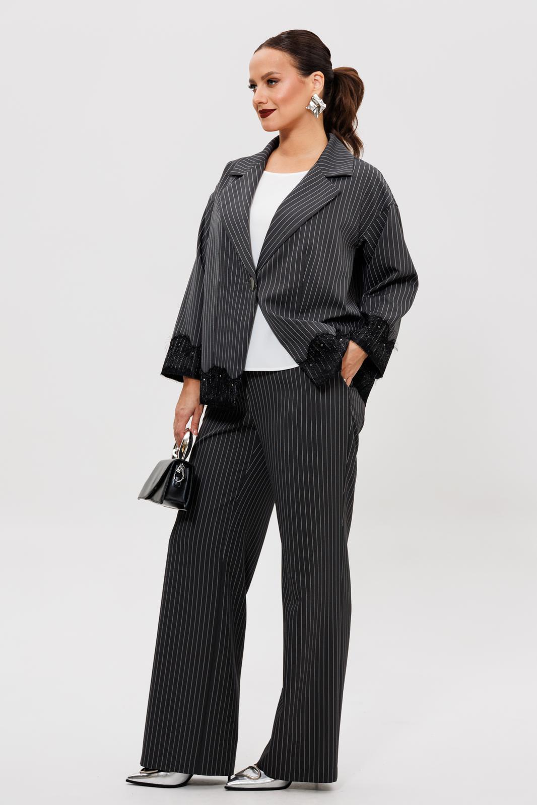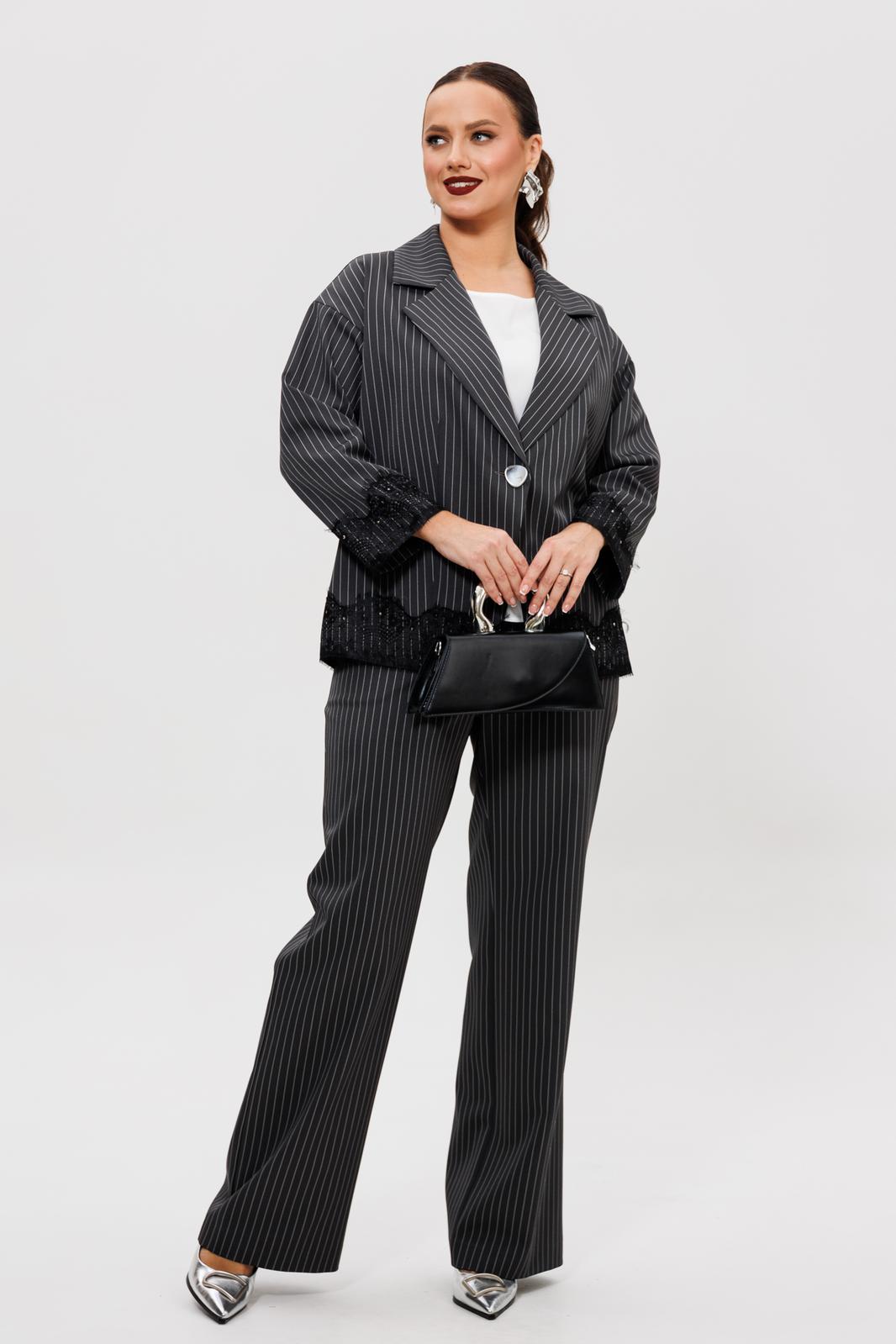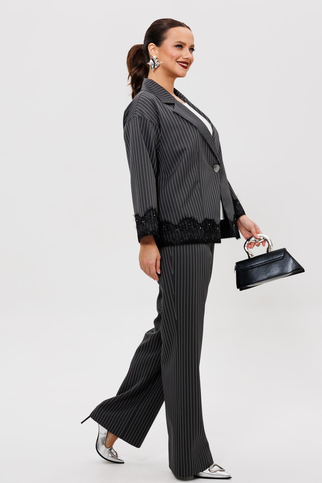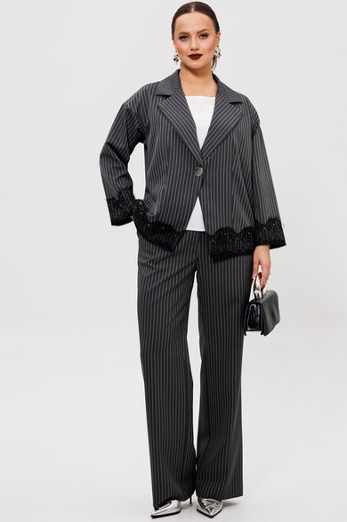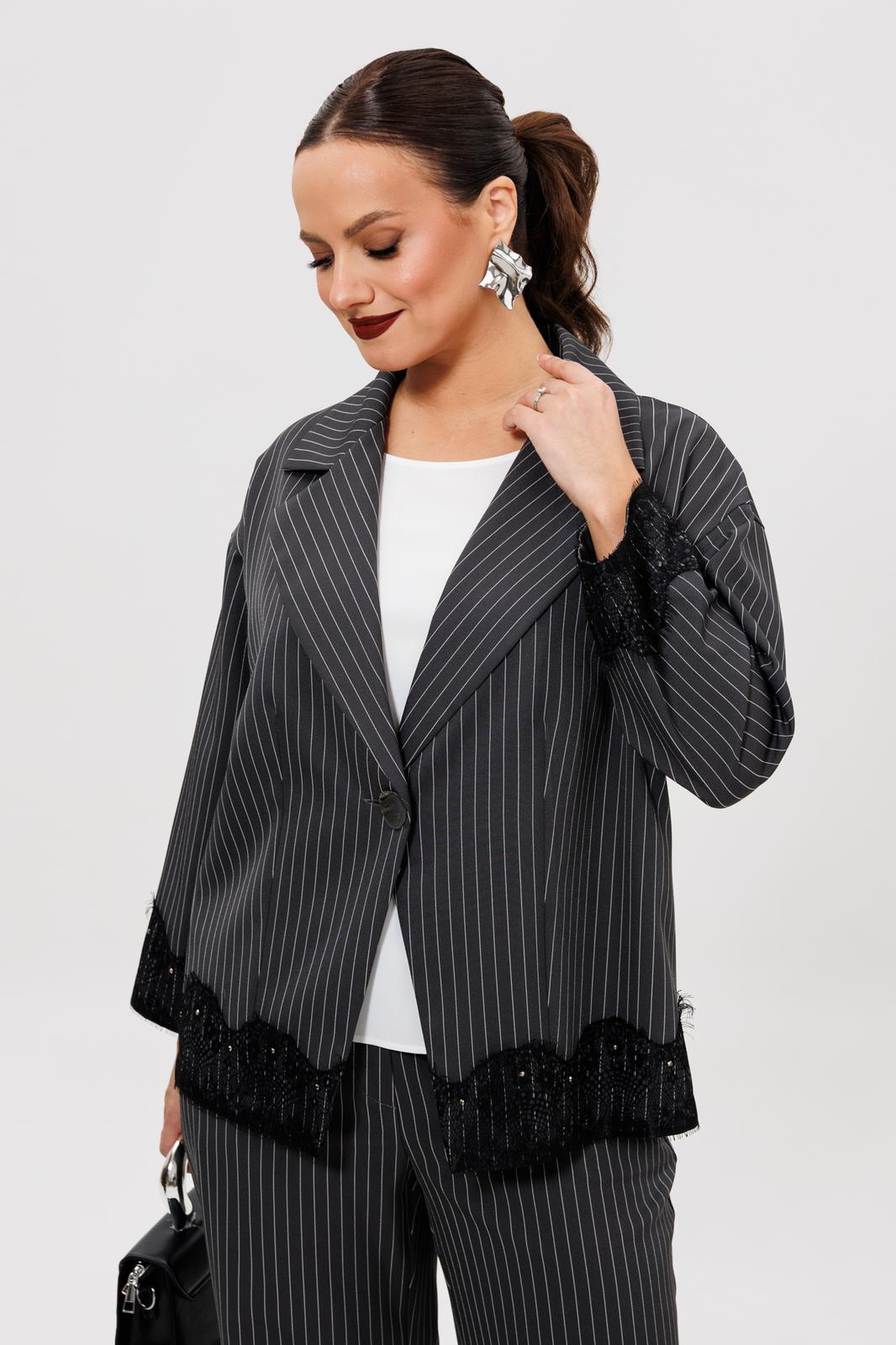 Жакет прямого силуэта со спущенной линией плеча, выполнен из костюмной ткани в тонкую полоску (чуть тянется). По переду нагрудная вытачка, центральная застежка на одну петлю и пуговицу. Горловина оформлена воротником пиджачного типа с лацканом. Спинка со средним швом. Рукава одношовные, длиной 7/8. Жакет без подкладки. Жакет декорирован по низу и по низу рукавов французским кружевом со стразами.