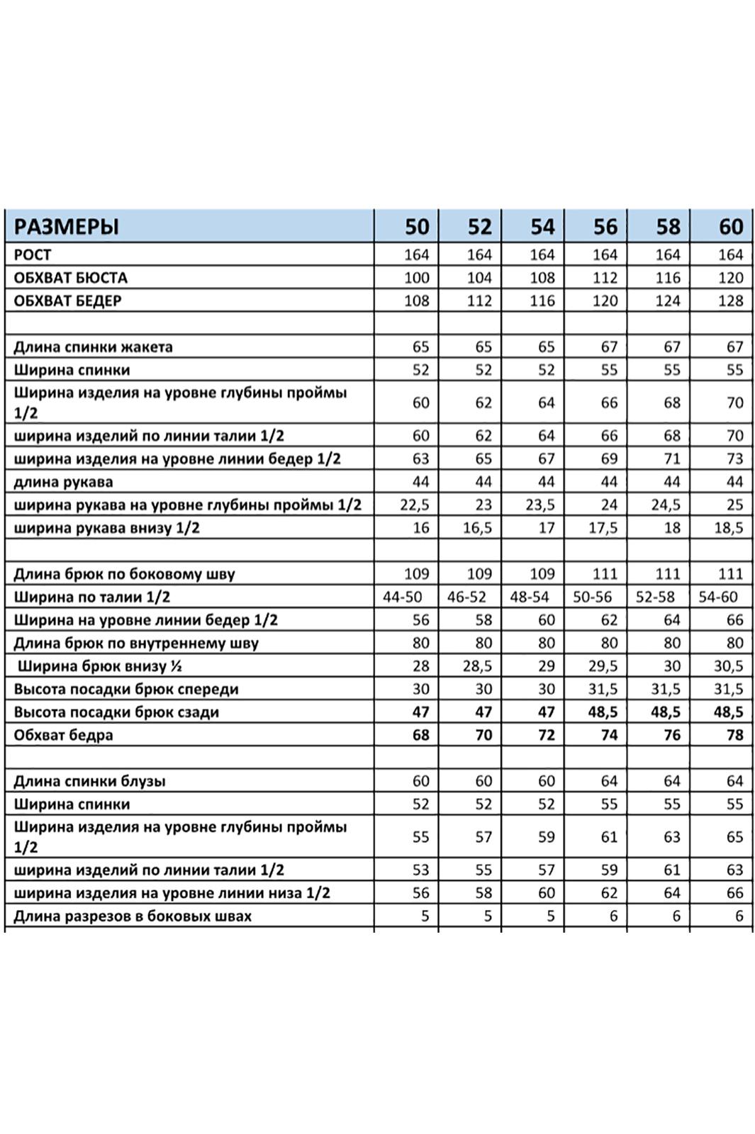 - Тип ткани: жакет и брюки- пэ 70 %, нейлон 28 %, лайкра 2 %, блуза- пэ 95%, спандекс 5%