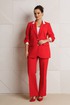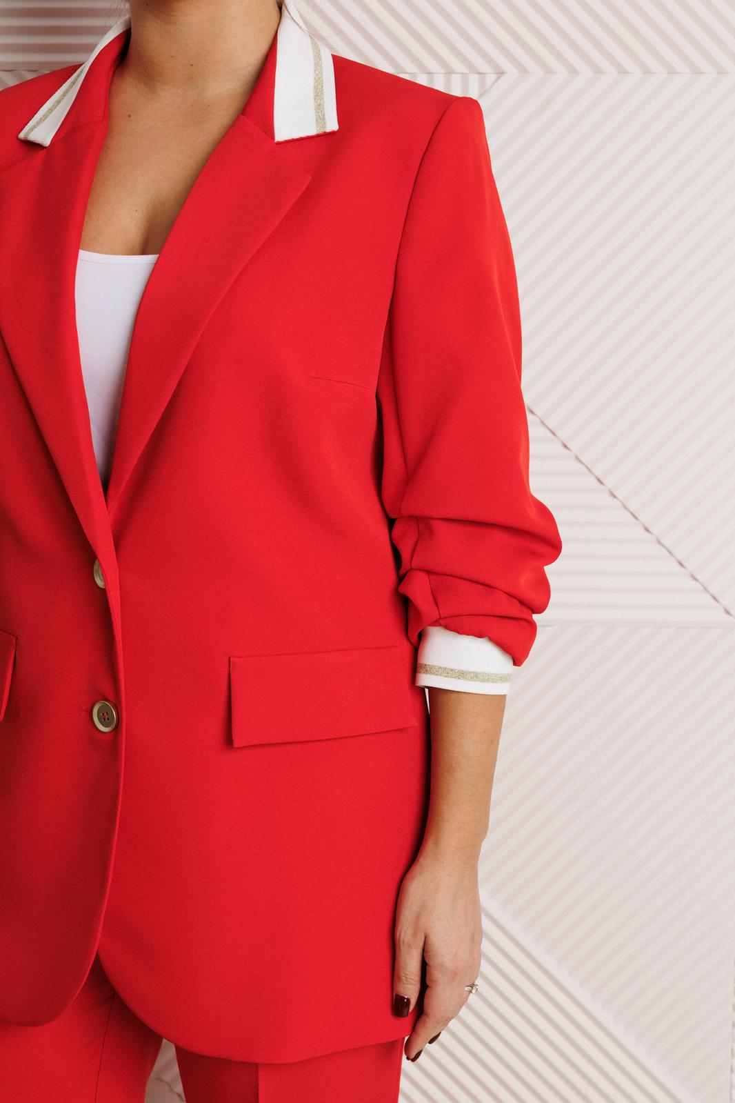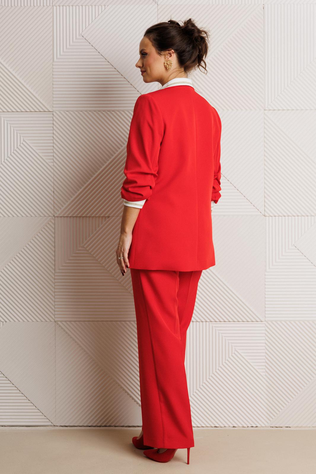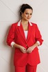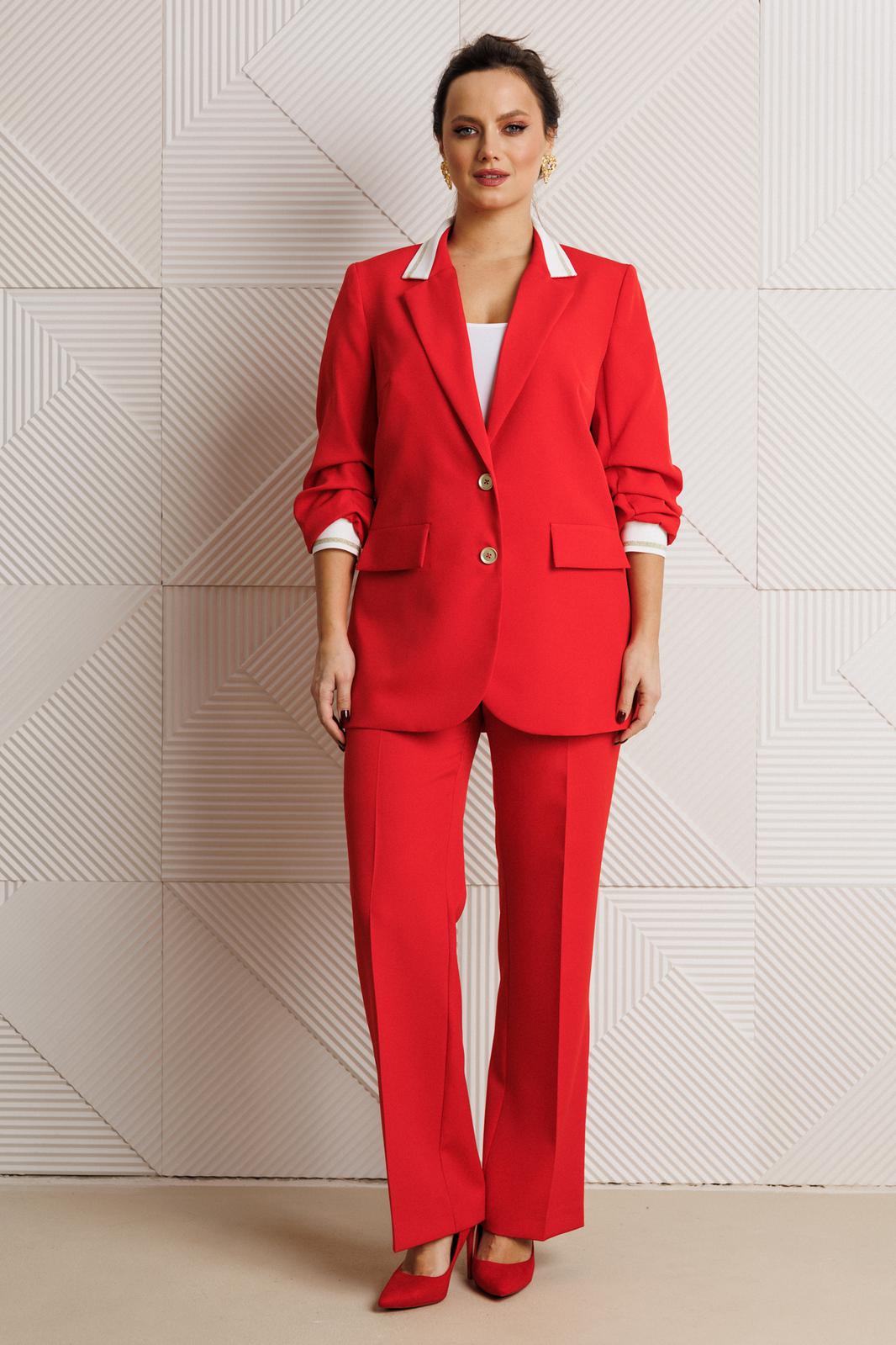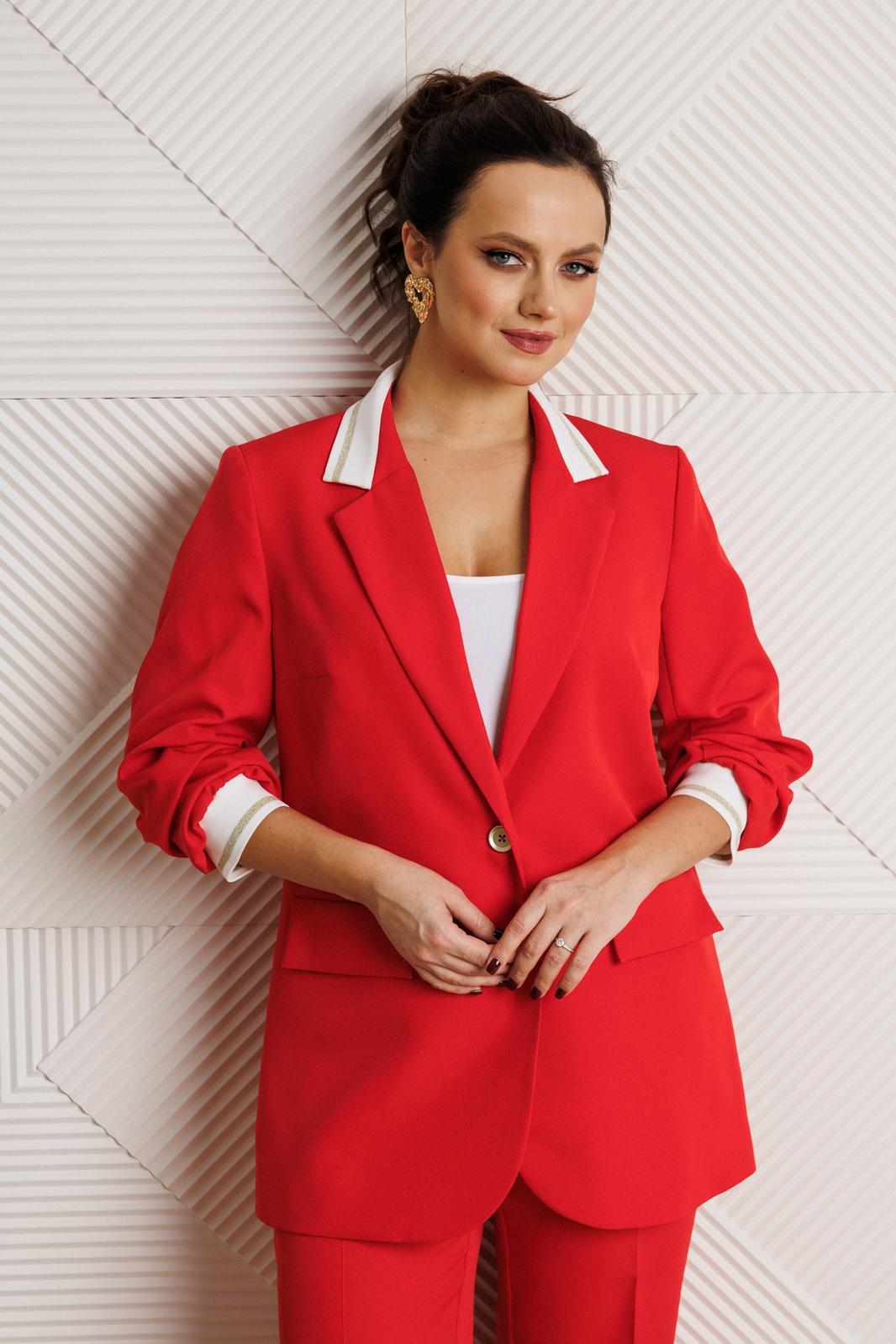 Жакет полуприлегающего силуэта, выполнен из костюмной ткани (не тянется) с отделкой из довяза на подкладке. Перед с нагрудными вытачками и настрочными клапанами. Застежка центральная на петли-пуговицы. Горловина оформлена воротником пиджачного типа с лацканом. Спинка со средним швом. Рукава втачные, двухшовные с мягкими складками и манжетой из довяза.