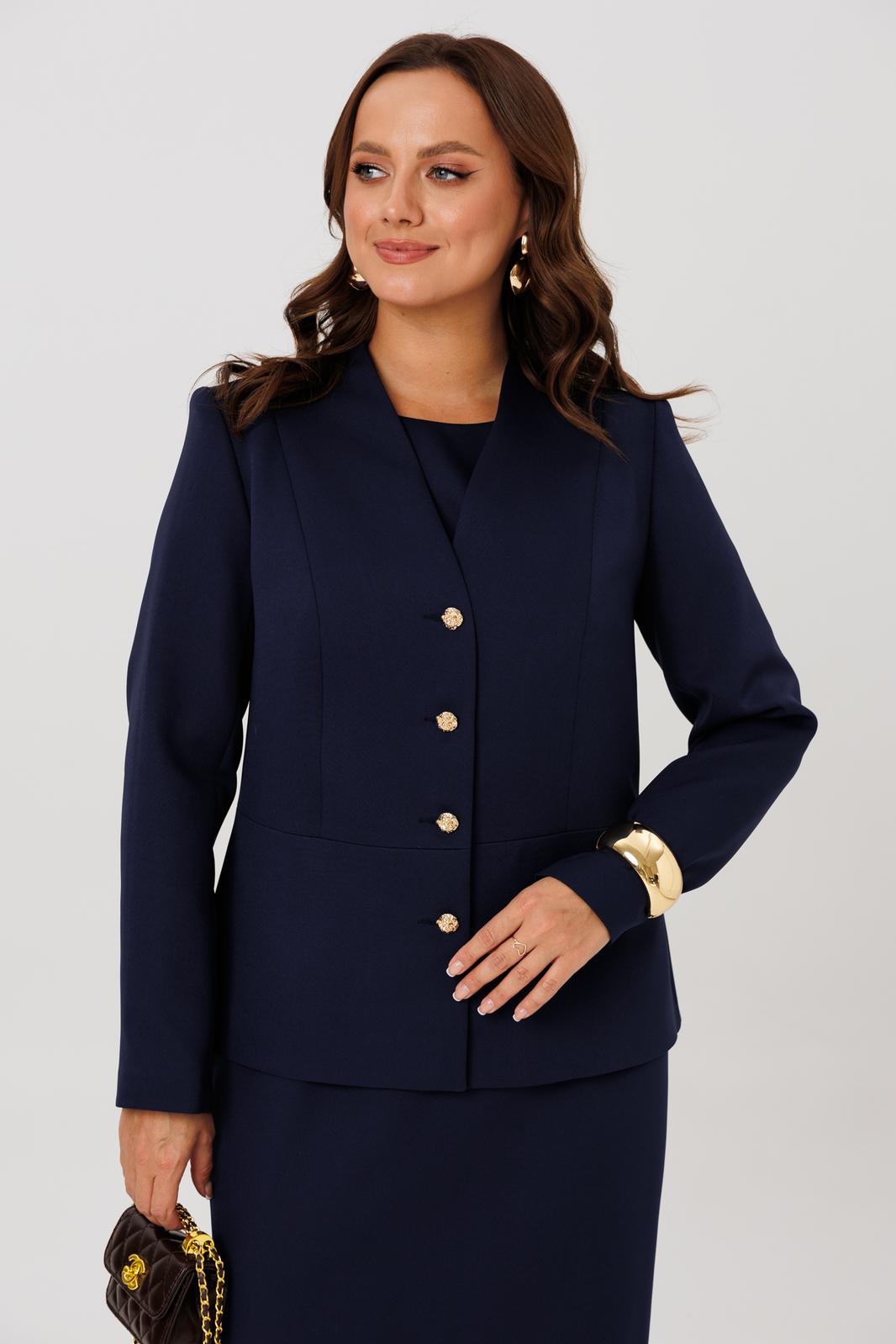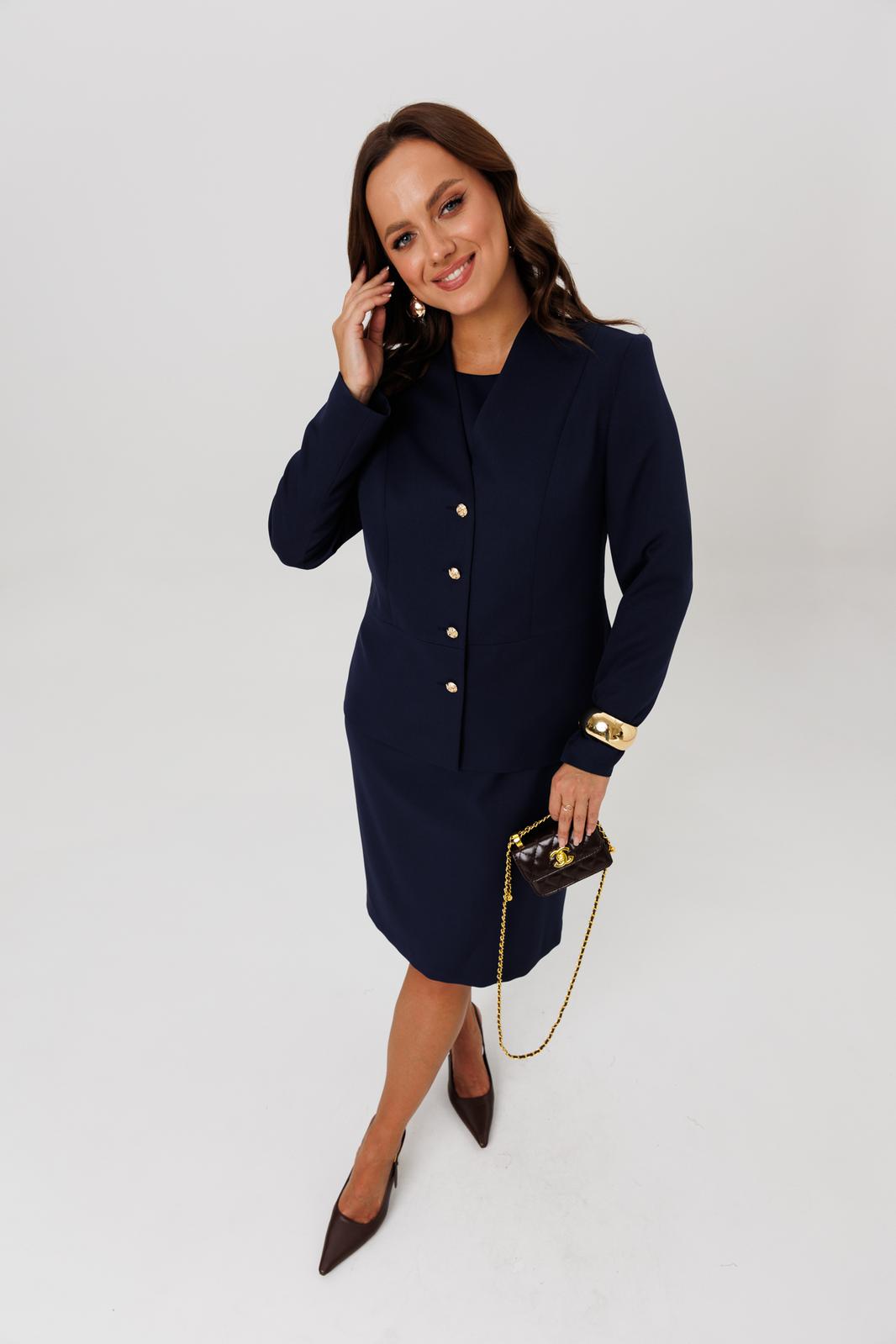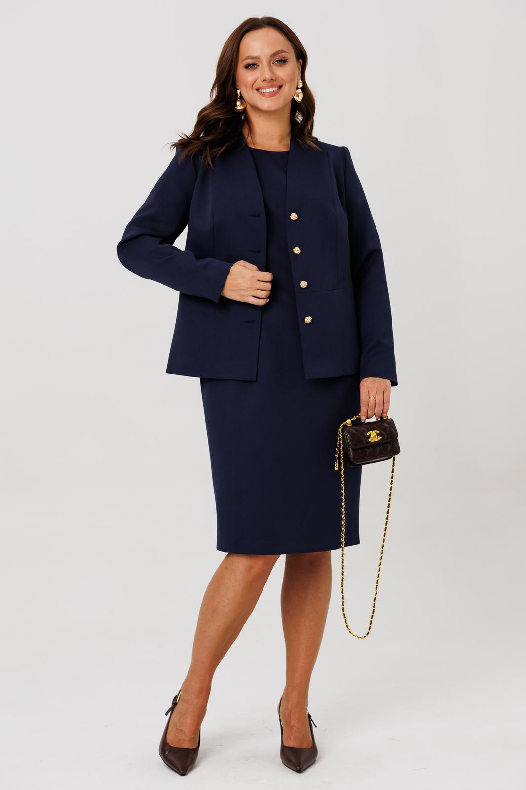 Элегантный женский комплект, состоящий из жакета и платья. Платье из костюмно-плательной ткани (чуть тянется) полуприлегающего силуэта без подкладки, по переду нагрудные и талиевые вытачки. Спинка со средним швом и шлицей, застежкой – молнией и талиевыми вытачками, рукава втачные, одношовные. Горловина оформлена вырезом округлой формы.