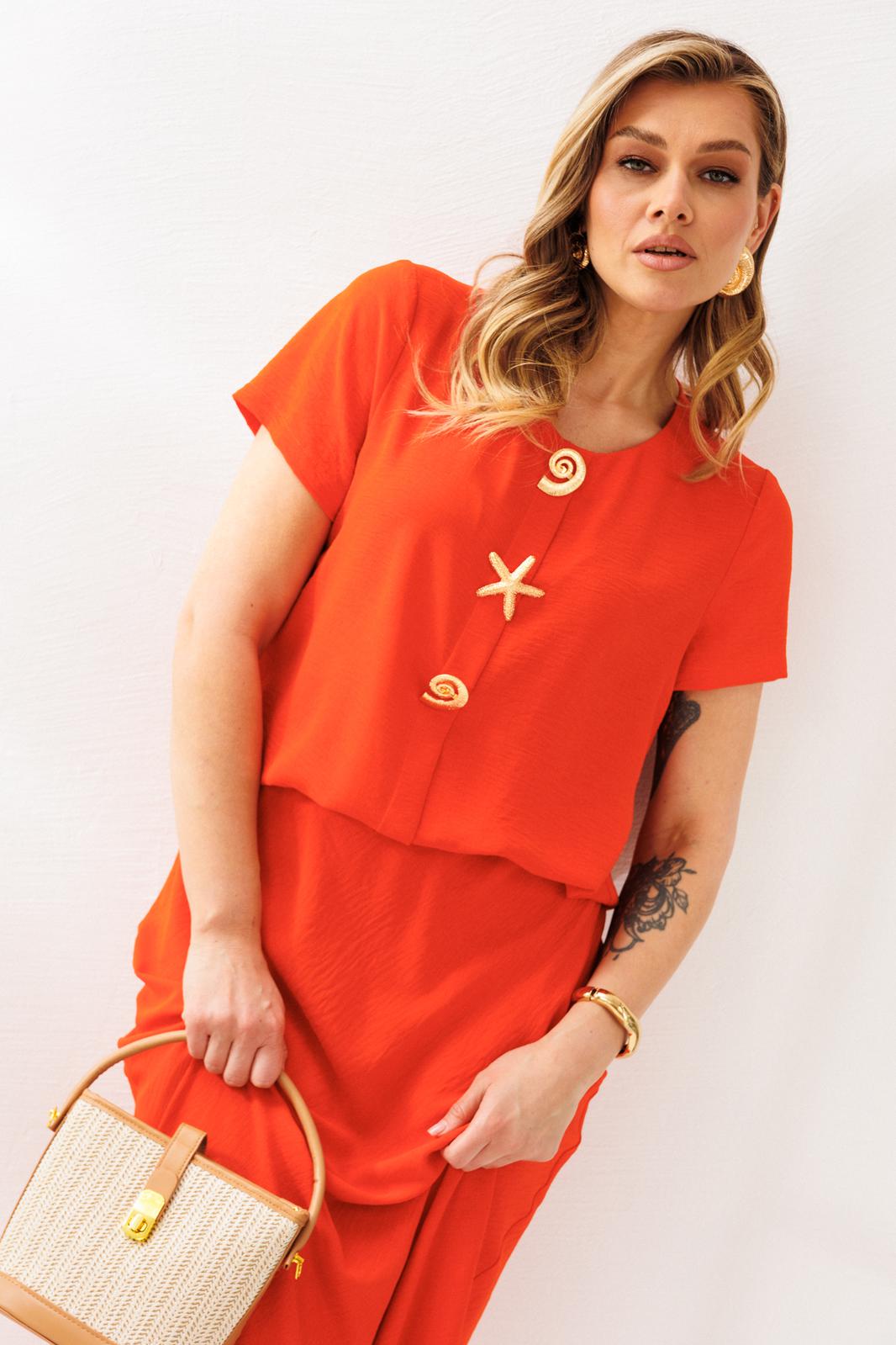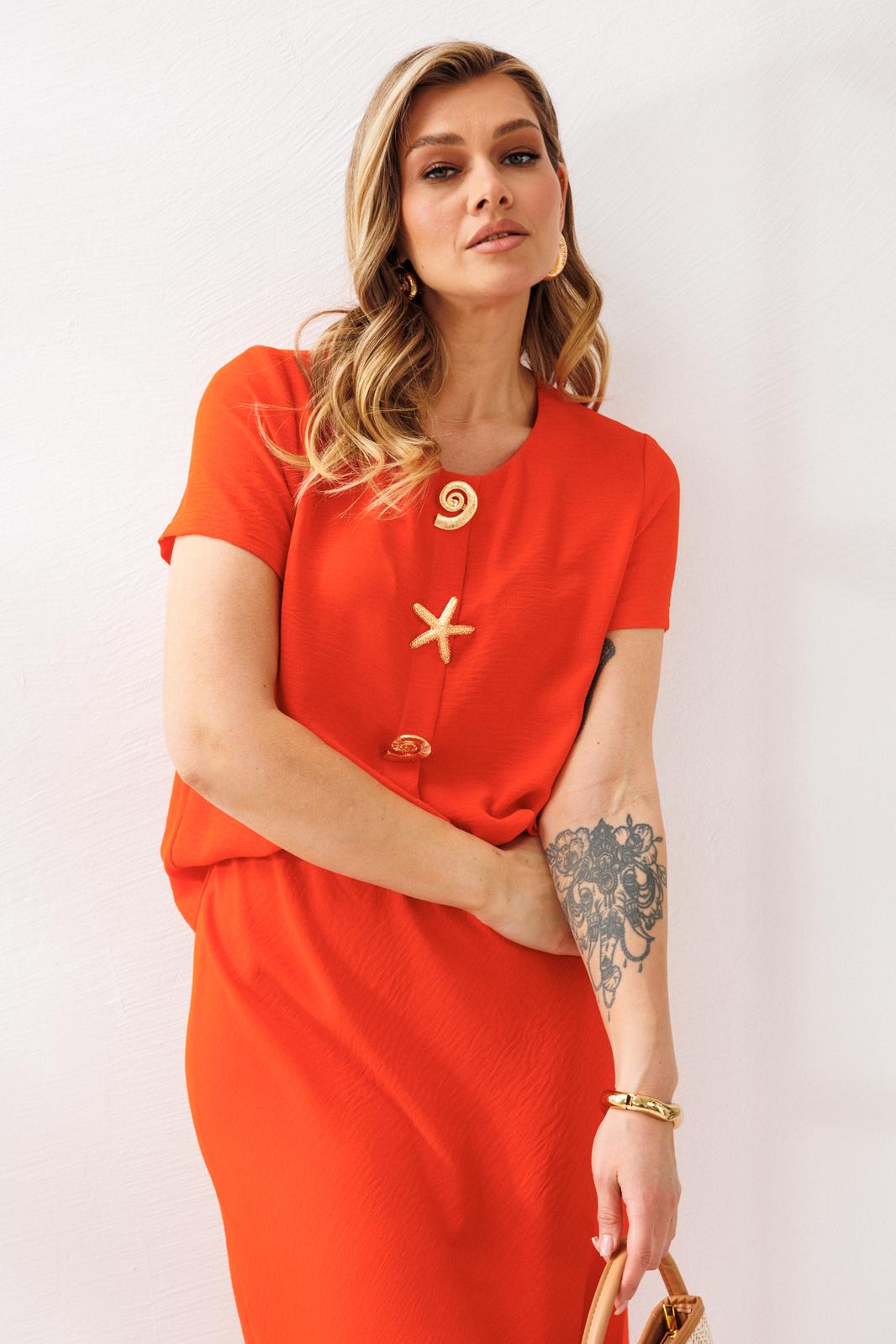 Блуза прямого свободного силуэта. По переду отделочная складка с декором в виде 3-х съемных брошей. По спинке средний шов. Горловина округлой формы. Рукава втачные, одношовные.