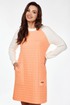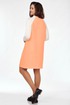 Платье А-силуэта, свободного кроя, выполненное из двух видов ткани: стежка (не тянется) и трикотажное полотно (тянется). Перед цельный с нагрудными вытачками и накладными карманами. Спинка цельная. Рукав покроя реглан с притачной манжетой. Горловина округлой формы, оформленная притачной планкой. Левый карман платья декорирован пришивным лейблом. Платье без подкладки.