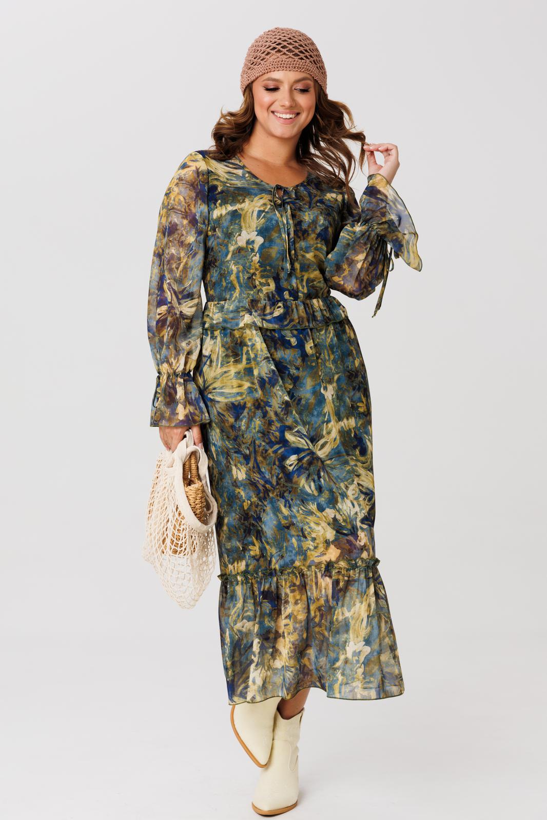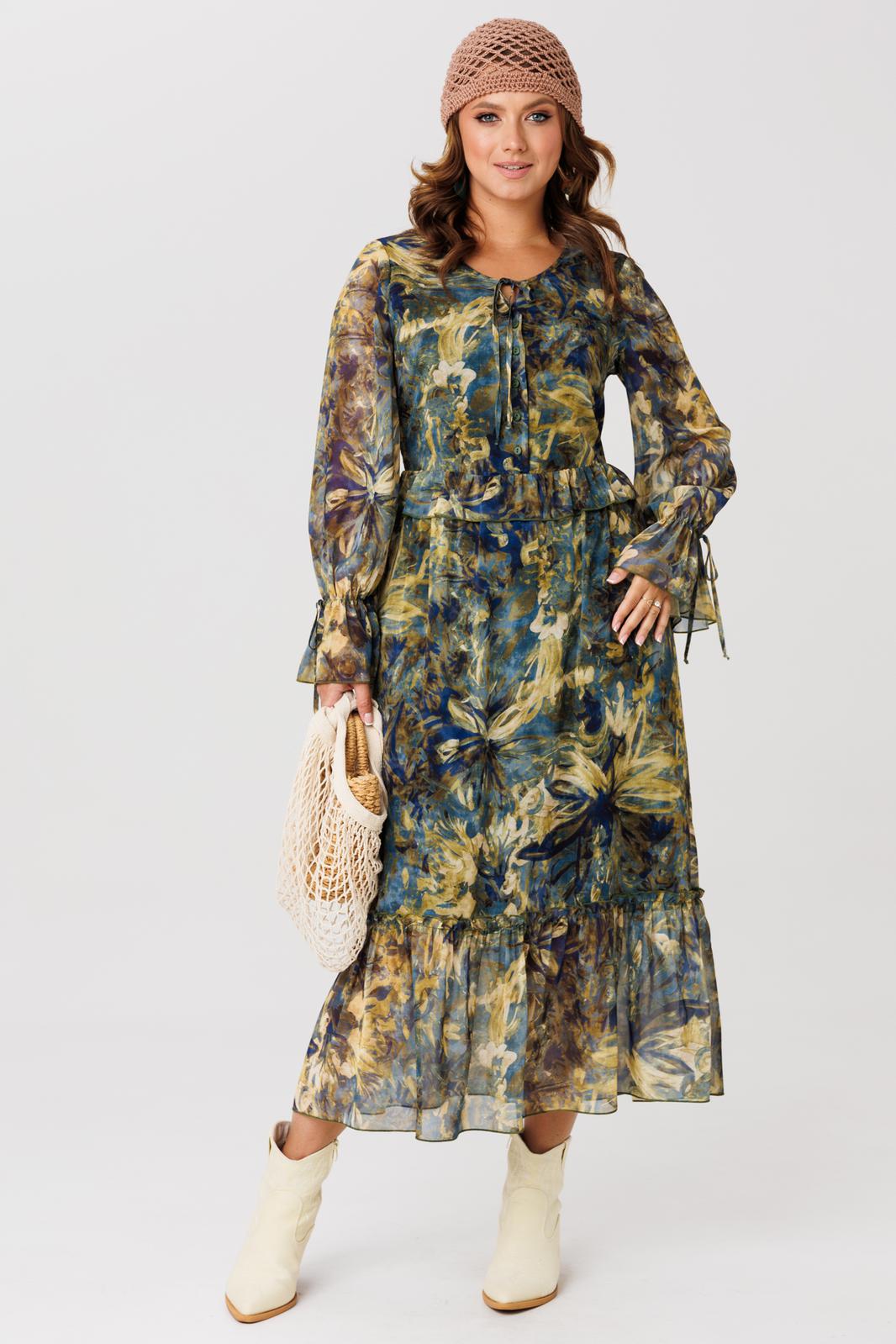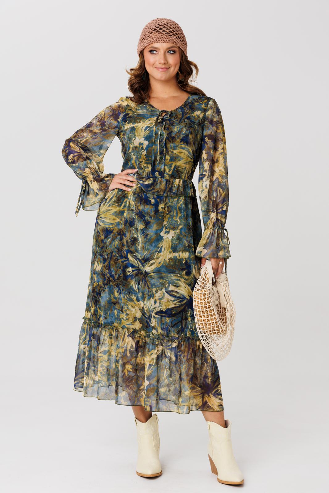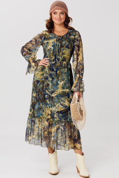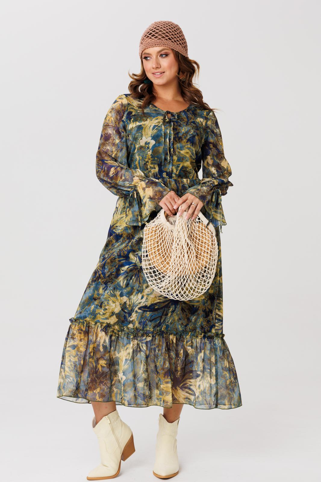 Нарядное женское платье прямого силуэта, выполненное из плательной шифоновой ткани (не тянется), на трикотажной подкладке (тянется). Платье отрезное по линии талии. По лифу переда центральная застежка на петли-пуговицы. Горловина округлой формы, обработана окантовкой, переходящей в завязки. В горизонтальный подрез по переду вставлен волан. Нижняя часть платья присборена по линии подреза. По низу платья – настрочной широкий волан. Рукава втачные, одношовные. Низ рукава собран резинкой, по центру рукава декоративная завязка-бантик.