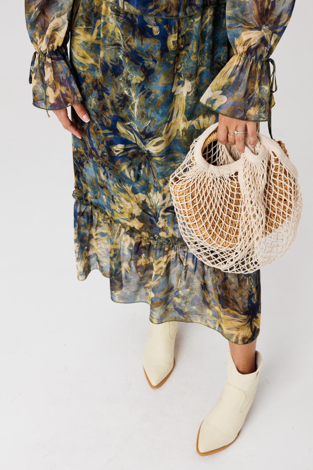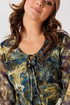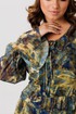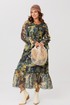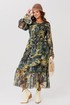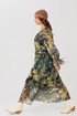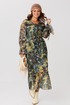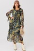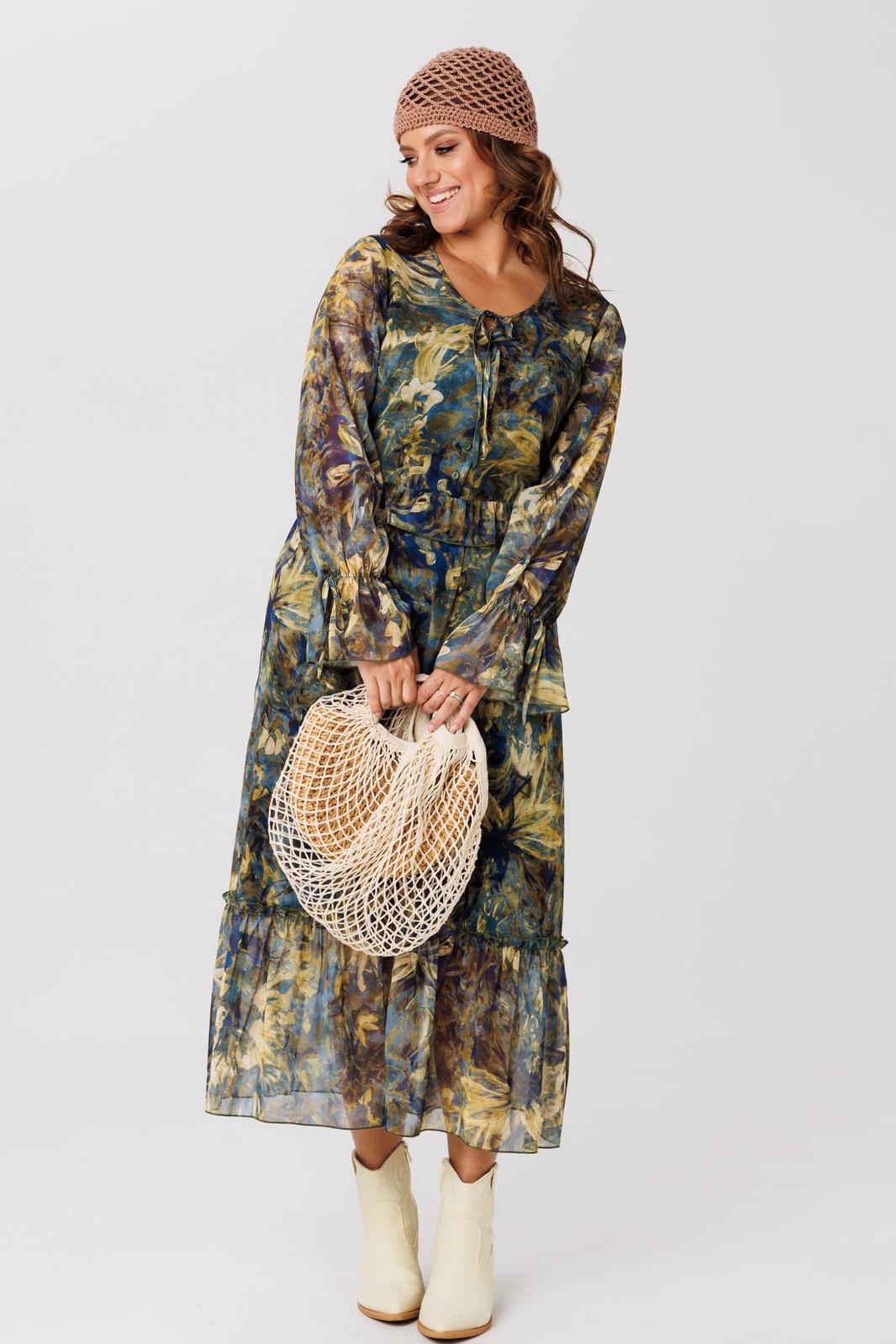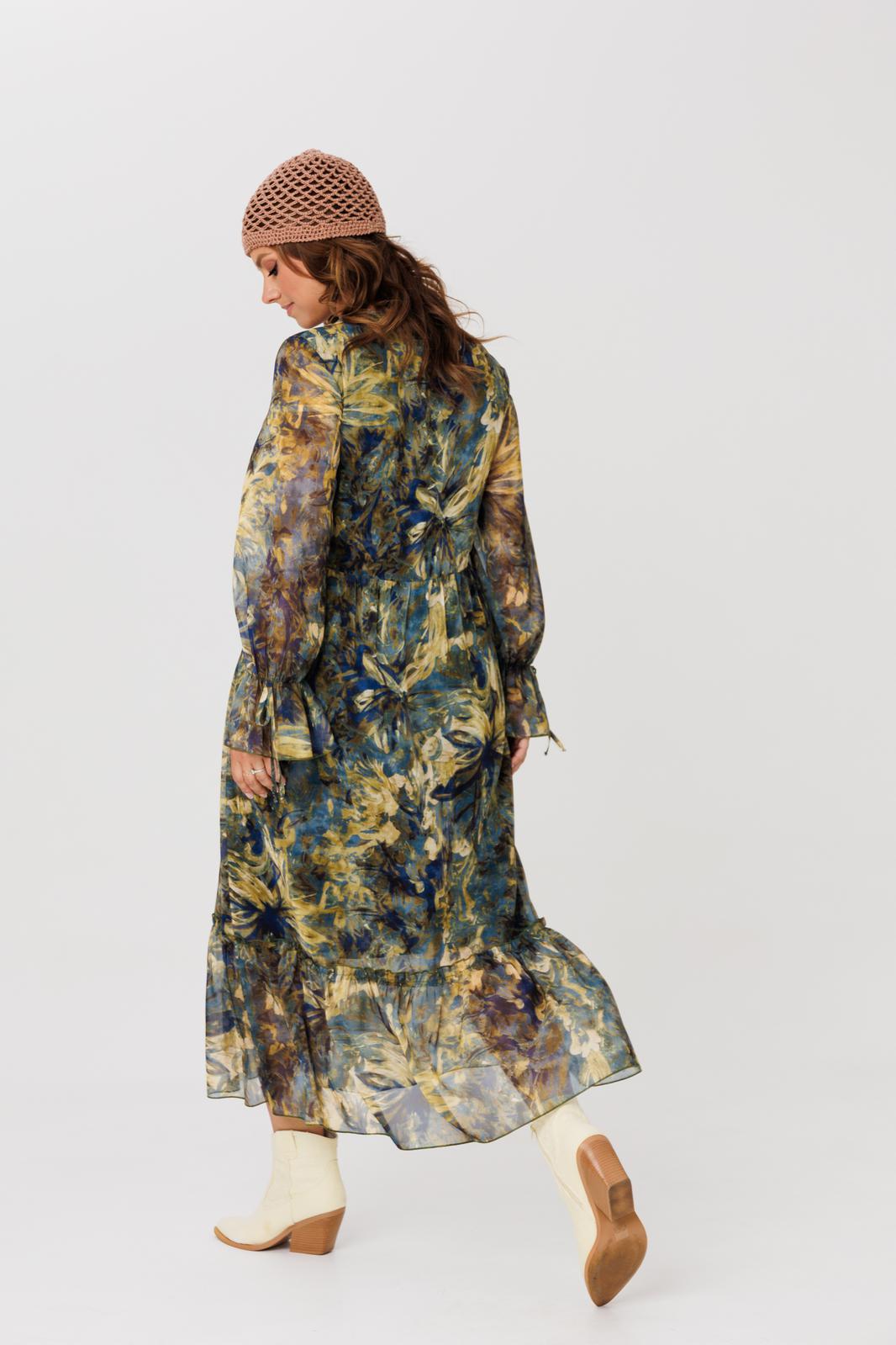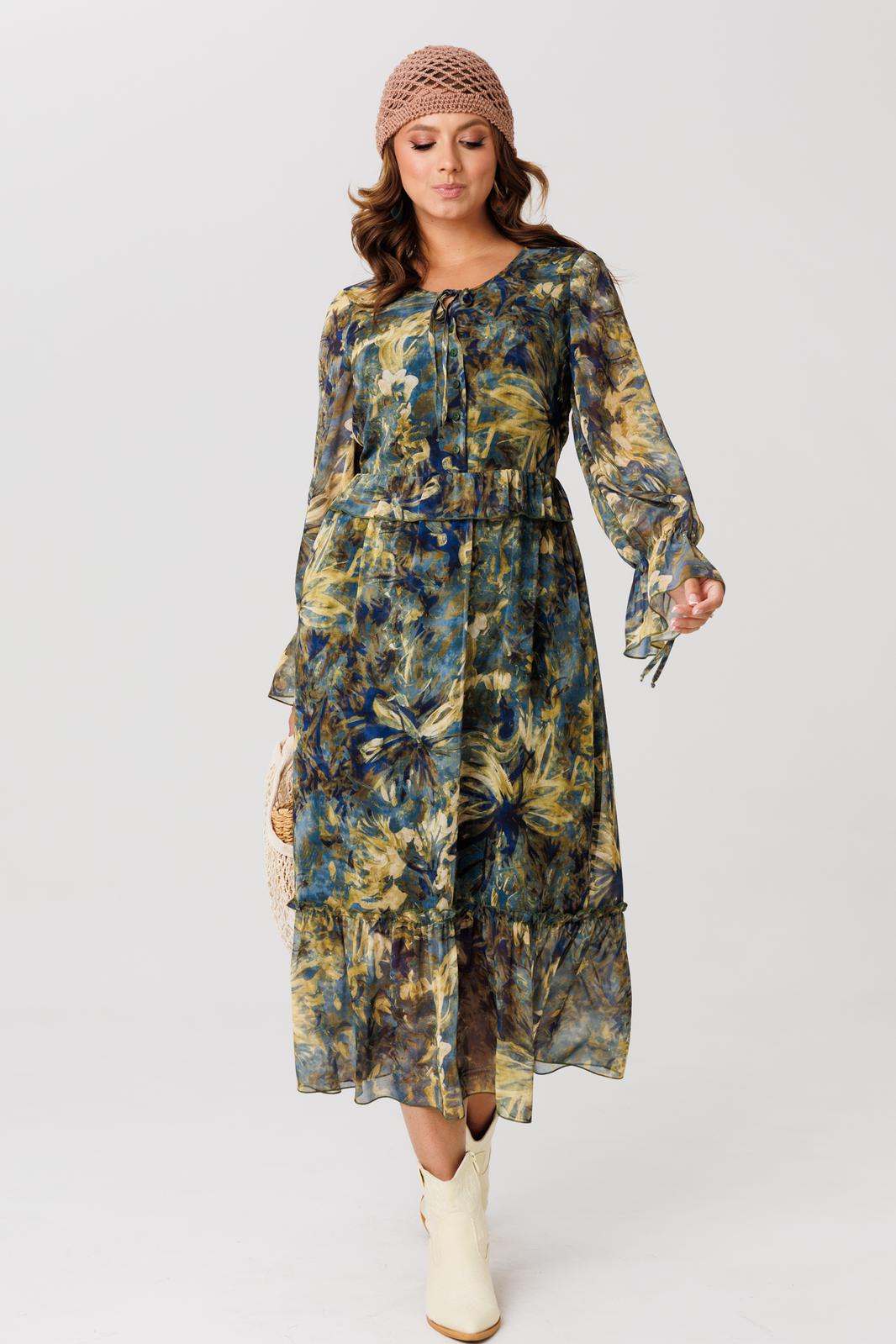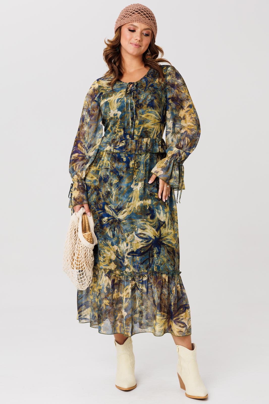 Нарядное женское платье прямого силуэта, выполненное из плательной шифоновой ткани (не тянется), на трикотажной подкладке (тянется). Платье отрезное по линии талии. По лифу переда центральная застежка на петли-пуговицы. Горловина округлой формы, обработана окантовкой, переходящей в завязки. В горизонтальный подрез по переду вставлен волан. Нижняя часть платья присборена по линии подреза. По низу платья – настрочной широкий волан. Рукава втачные, одношовные. Низ рукава собран резинкой, по центру рукава декоративная завязка-бантик.