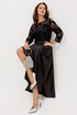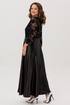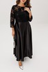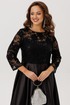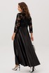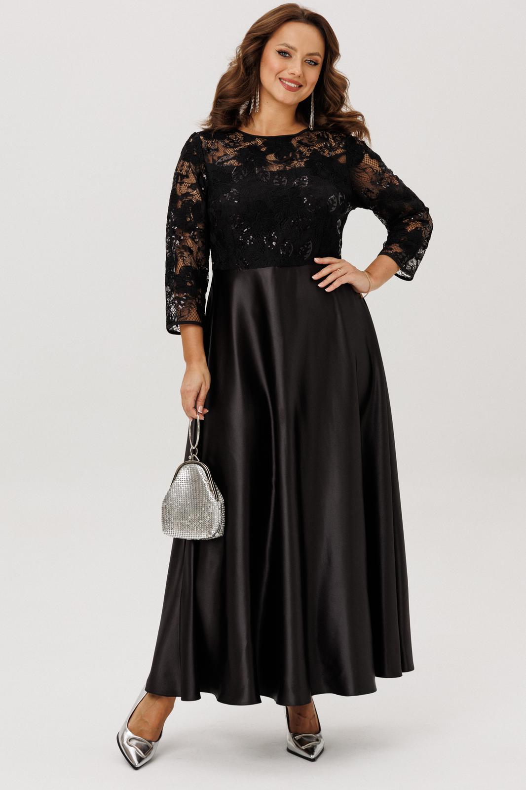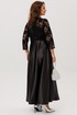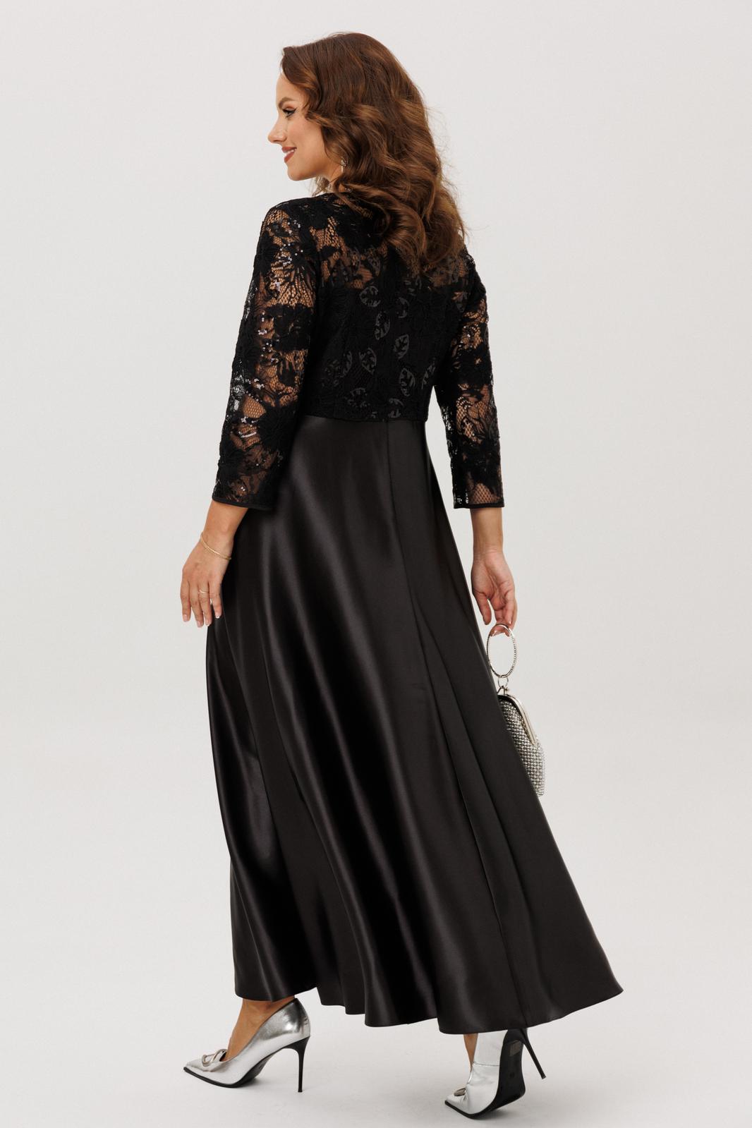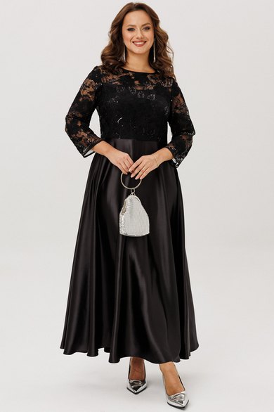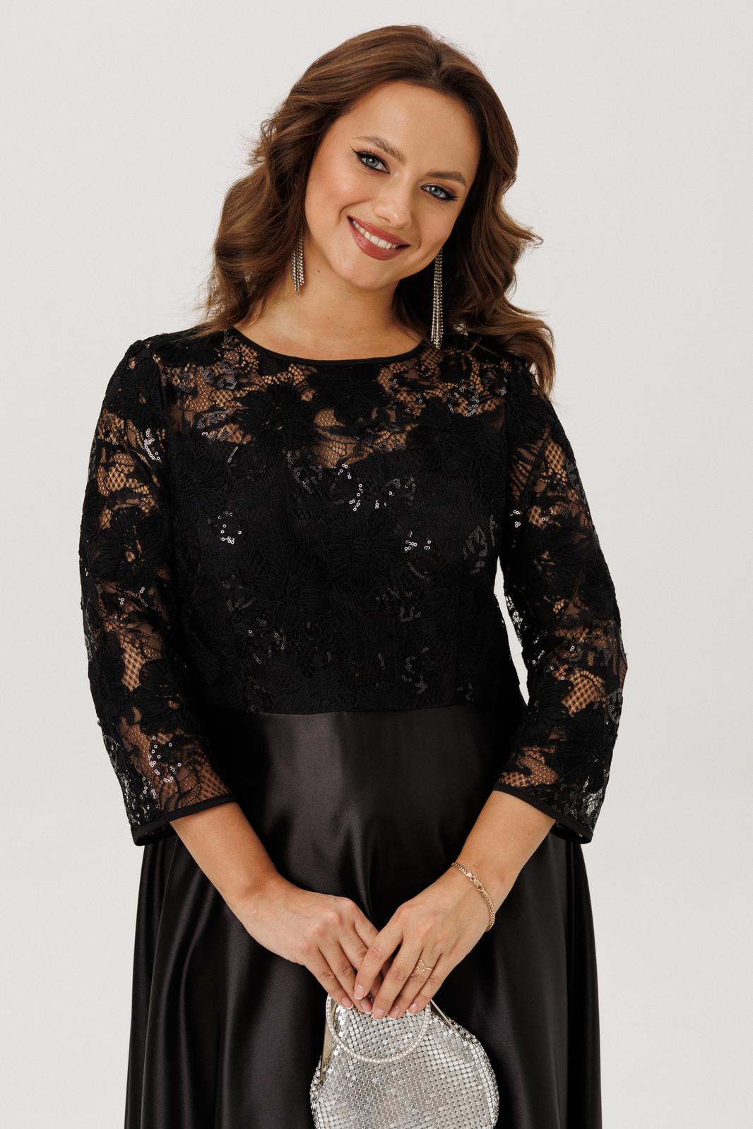 Нарядное женское платье отрезное по линии талии. Верхняя часть выполнена из гипюра с вышивкой и пайетками (не тянется), нижняя часть из плательного шелка «Армани» (немного тянется). По лифу переда – талиевые вытачки. По лифу спинки средний шов и потайная застежка-молния. По лифу переда и спинки – подкладка (немного тянется). Горловина округлой формы, обработана окантовкой. Рукава втачные, одношовные, по низу обработаны окантовкой. Нижняя часть платья – «полусолнце» по спинке со средним швом.