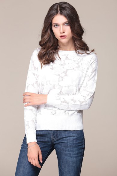 Джемпер женский комбинированного ажурного переплетения. Перед джемпера украшен клеевыми стразами. Вырез горловины круглый поставлен на резинку. Рукав втачной со спущенной проймойй. Низ рукава и низ изделия на вывязанном манжете-резинке. 158/164-42 Длина изделия - 51 см, длина рукава от горловины - 61 см (обмер проводится на горизонтальной поверхности); 158/164-44 Длина изделия - 51 см, длина рукава от горловины - 61 см (обмер проводится на горизонтальной поверхности); 158/164-46 Длина изделия - 51 см, длина рукава от горловины - 61 см (обмер проводится на горизонтальной поверхности); 158/164-48 Длина изделия - 51 см, длина рукава от горловины - 61 см (обмер проводится на горизонтальной поверхности); 158/164-50 Длина изделия - 51 см, длина рукава от горловины - 61 см (обмер проводится на горизонтальной поверхности);
