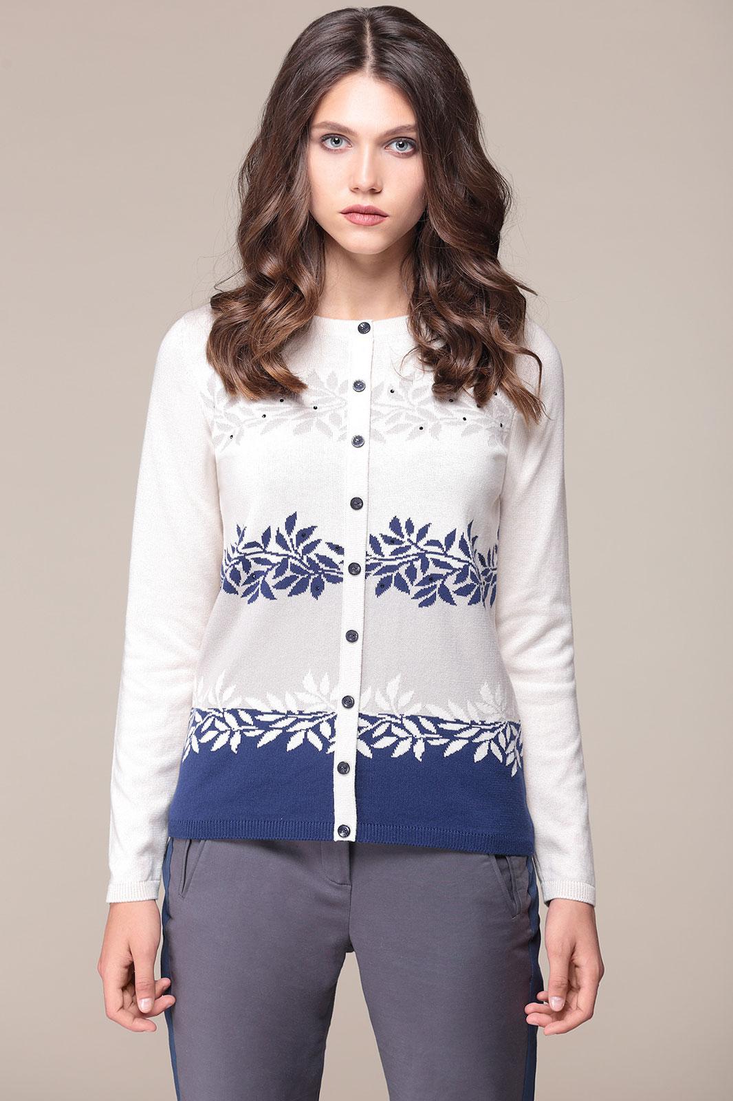 Джемпер женский кулирного переплетения. Перед жакета с жаккардовым 3-х цветным рисунком украшен клеевыми стразами. По переду джемпера расположена планка с 9 пуговицами, создающая имитацию застёжки. Вырез горловины круглый на планке. Рукав втачной длинный. Низ джемпера и низ рукава заканчивается вывязанным манжетом-резинкой. 158/164-46 Длина изделия - 57 см, длина рукава - 61 см (обмер проводится на горизонтальной поверхности); 158/164-48 Длина изделия - 57 см, длина рукава - 61 см (обмер проводится на горизонтальной поверхности); 158/164-50 Длина изделия - 57 см, длина рукава - 61 см (обмер проводится на горизонтальной поверхности); 158/164-52 Длина изделия - 60 см, длина рукава - 63 см (обмер проводится на горизонтальной поверхности); 158/164-54 Длина изделия - 60 см, длина рукава - 63 см (обмер проводится на горизонтальной поверхности); 158/164-56 Длина изделия - 60 см, длина рукава - 63 см (обмер проводится на горизонтальной поверхности); 158/164-58 Длина изделия - 60 см, длина рукава- 63 см (обмер проводится на горизонтальной поверхности);