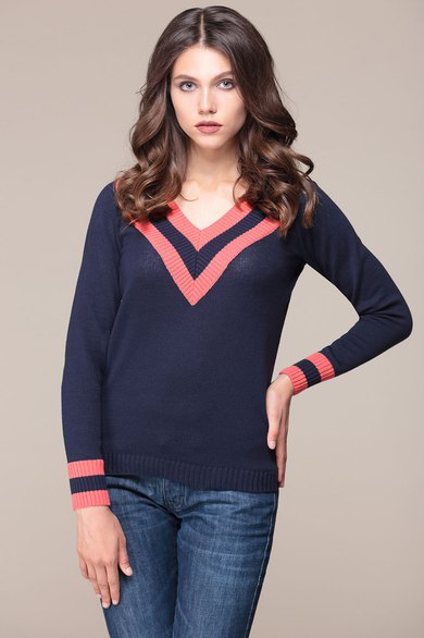 Джемпер женский из трикотажного полотна кулирного переплетения. Вырез горловины v-образный, обработан широкой планкой-резинкой с контрастными полосами. Рукав реглан. Низ рукава на манжете-резинке с контрастными полосами. Низ изделия на вывязанной резинке. 158/164-44 Длина изделия - 53 см, длина рукава от горловины - 58 см (обмер проводится на плоской поверхности); 158/164-46 Длина изделия - 53 см, длина рукава от горловины - 58 см (обмер проводится на плоской поверхности); 158/164-48 Длина изделия - 53 см, длина рукава от горловины - 58 см (обмер проводится на плоской поверхности); 158/164-50 Длина изделия - 55 см, длина рукава от горловины - 60 см (обмер проводится на плоской поверхности); 158/164-52 Длина изделия - 55 см, длина рукава от горловины - 60 см (обмер проводится на плоской поверхности); 158/164-54 Длина изделия - 55 см, длина рукава от горловины - 62 см (обмер проводится на плоской поверхности); 158/164-56 Длина изделия - 55 см, длина рукава от горловины - 62 см (обмер проводится на плоской поверхности);