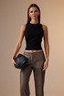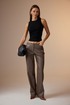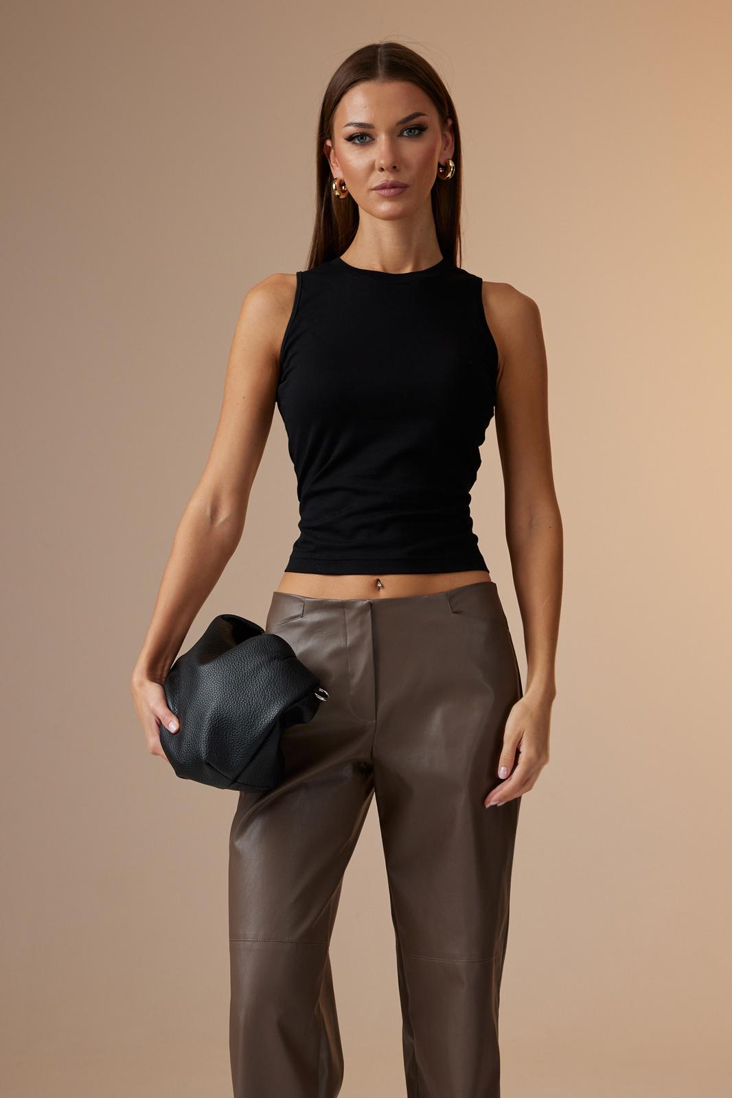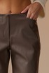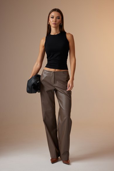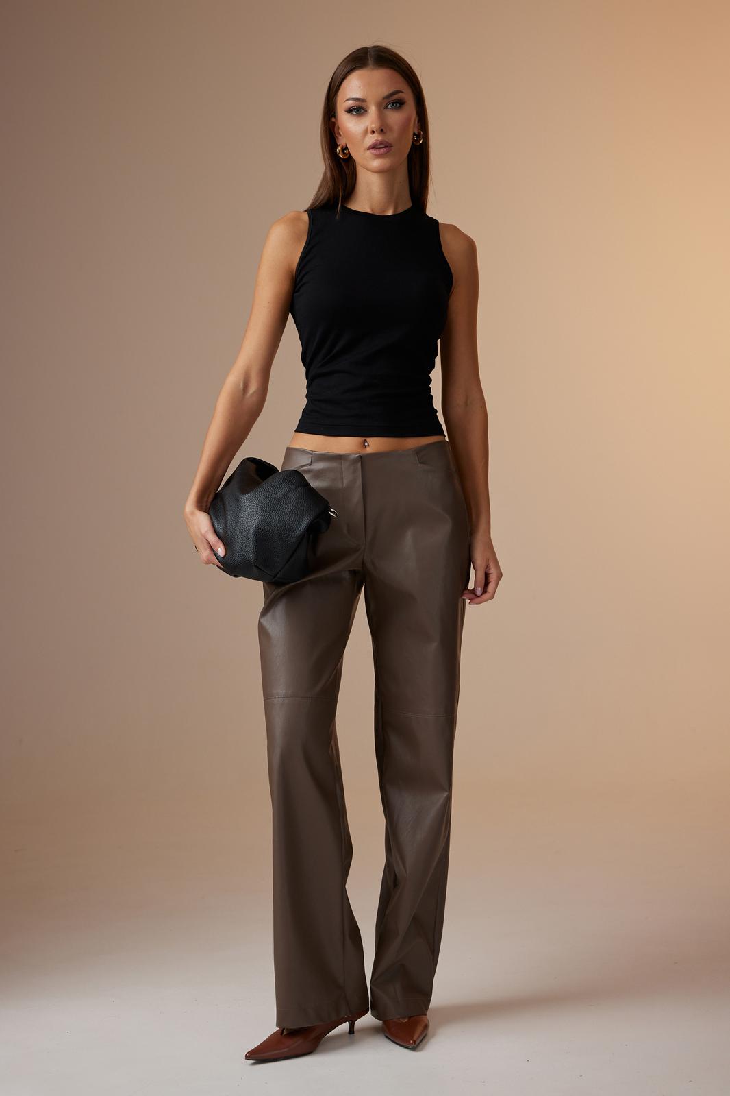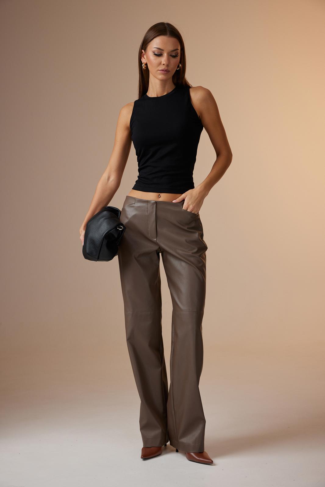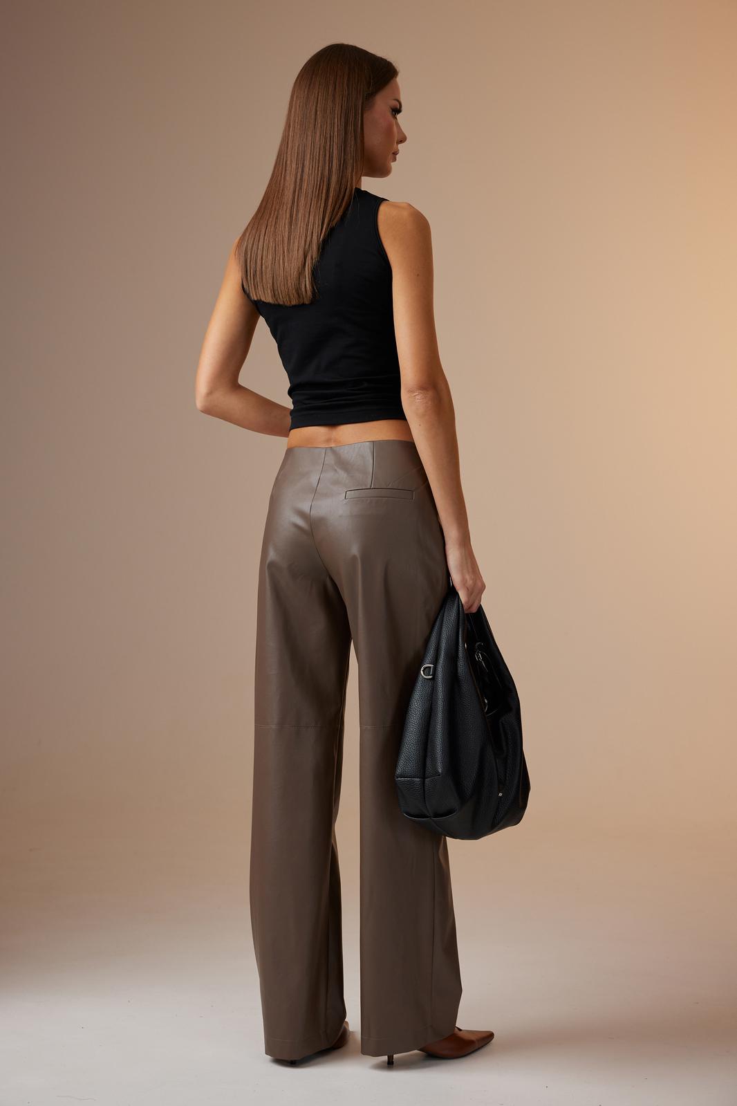 Брюки выполнены из экокожи. Брюки прямого силуэта, с горизонтальными подрезами на уровне колена. Верхний срез брюк обработан обтачками. На передних половинках выполнены карманы виде фигурных подрезов. На правой задней половинке выполнен прорезной карман с листочкой (имитация). Застежка на тесьму-молнию и маленькую кнопку.