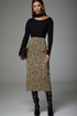 Джемпер выполнен из трикотажного полотна, полуприлегающего силуэта, покроя спущенное плечо. Горловина стойка с капелькой на одно плечо. Рукава длинные, одношовные.