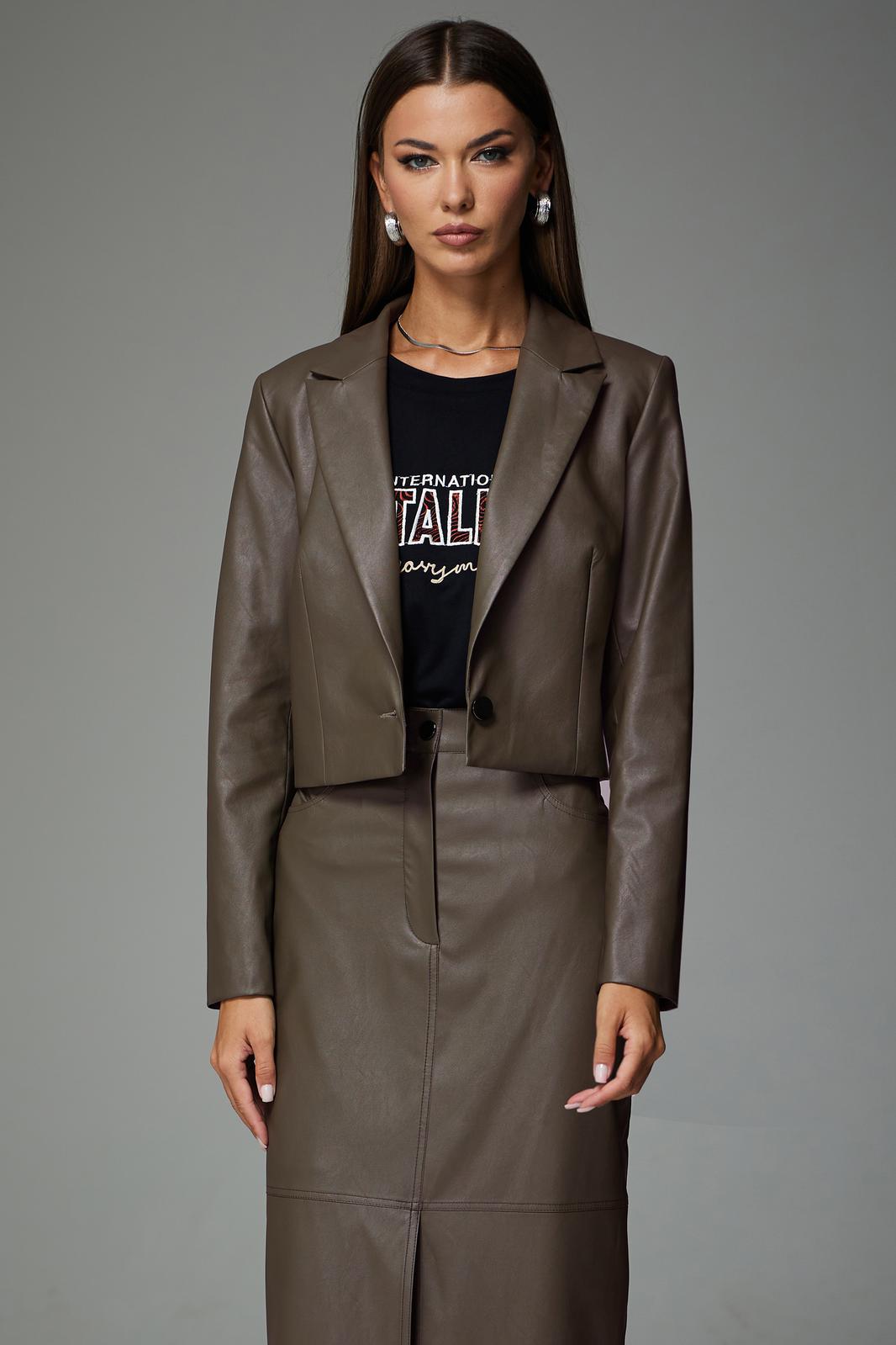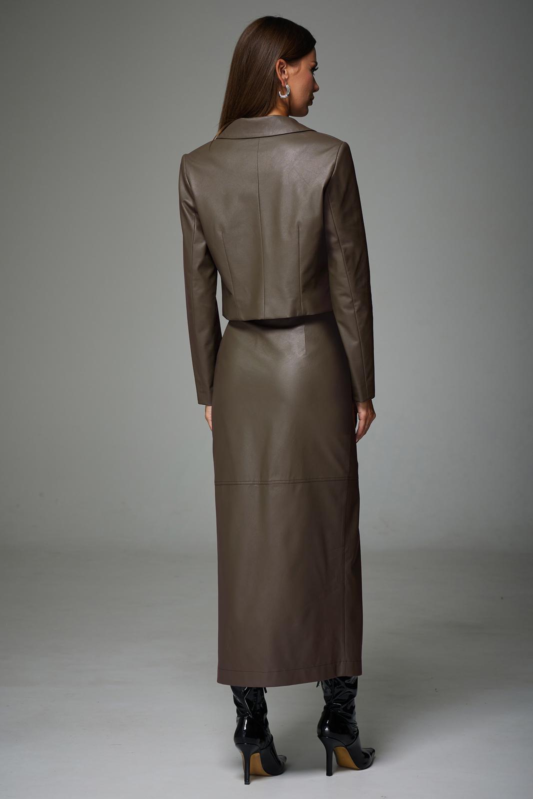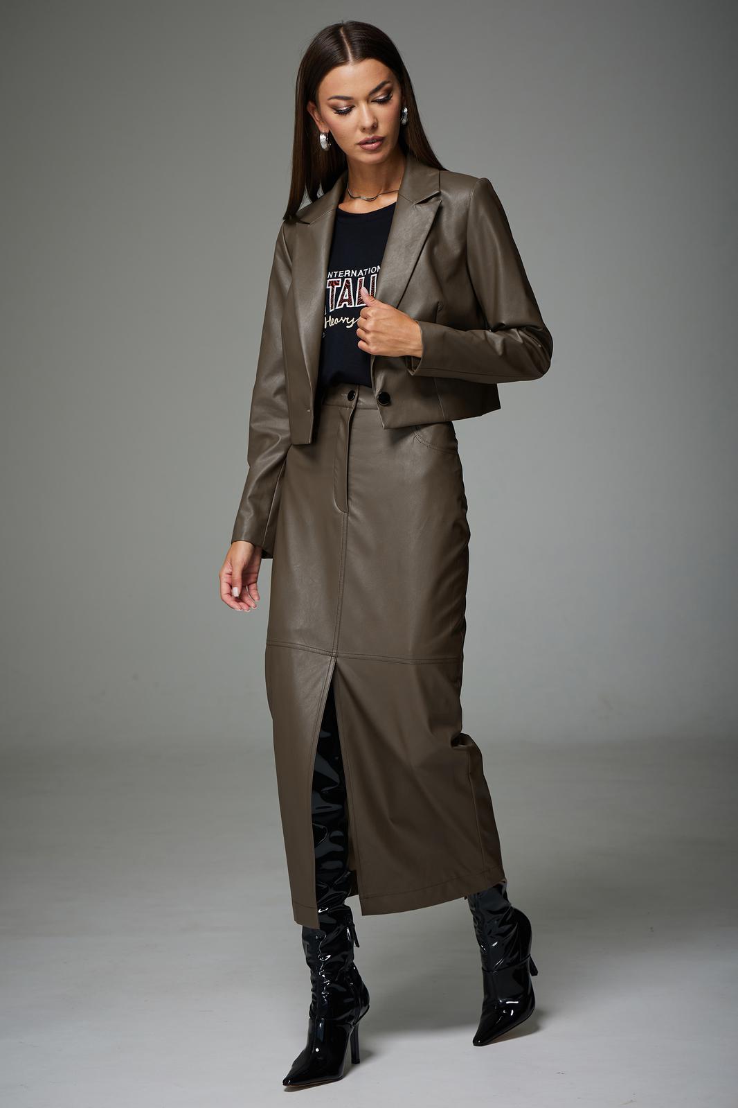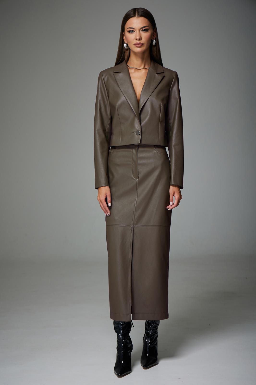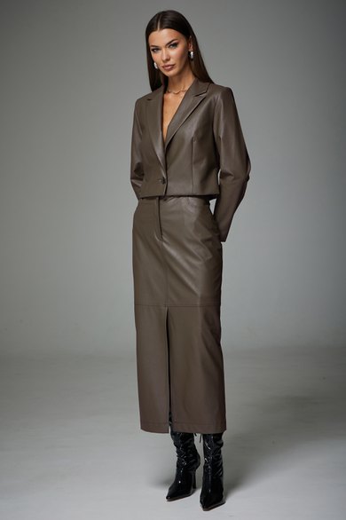 Комплект состоящий из жакета и юбки. Полуприлегающего силуэта, втачного покроя. Выполнен из экокожи на подкладке. Жакет укорочен, закрывает линию талии. Рукав двухшовный, длинный. Горловина обработана воротником пиджачного типа. По переду расположены нагрудные вытачки. Спинка со средним швом и талевыми вытачками. Жакет к низу заужен.