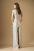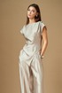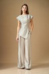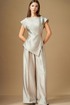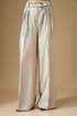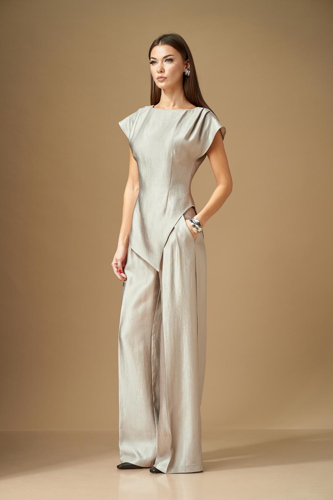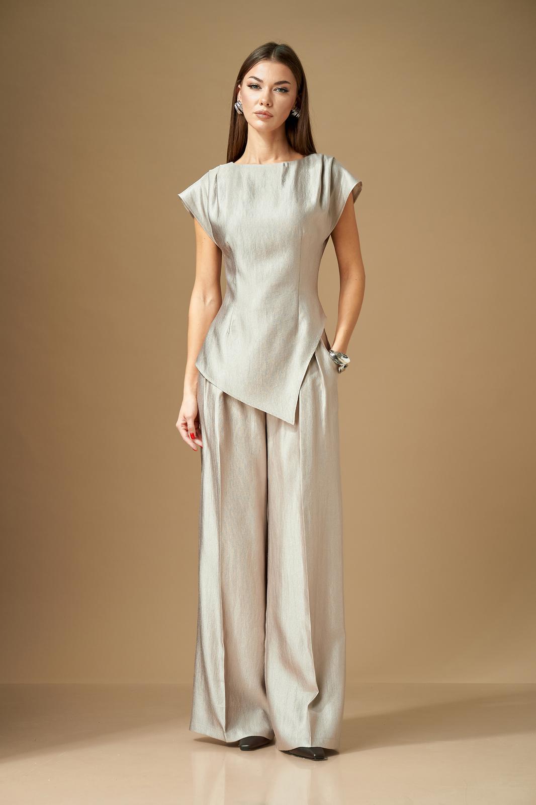 Брюки свободной формы с манжетами, слегка расширены книзу. Верхний срез оформлен цельнокроеным поясом. В боковых швах передних половинках расположены наклонные карманы. В брюках заутюжены стрелки. На передних половинках расположены складки, направленные к боковому шву, на задней правой половинке расположена «имитация» кармана в рамку с пуговицей, а так же талиевые вытачки. На передних половинках застежка на гульфик.