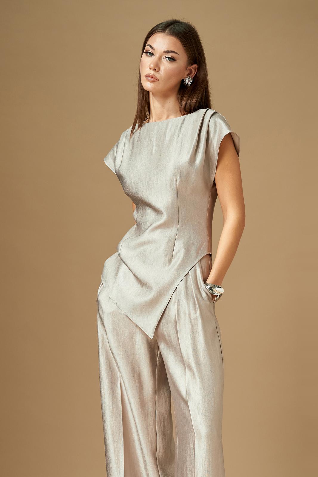 Блуза: приталенного силуэта, со спущенным плечом. В плечевых швах по переду две складки. По переду и спинке талиевые вытачки. Низ изделия имеет фигурную, ассиметричную форму. По спинке средний шов, в который вставлена потайная молния.
