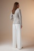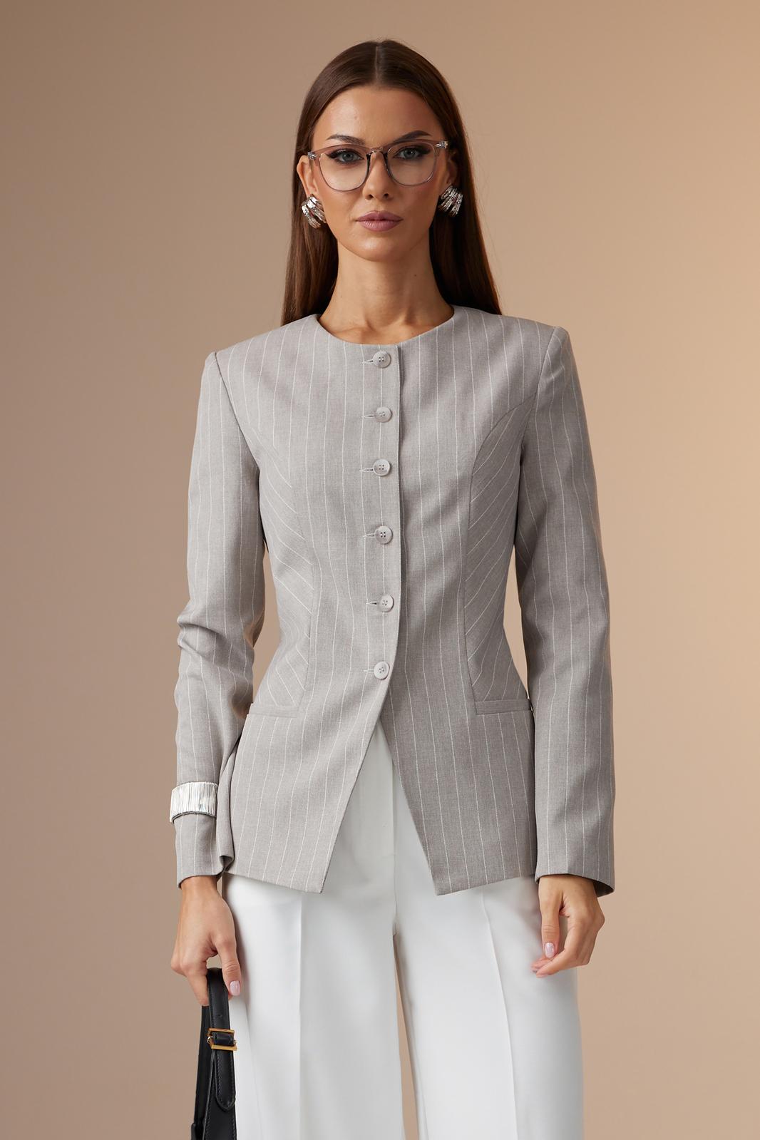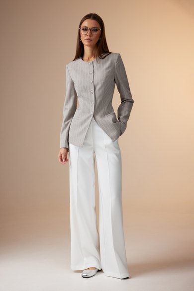 Комплект женский состоит из жакета и брюк. Жакет выполнен из костюмной ткани в полоску, а брюки – из светлой, однотонной ткани.