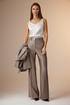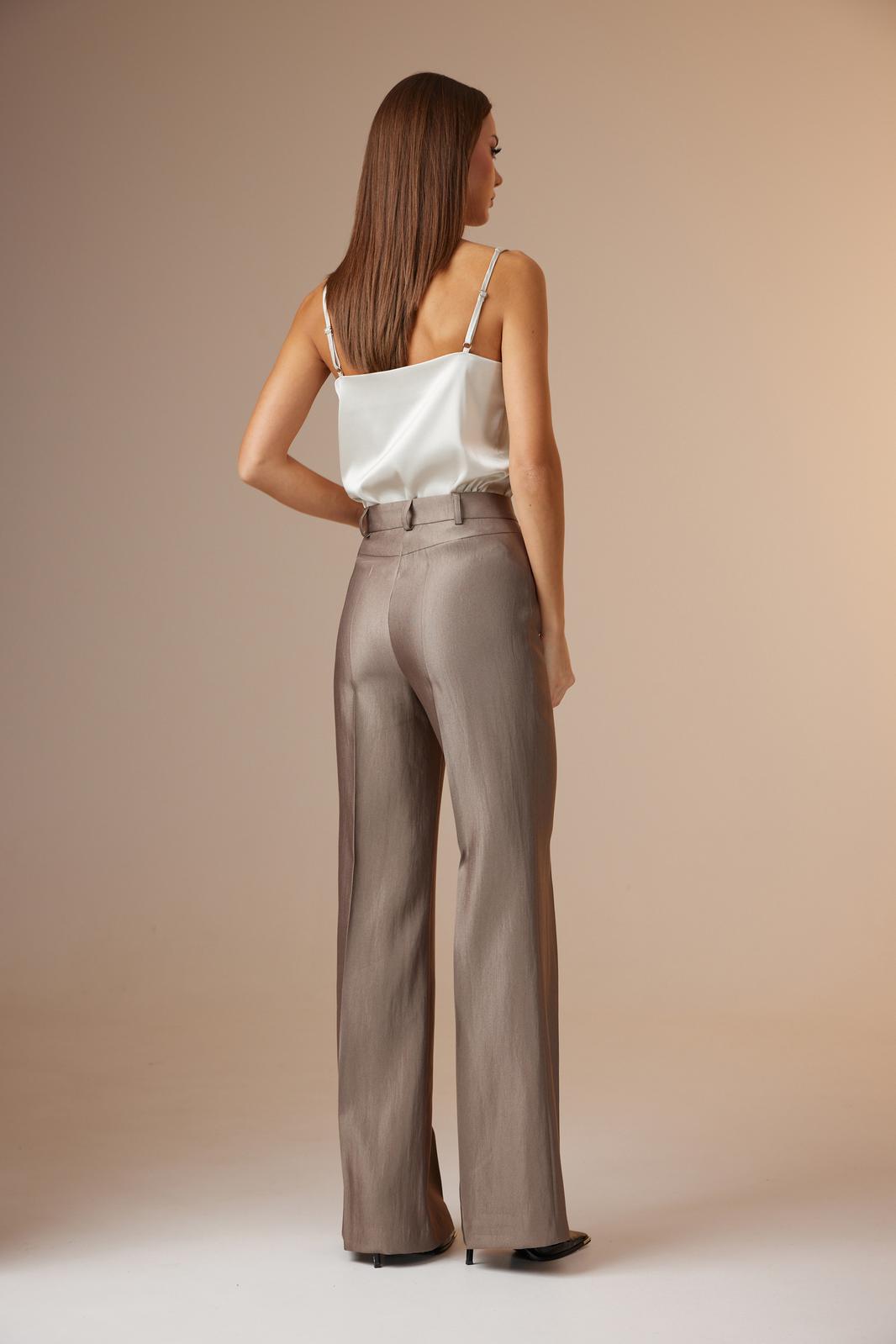 Брюки: слегка расширены к низу от уровня колена. Верхний срез брюк обработан поясом со шлевками. В боковых швах карманы округлой формы. На задних половинках – отрезная кокетка. На передней и задней половине отстроченные стрелки.