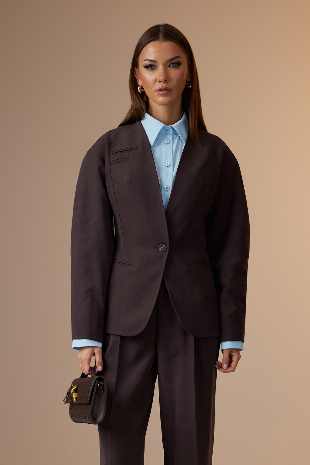 Жакет: прилегающего силуэта со спущенным плечом, с центрально-бортовой застежкой на одну пуговицу в области талии. Горловина У-образной формы с расходящимся закругленным краем борта внизу. По переду рельеф от плеча, переходящий в подрез, в котором выполнены карманы в рамку. На правой центральной части сверху выполнена два кармана в рамку разной длины (имитация). Спинка со средним швом и двумя рельефами от плеча. Рукав длинный, двухшовный, снизу с вытачкой, для увеличения объема рукава в верхней части. Жакет на подкладке.