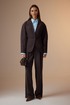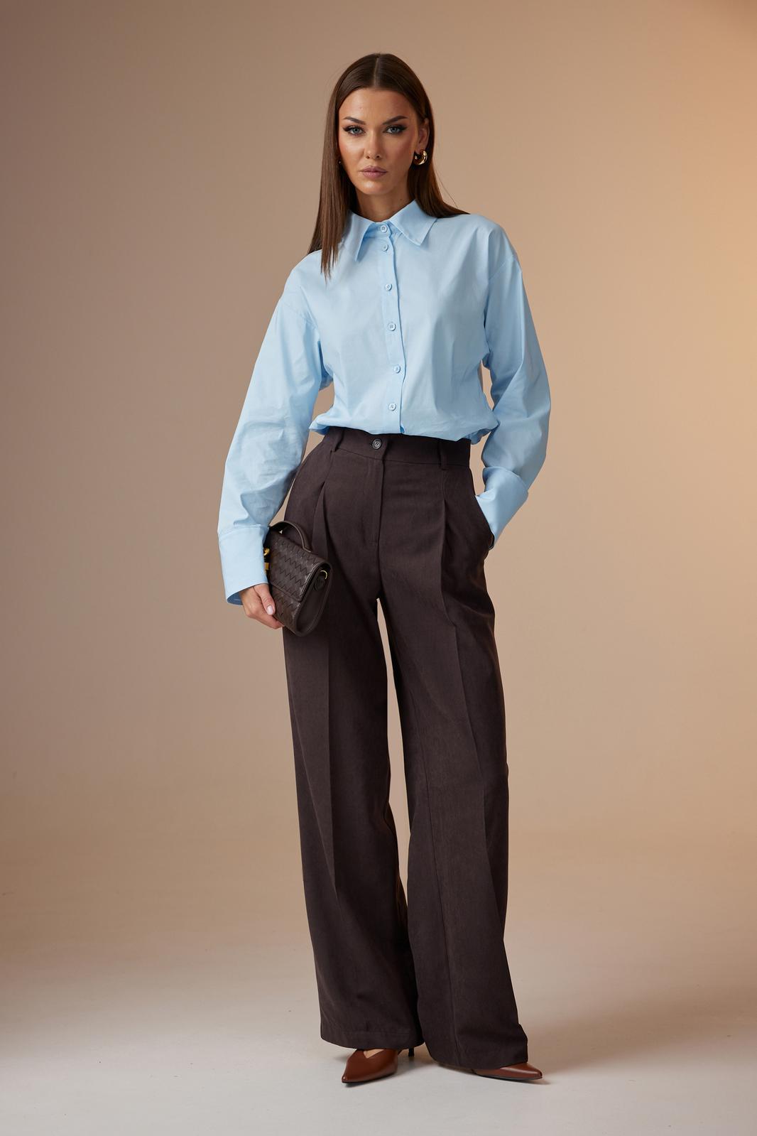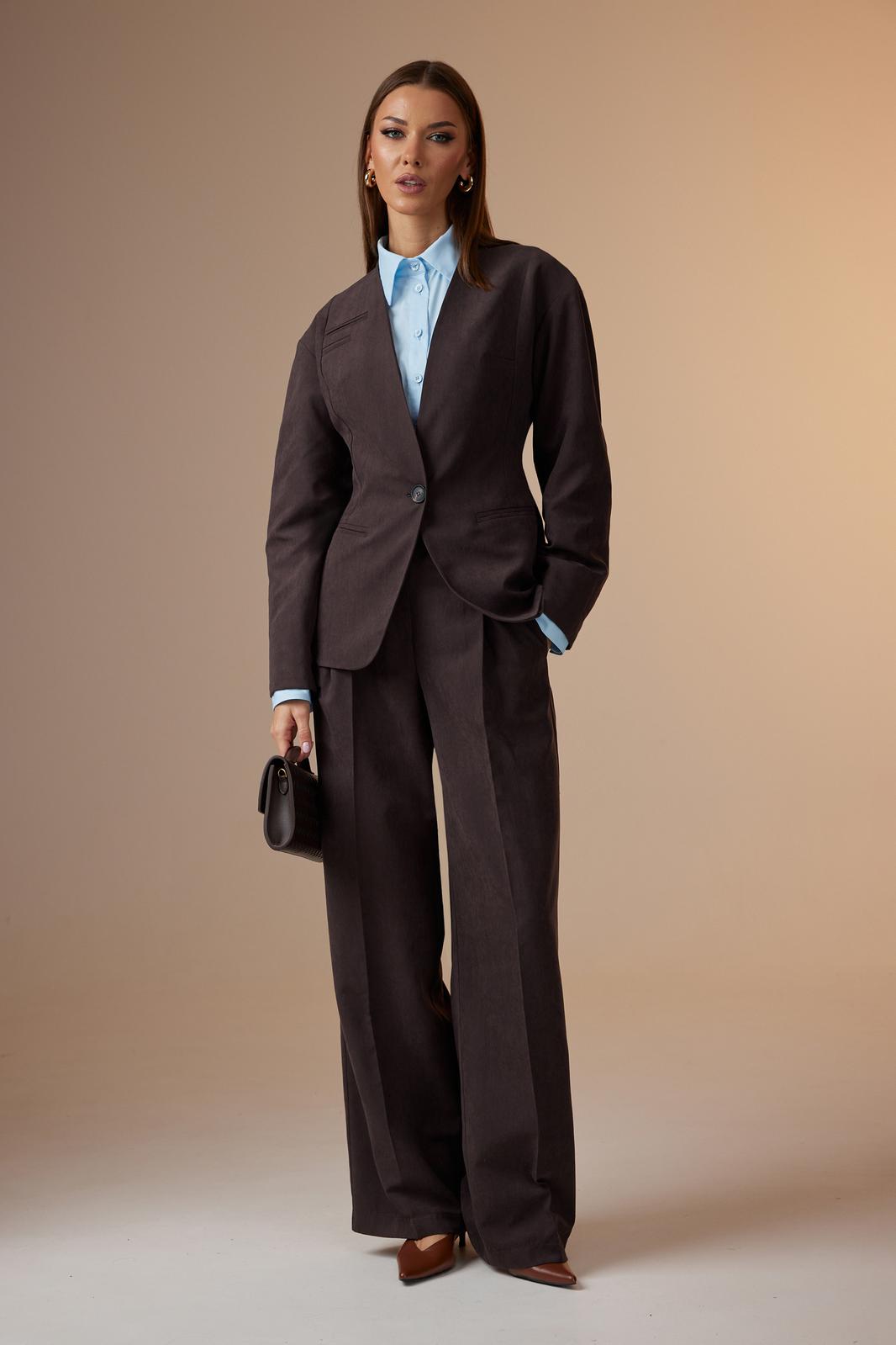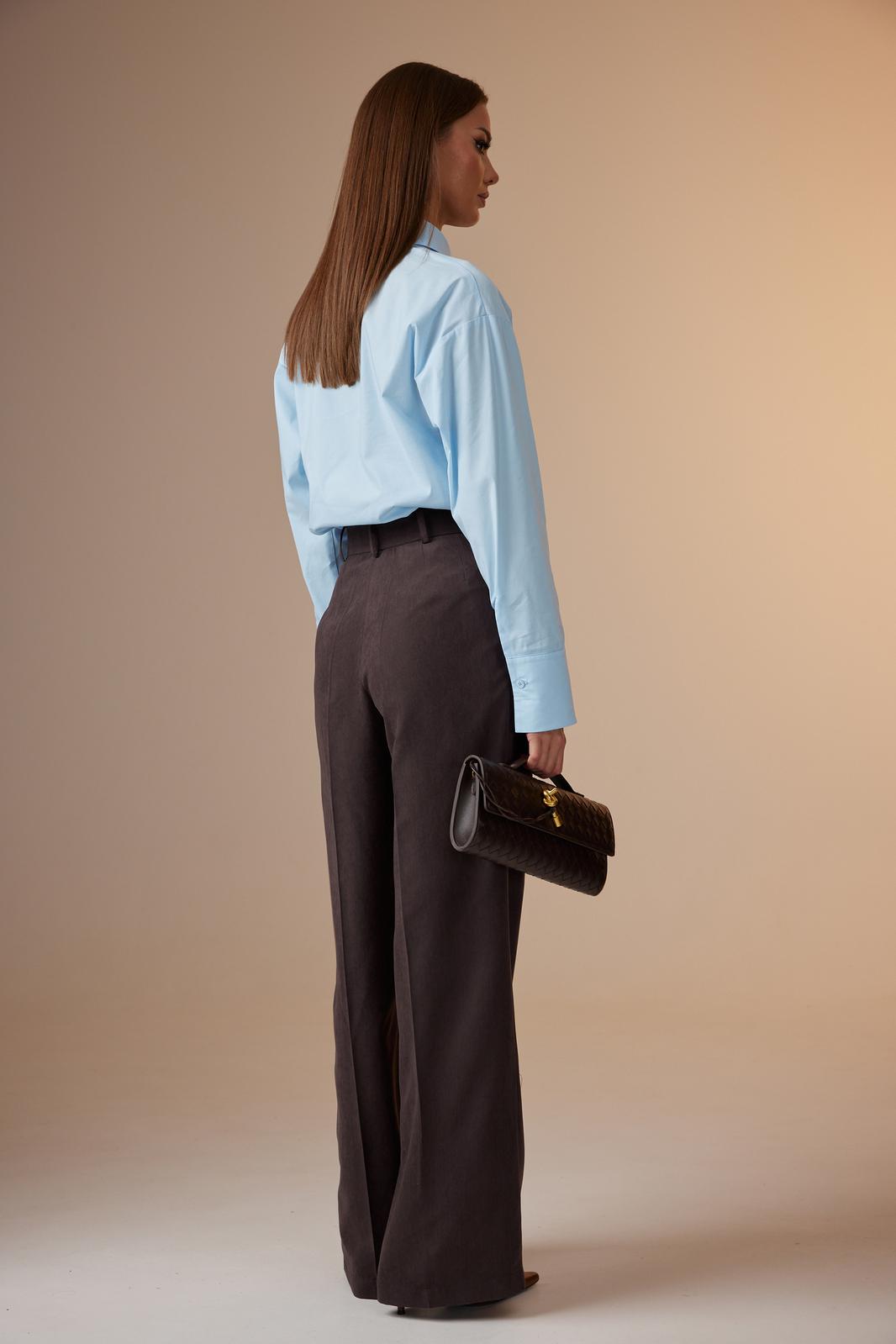 Брюки: расширенного силуэта, со стрелками, с притачным поясом, застегивающимся на одну пуговицу. На поясе расположены шлевки. Застежка брюк с гульфиком на тесьму-молнию. Брюки с наклонными карманами к боковому шву. Передняя половина брюк с одной направленной складкой. На задних половинах брюк расположены талевые вытачки.