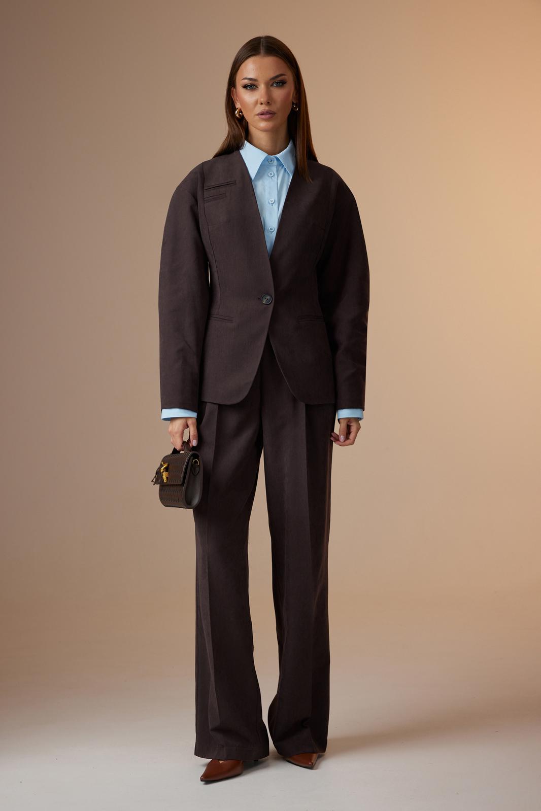 - Тип ткани: Жакет, брюки – полиэстер 85%, нейлон 15%; Блуза – хлопок 96%, эластан 4%