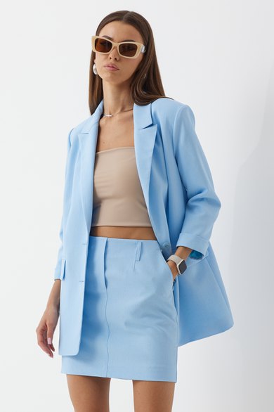 Жакет частично на подкладке, втачного покроя, с центрально-бортовой застежкой на две пуговицы. Горловина оформлена воротником пиджачного типа. Рукав ¾ двухшовны й с притачной манжетой по низу. Жакет состоит из переда, спинки и бочка. На переде расположены нагрудные вытачки и прорезные карманы в рамку с клапаном. По низу борта закругленные. Спинка со средним швом. Жакет оверсайз слегка прилегающего силуэта.