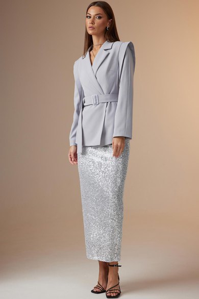 Юбка: длинная, зауженная к низу, с цельнокроенным поясом на резинке. Выполнена из трикотажного полотна с «пайтками». Заднее полотнище юбки со средним швом, в котором расположен разрез выше уровня колена. Изделие на трикотажной подкладке.