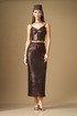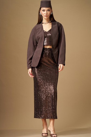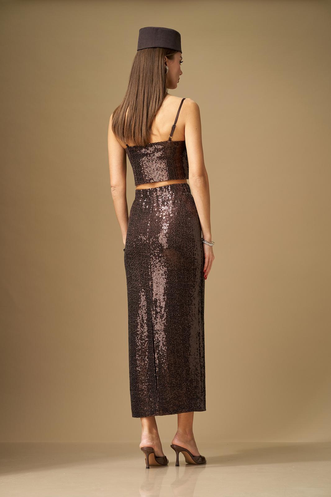 Юбка женская, зауженная книзу, с цельнокроеным поясом, на резинке. Заднее полотнище со средним швом, в котором расположен разрез. Юбка выполнена из ткани с пайетками, на трикотажной подкладке. Юбка длиной «мидакси».