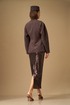 Жакет прилегающего силуэта со спущенным плечом, с центрально-бортовой застежкой на одну пуговицу в области талии. Горловина У-образной формы с расходящимся закругленным краем борта внизу. По переду рельеф от плеча, переходящий в подрез, в котором выполнены карманы в рамку. На правой центральной части сверху выполнена два кармана в рамку разной длины (имитация) Спинка со средним швом и двумя рельефами от плеча. Рукав длинный, двухшовный, снизу с вытачкой, для увеличения объема рукава в верхней части. Жакет на подкладке.