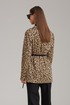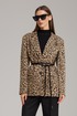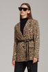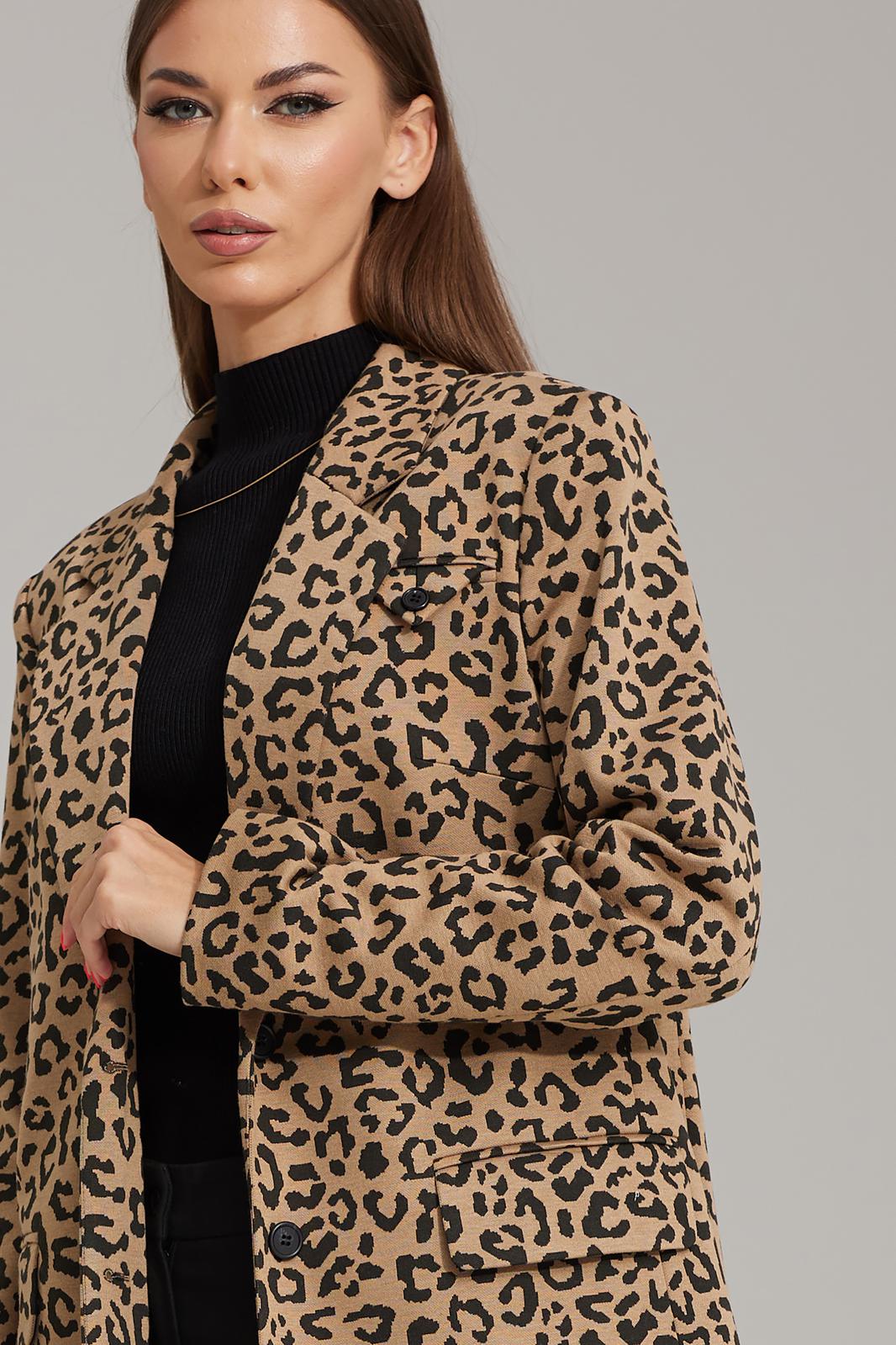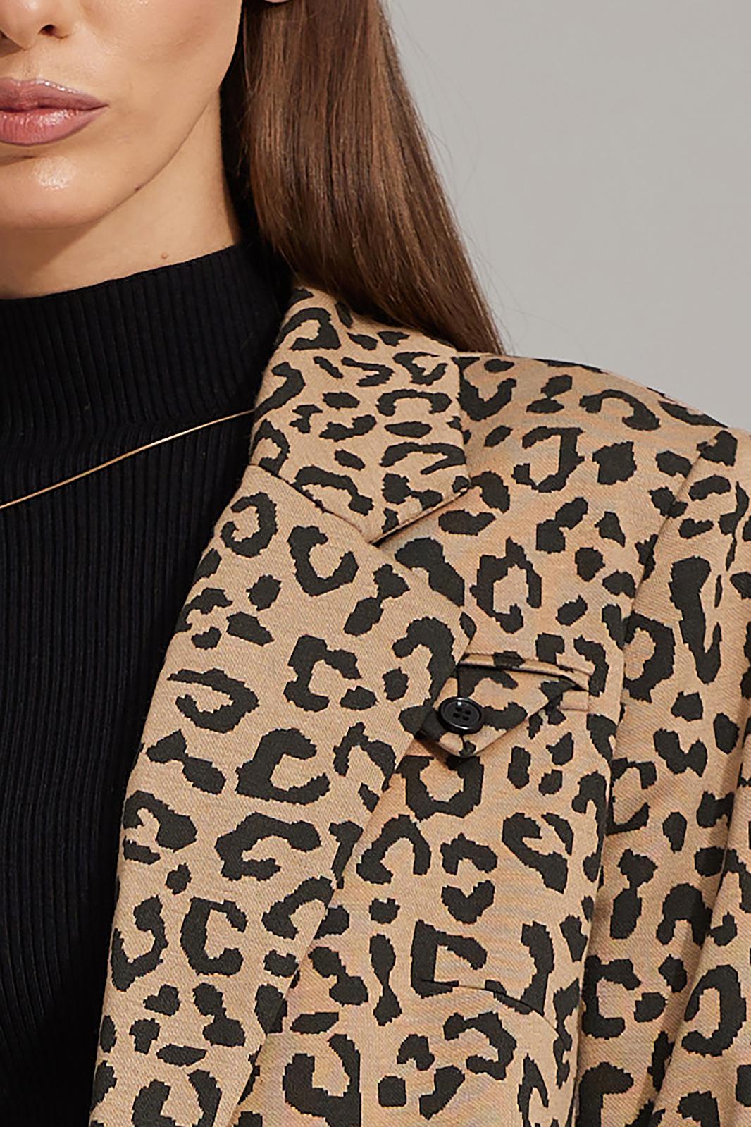 Жакет полуприлегающего силуэта, на подкладке, втачного покроя, по свободе облегания – «оверсайз». Воротник пиджачного типа. Застежка жакета центрально-бортовая, на пуговицы. Рукав двухшовный, полной длины. На переде расположены вертикально направленные карманы с нагрудной вытачкой, а в области бедер – прорезные в рамку с клапаном, в верхней левой части переда расположена имитация кармана в рамку. Клапаны и борта по низу слегка закруглены. Спинка состоит из бочка и центральных частей. К жакету может прилагаться пояс-шнур из декоративных материалов.