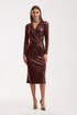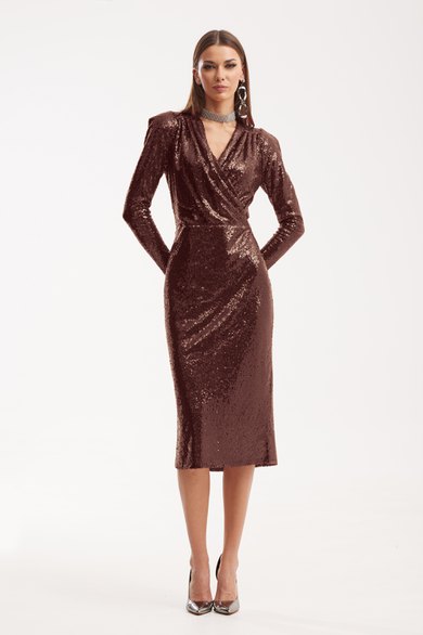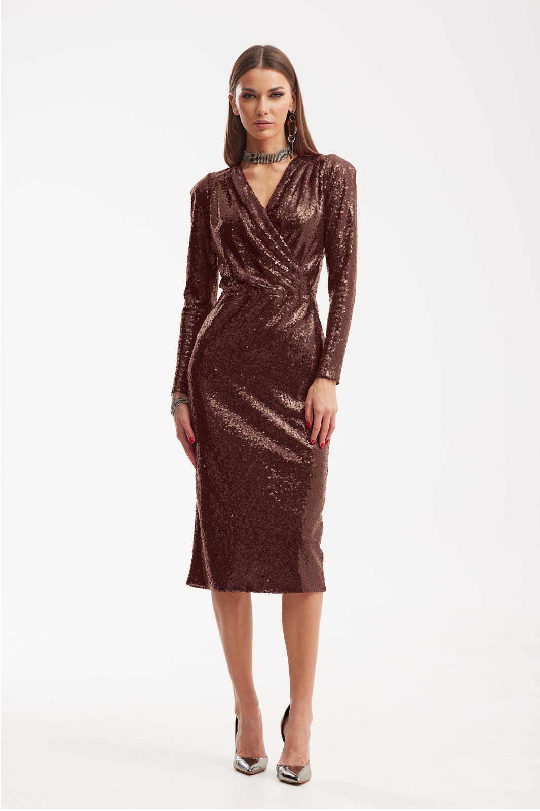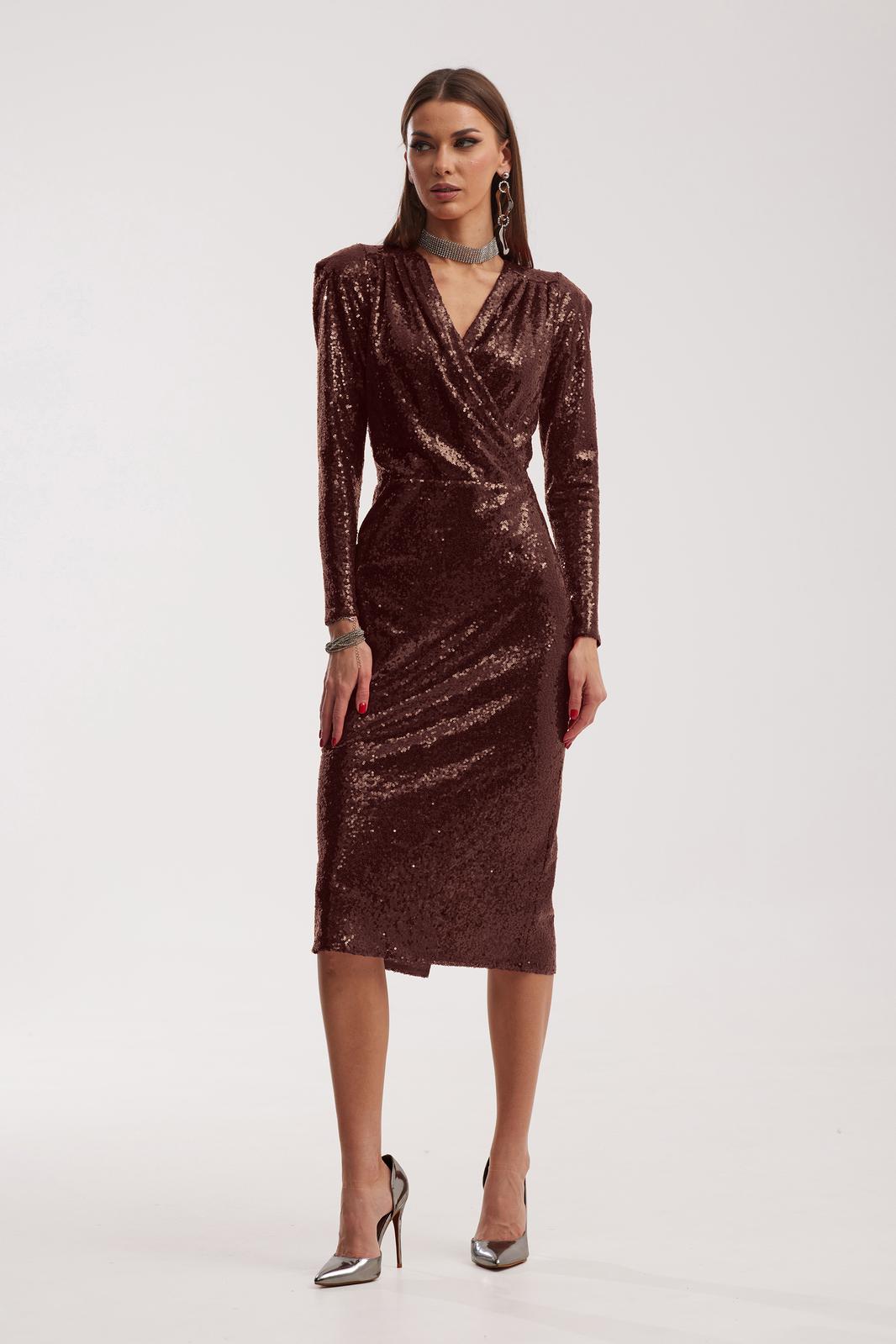 Платье женское полуприлегающего силуэта, втачного покроя, отрезное по линии талии по переду. Платье выполнено из костюмно-плательной ткани «паетки» на трикотажной подкладке. Платье книзу заужено, горловина «V-образной» формы по переду. Рукав одношовный полной длины, с вытачкой по окату, что визуально расширяет линию плеча. Верхняя часть переда состоит из кокетки и лифа со складками, идущими на запах (имитация застежки). На спинке расположены талиевые вытачки и средний шов с разрезом и застежкой на потайную «тесьму-молнию».