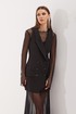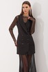Платье-жилет выполнено на подкладке из костюмной ткани, полуприлегающего силуэта, втачного покроя с двубортной застежкой по три пары пуговиц. Горловина оформлена воротником пиджачного типа. В области бедер расположены прорезные карманы в рамку с петелькой и пуговицей. Спинка состоит из центральных и боковых частей. По переду расположены бочки и нагрудные вытачки.