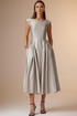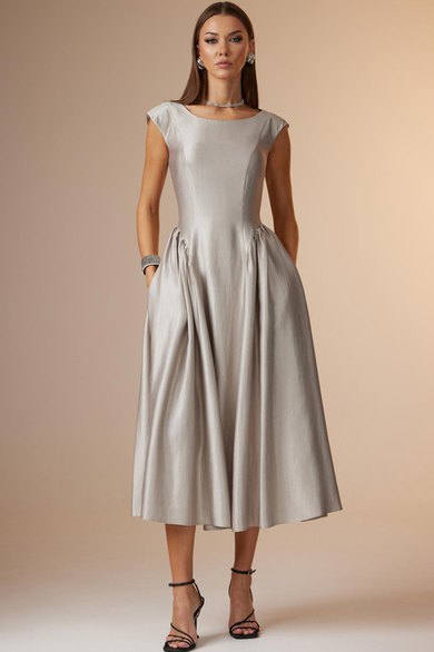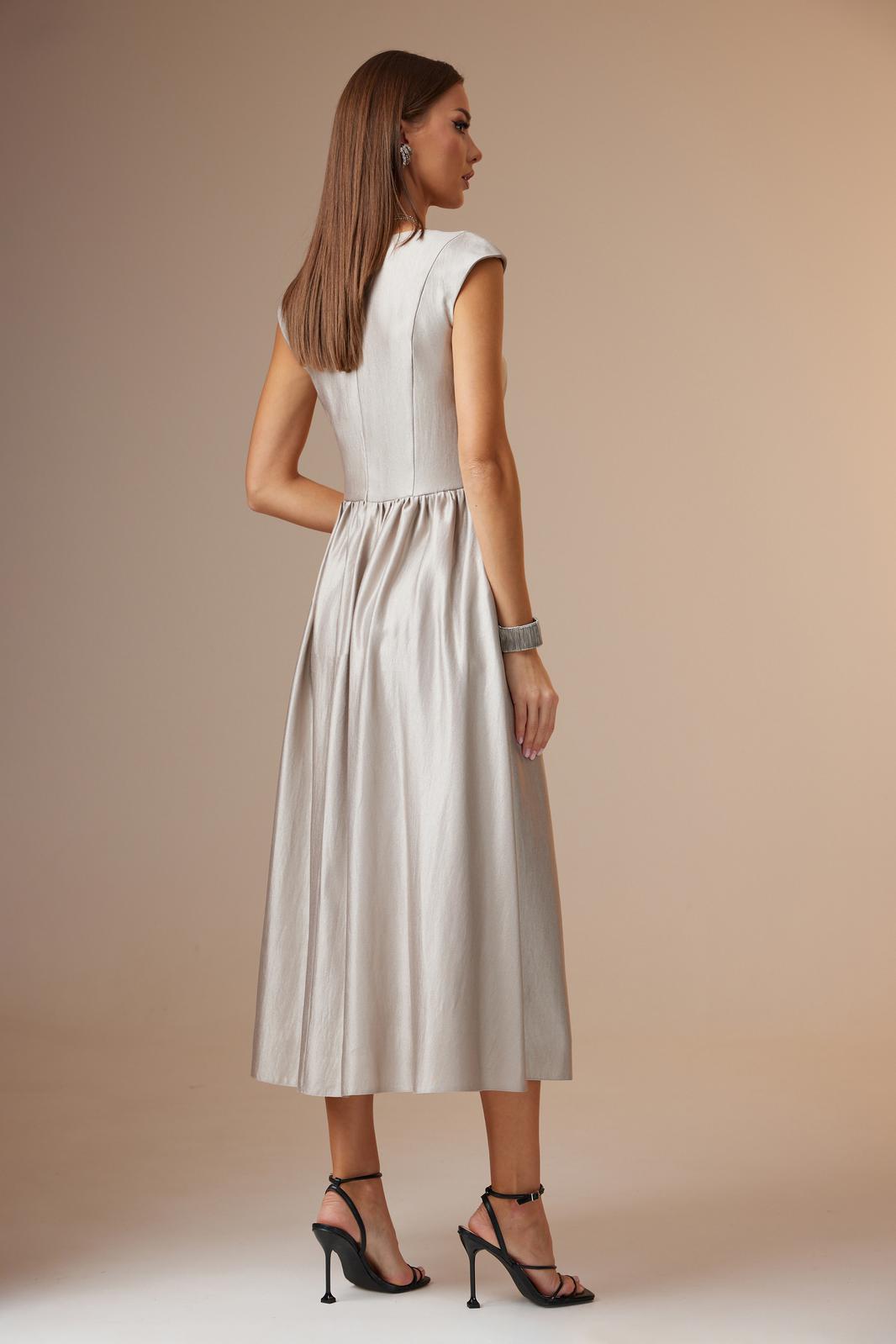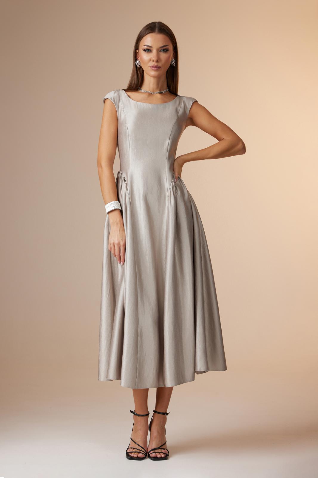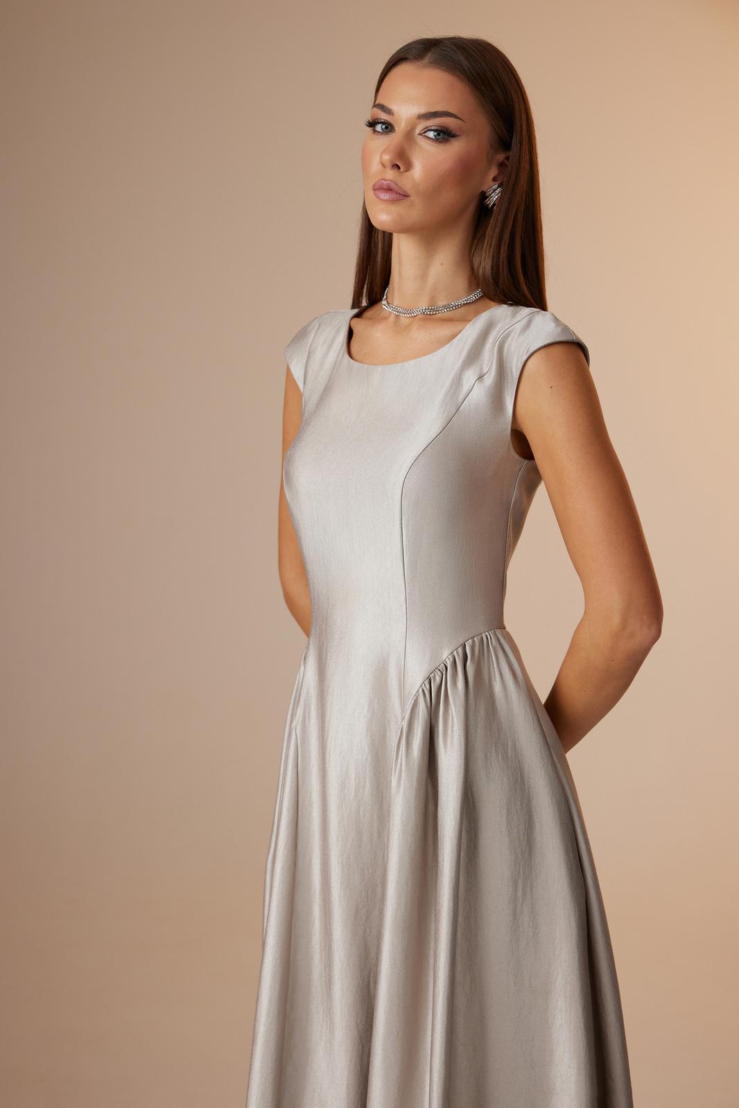 Платье женское, полуприлегающего силуэта. Платье отрезное по линии талии и по спинке, переходит в фигурный подрез по переду, низ изделия по подрезу собран на сборку. Платье без рукавов, со слегка расширенным плечом и вырезом. Верхняя часть спинки с рельефами от плеча и средним швом сверху до низа, в который вставлена молния. По переду рельефы через центр груди, до подреза. В боковых швах выполнены карманы.