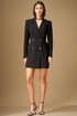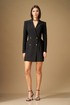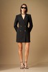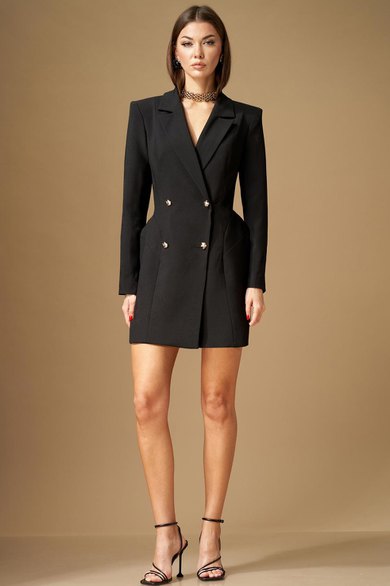 Платье с двубортной застежкой на две пары пуговиц, с фигурным низом. Воротник пиджачного типа. По переду рельеф от плечевого шва, проходящий через центр груди, бочок отрезной из проймы. По спинке средний шов, рельеф от плеча и бочок из проймы. По боковым швам переда и спинки вставлены фигурные подрезы, зрительно расширяющие линию бедер. Рукава втачные, двухшовные, полноценной длины.