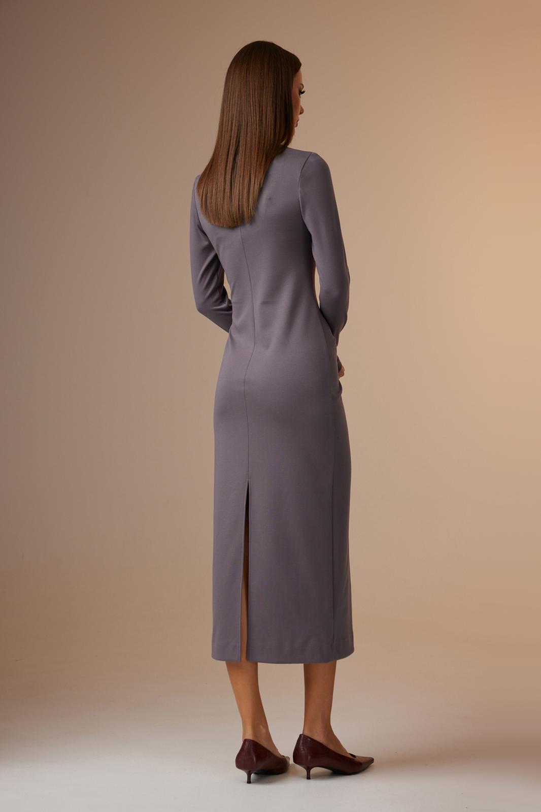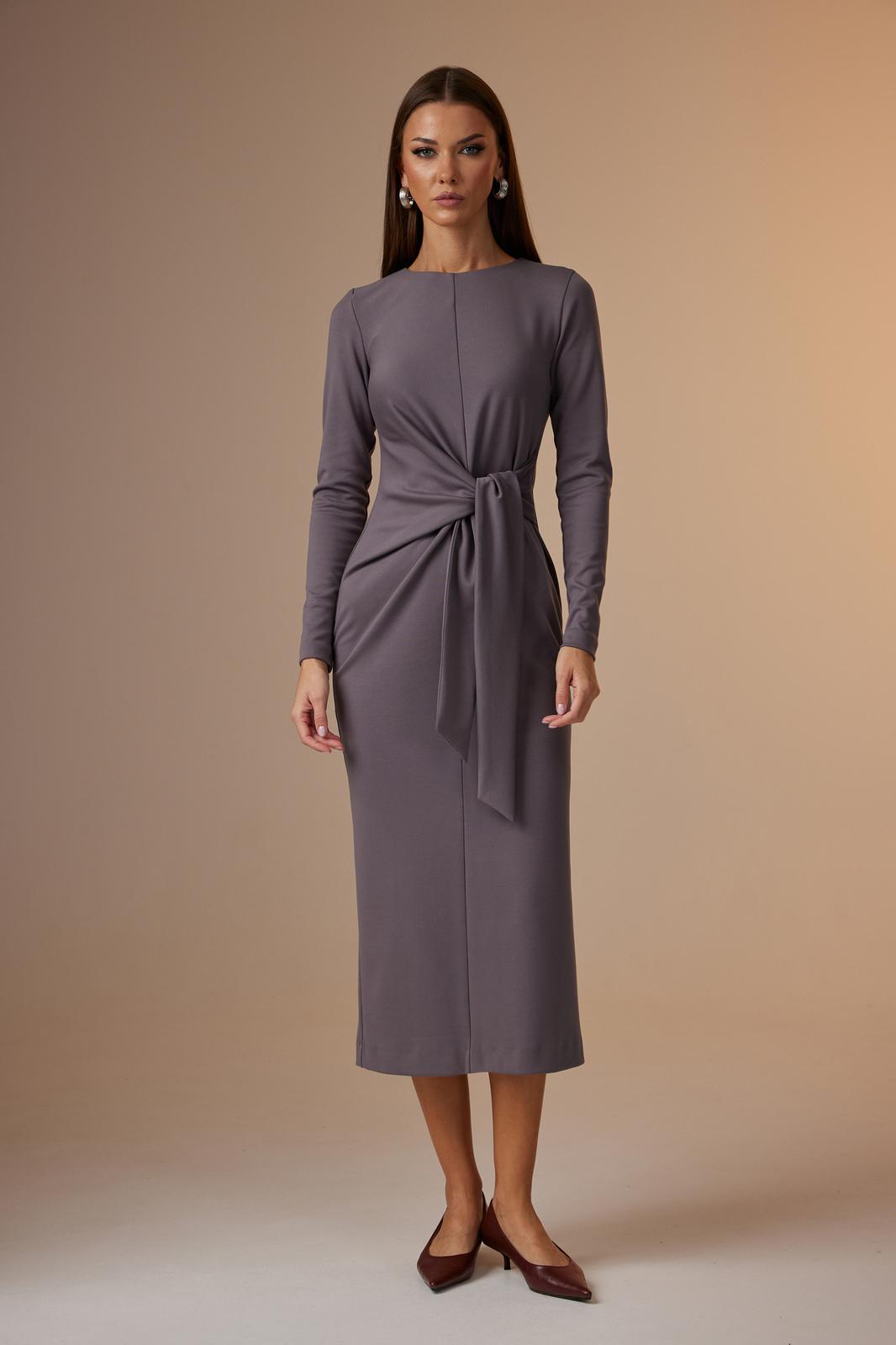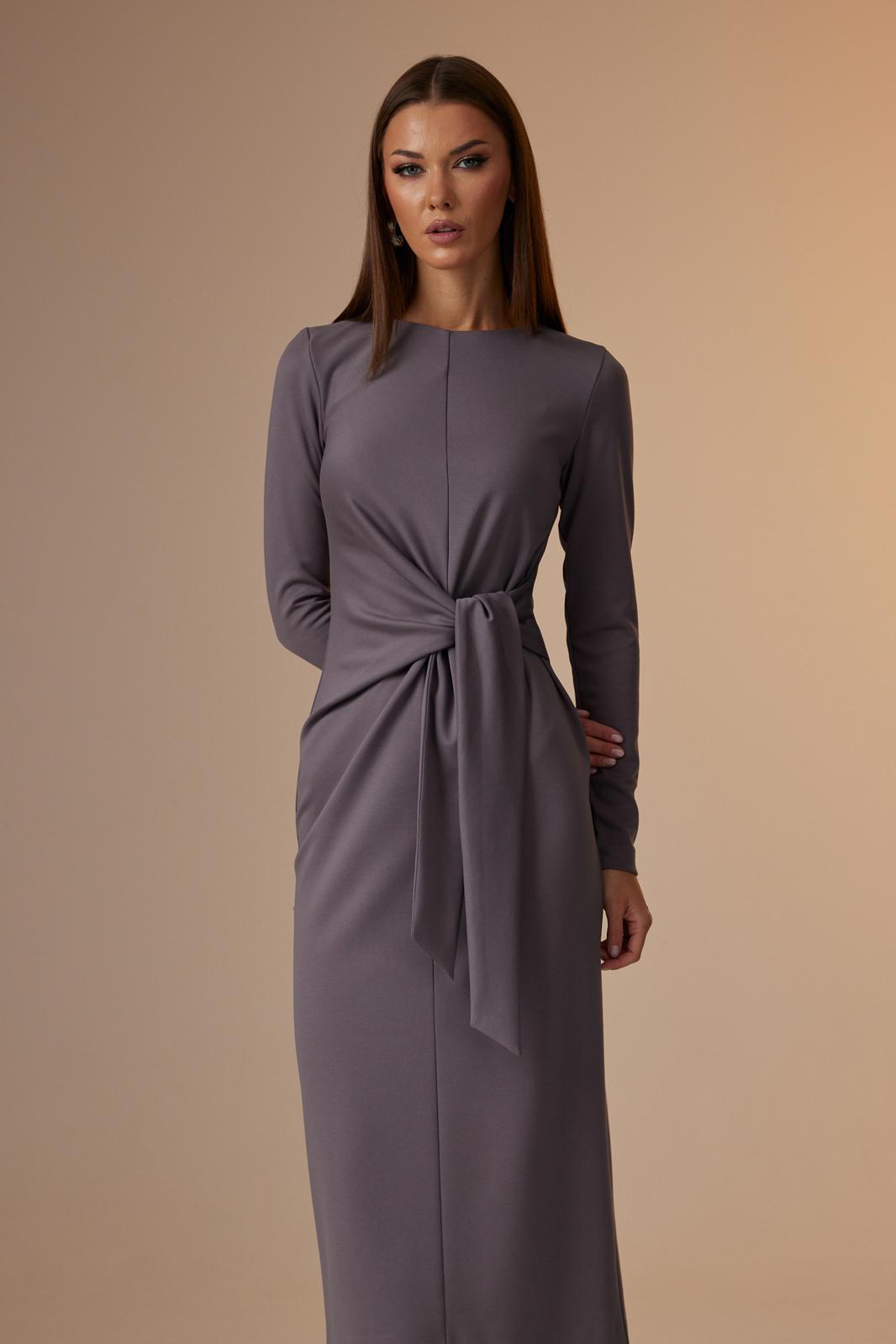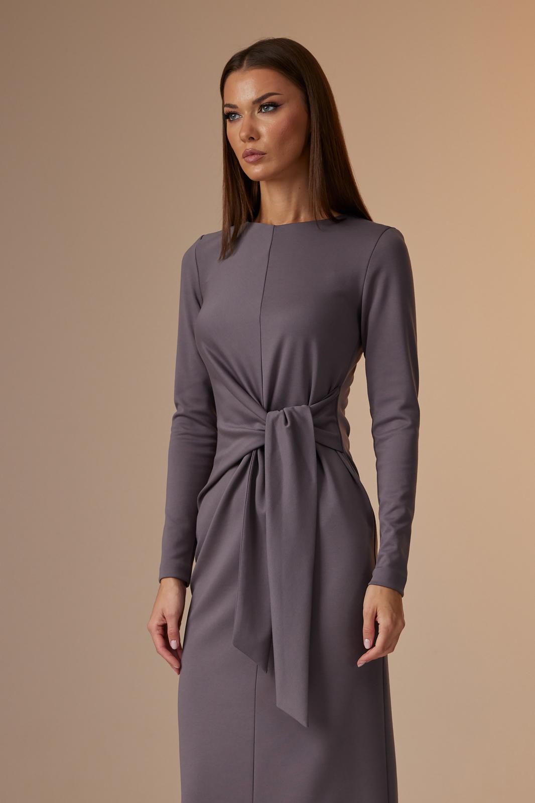 Платье женское, полуприлегающего силуэта. Перед со средним швом и драпировкой в области талии, переходящей в завязывающийся пояс. Горловина округлой формы. Спинка со средним швом, сверху заканчивается разрезом и застежкой на навесную петлю и пуговицу, снизу разрез. Рукав втачной, длинный, зауженный книзу.