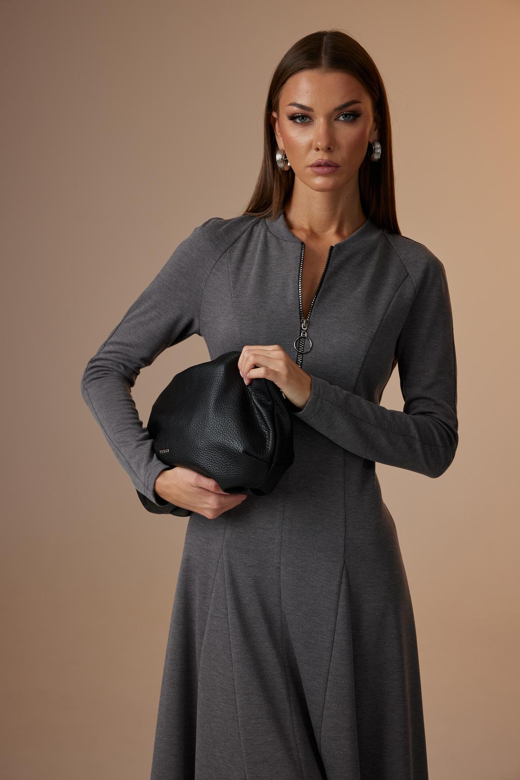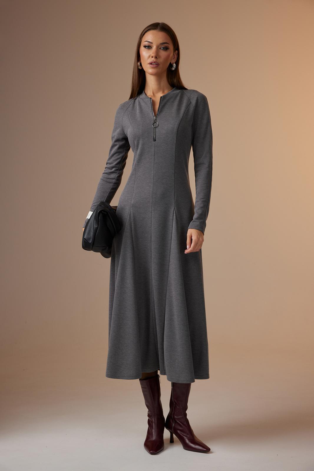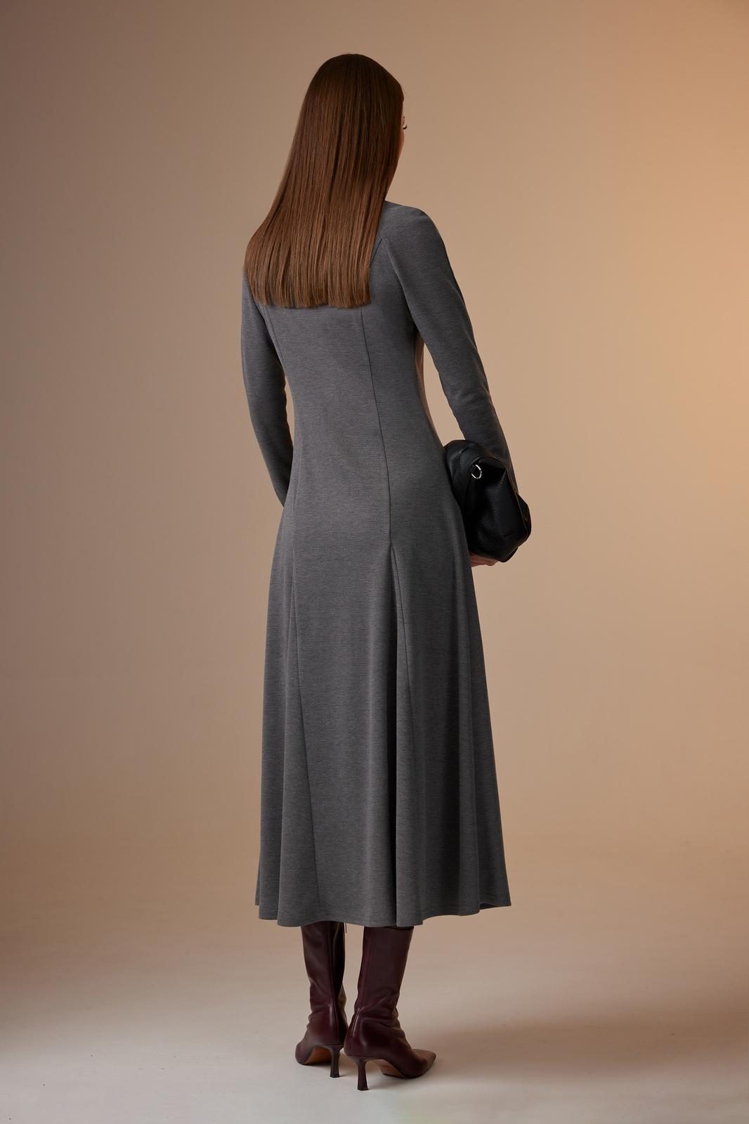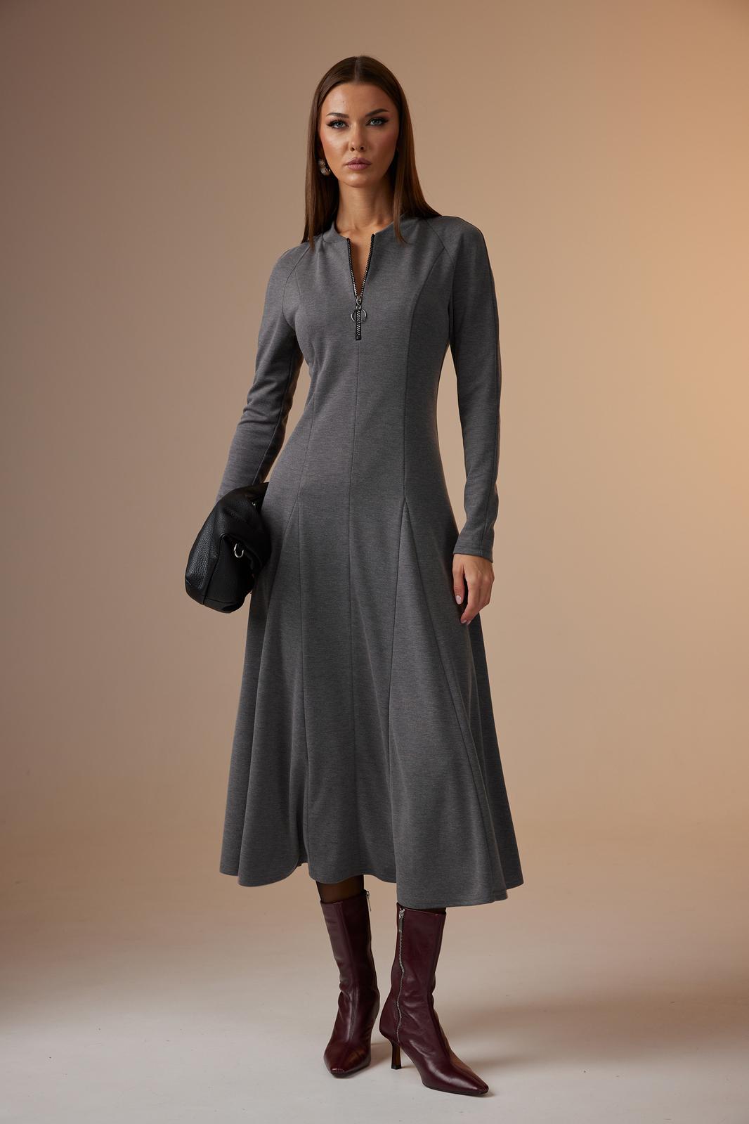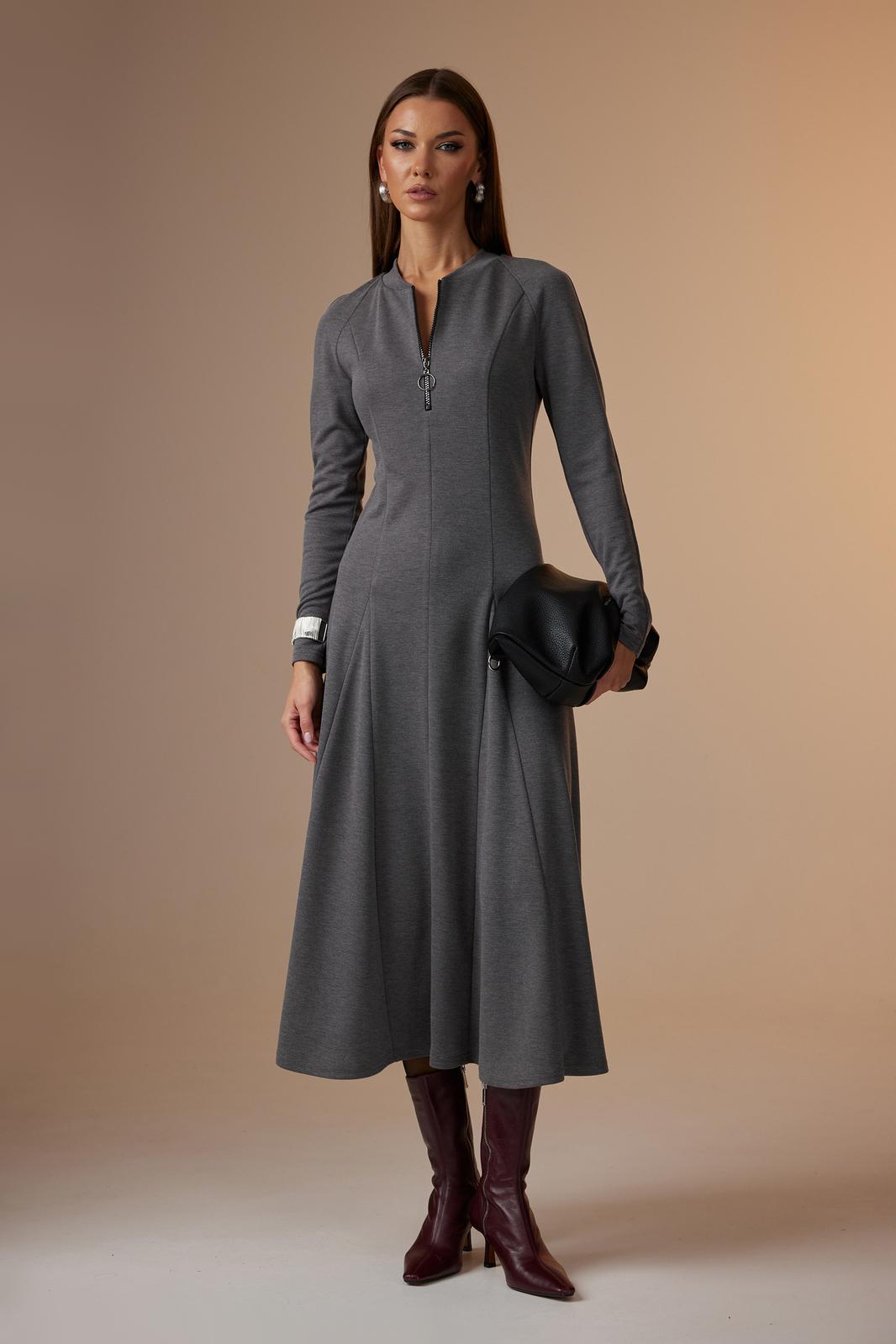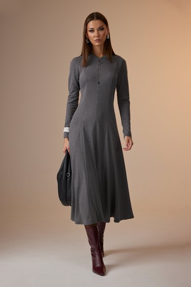 Платье женское полуприлегающего силуэта, с рукавом покроя «реглан». По центру переда – шов, сверху в который вставлена отделочная молния. Так же по переду рельефы, проходящие через центр груди, в них вставлены широкие клинья, создающие драпировку по низу. По горловине пришита бейка из основной ткани. Спинка с двумя рельефами, в которые так же вставлены клинья. Рукав покроя «реглан», длинный, зауженный к низу.