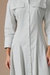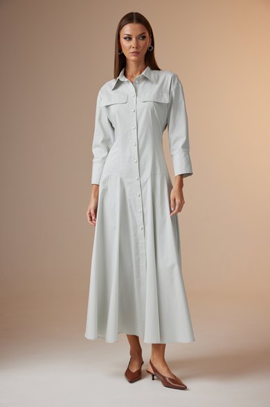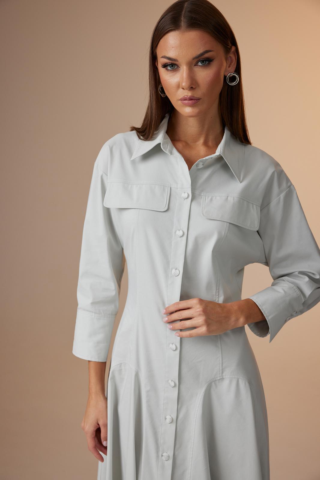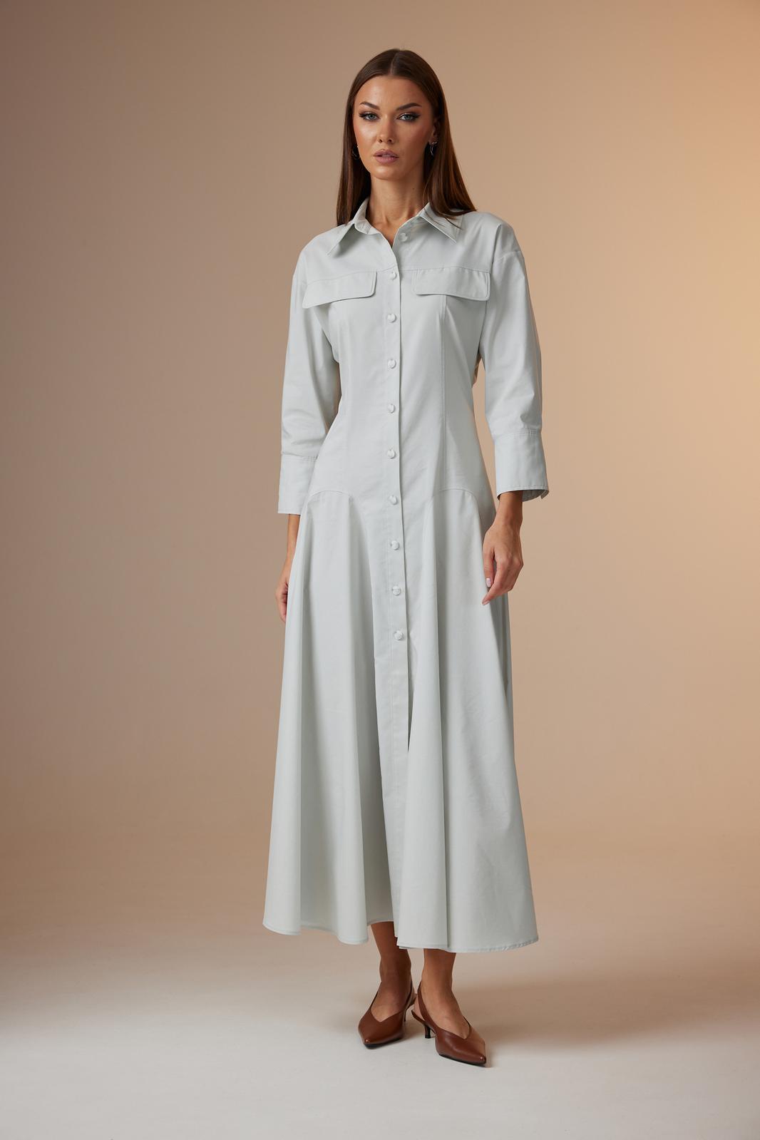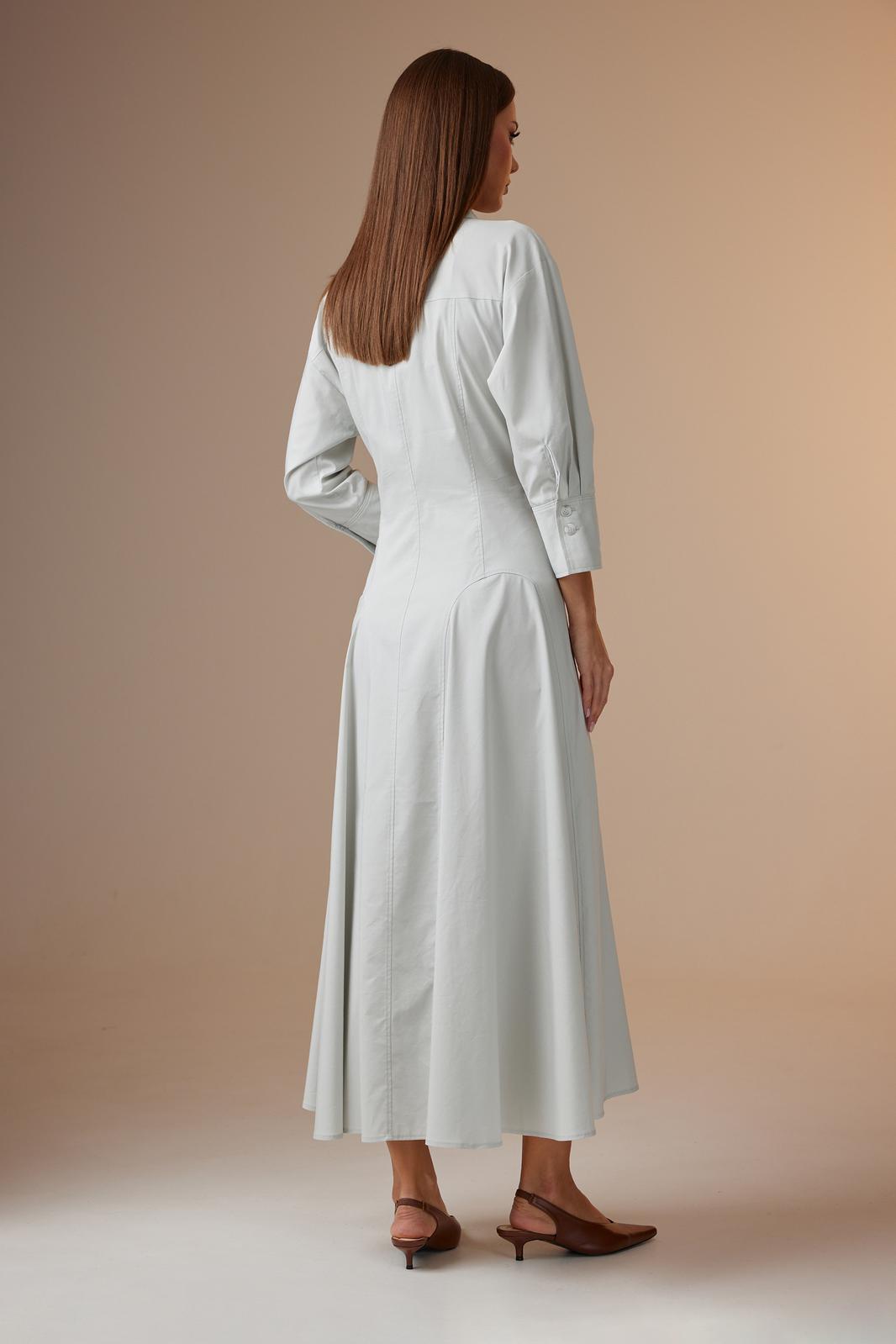 Платье женское полуприлегающего силуэта, длинное, покроя спущенное плечо с центральной бортовой застежкой на петли и пуговицы. Горловина оформлена стояче-отложным воротником с отрезной стойкой. По спинке и переду отрезная кокетка, в которую по переду вставлены клапаны. По спинке средний шов и рельефы. По спинке и переду подрезы круглой формы, в которые вставлены сильно расширенные клинья, которые создают красивые складки по низу изделия. Рукав одношовный, снизу с двумя складками и широкой манжетой, застегивающейся на две пуговицы.