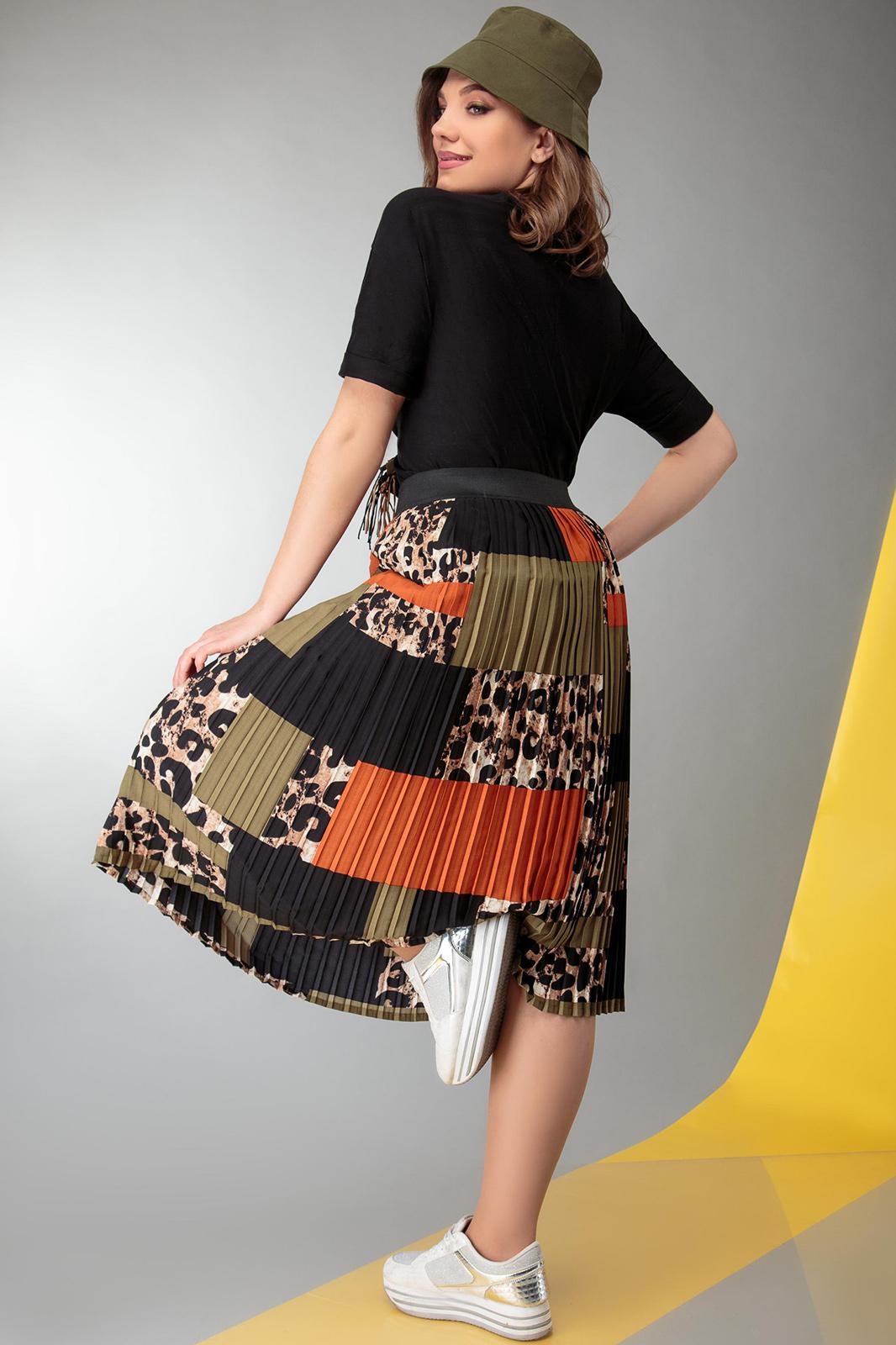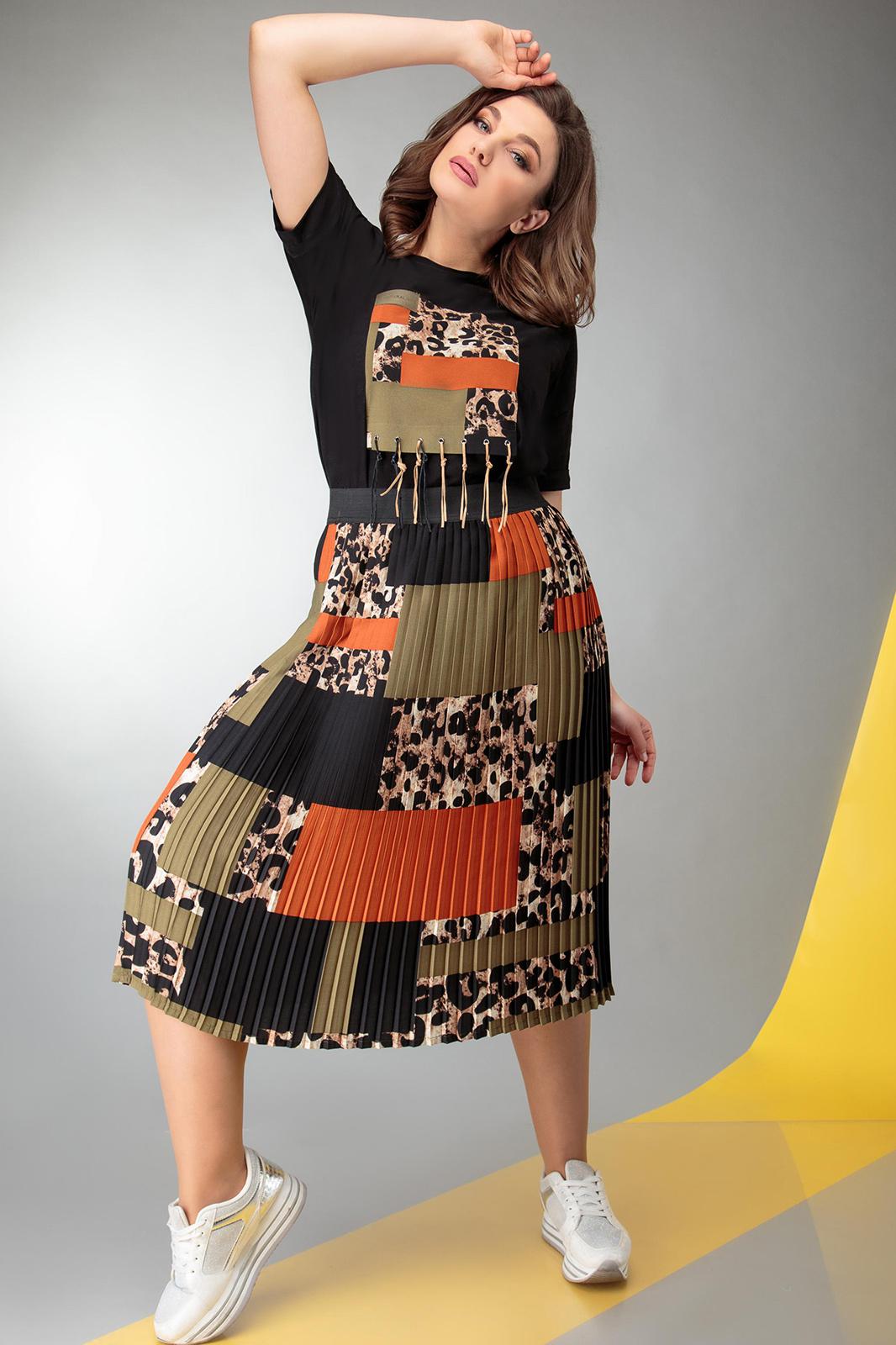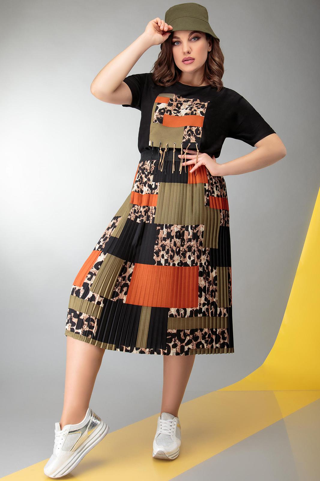 Комплект 2-х предметный. Блуза прямого силуэта со спущенным рукавом , по передней полочки аппликация из отделочной ткани. Юбка плиссе на притачном поясе резинке.