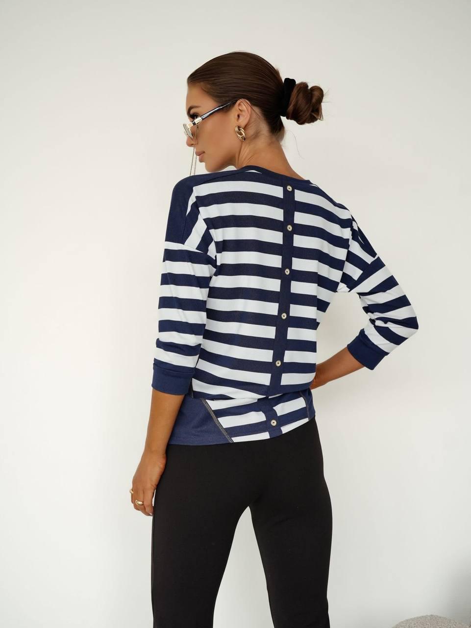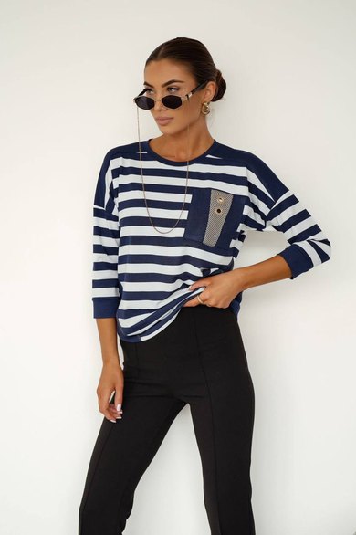 Обратите внимание на таблицу замеров! Блузка женская повседневная выполнена из мягкого польского трикотажа с добавлением вискозы, что делает ее не только стильной, но и комфортной в носке. Прямой силуэт блузки подчеркнет достоинства вашей фигуры. На груди блузка украшена потрясающим сеткой-карманом с люверсами, что придает ей особый шарм. Круглый вырез горловины делает модель универсальной и подходящей для любого случая. Спина в полоску, с декоративными пуговицами на планке по середине спинки, что создает элегантный и захватывающий вид.
