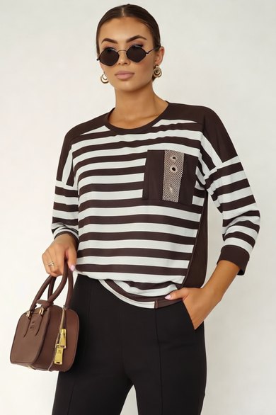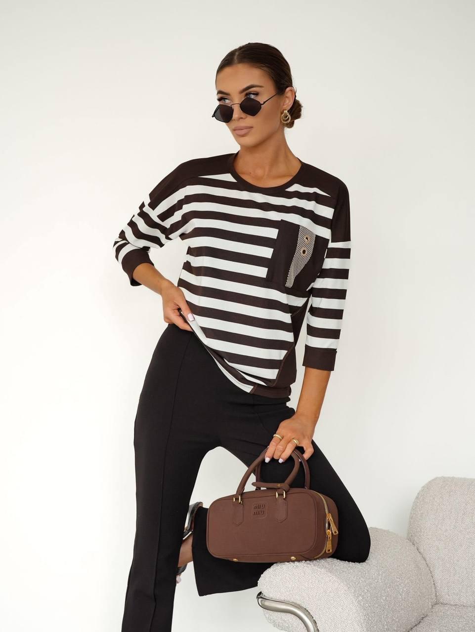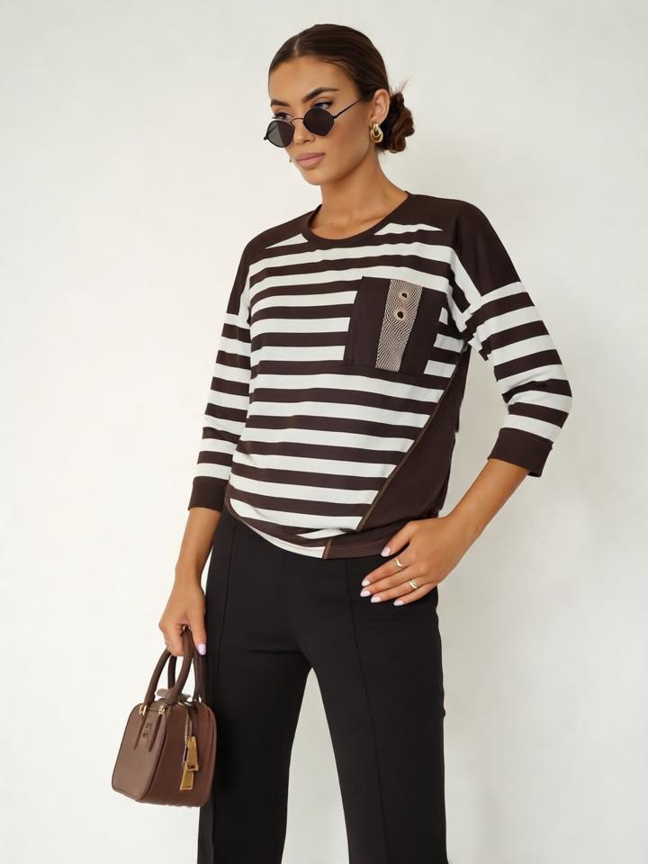 Обратите внимание на таблицу замеров! Блузка женская повседневная выполнена из мягкого польского трикотажа с добавлением вискозы, что делает ее не только стильной, но и комфортной в носке. Прямой силуэт блузки подчеркнет достоинства вашей фигуры. На груди блузка украшена потрясающим сеткой-карманом с люверсами, что придает ей особый шарм. Круглый вырез горловины делает модель универсальной и подходящей для любого случая. Спина в полоску, с декоративными пуговицами на планке по середине спинки, что создает элегантный и захватывающий вид.
