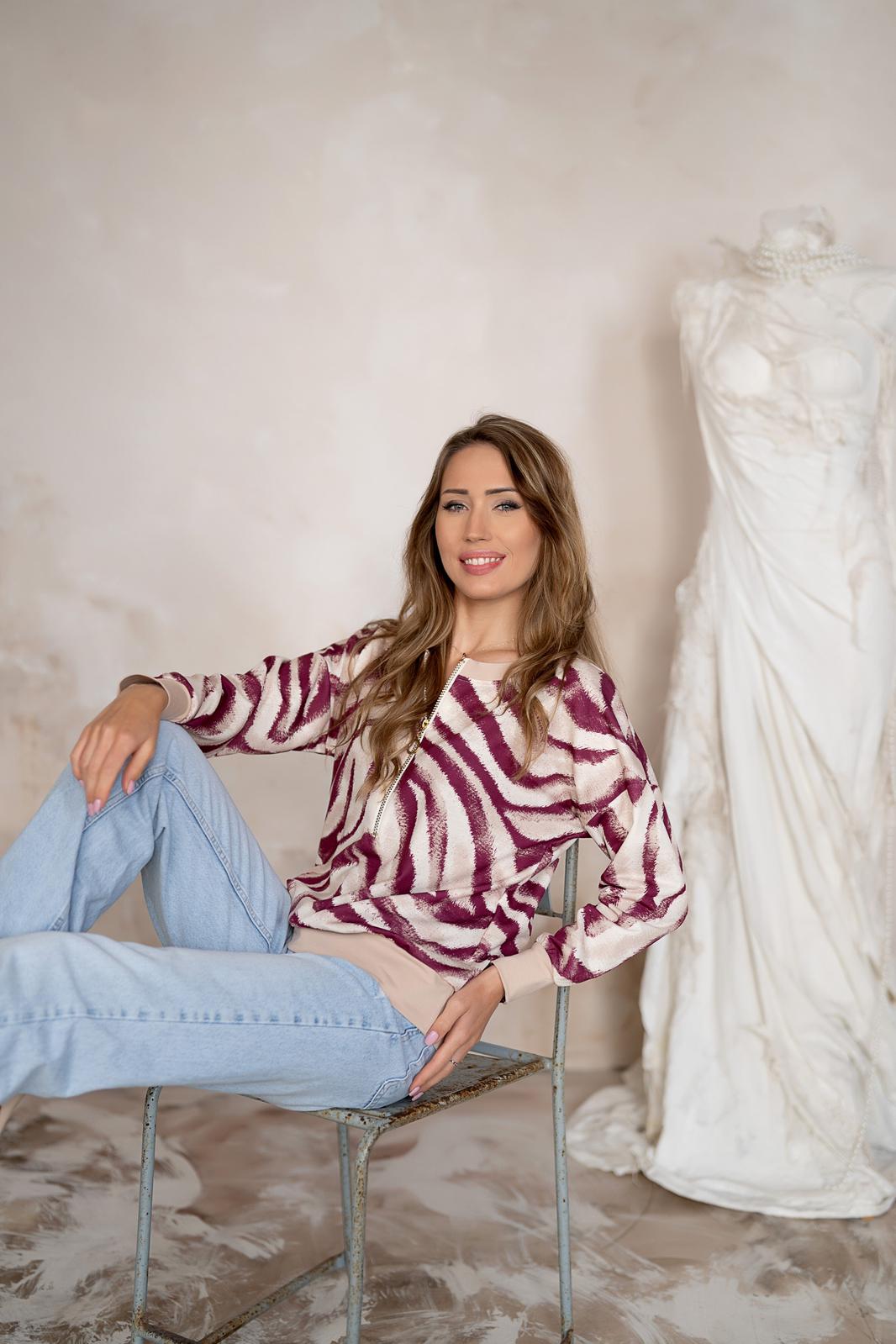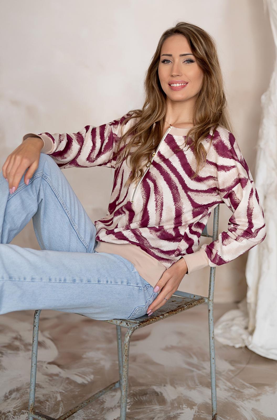 Джемпер женский из хлопкового трикотажного полотна прямого силуэта. Застегивается на молнию. Рукава длинные, втачные с манжетой. Низ также обработан притачной деталью, как у манжета рукавов. Вырез округлый. Размеры от 44 по 54. Ткань приятная для прогулок, занятия спортом. Отлично сочетается с брюками, джинсами, юбками.