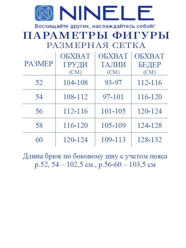 Брюки классические, с посадкой на талии, выполнены из вискозного полотна. Модель с центральной застёжкой на тесьму-«молнию», на притачном поясе, застегивающемся на петлю и пуговицу. Передние и задние половинки брюк с талиевыми вытачками, направленными от пояса вниз. Спереди обработаны боковые наклонные карманы. Для лучшего прилегания брюк в области талии в поясе по задним половинкам вставлена эластичная лента. Длина брюк по боковому (с поясом) – 101,5 см (46-50 р-р), 102,5 см (52-54 р-р), 103,5 см (56-60 р-р).