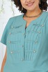 Блузка полуприлегающего силуэта, выполнена из вискозного полотна. Модель с плечевыми накладками и разрезами в боковых швах. Перед декорирован вставками с застроченными вертикальными защипами и отрезными фигурными планками, застегивающимися на 3 петли и 3 пуговицы. От планок к швам притачивания вставок направлены навесные петли, застегнутые на пуговицы. Спинка со средним швом; круглая горловина спинки обработана отрезной фигурной бейкой. Рукав короткий, втачной. Длина блузки – 66,5 (46-50 р-р) см, 69 см (52-60 р-р); длина рукава – 19,5 см (46-50 р-р), 20,0 (52-60 р-р) см.