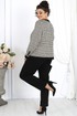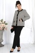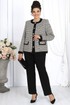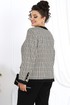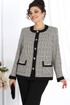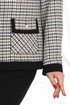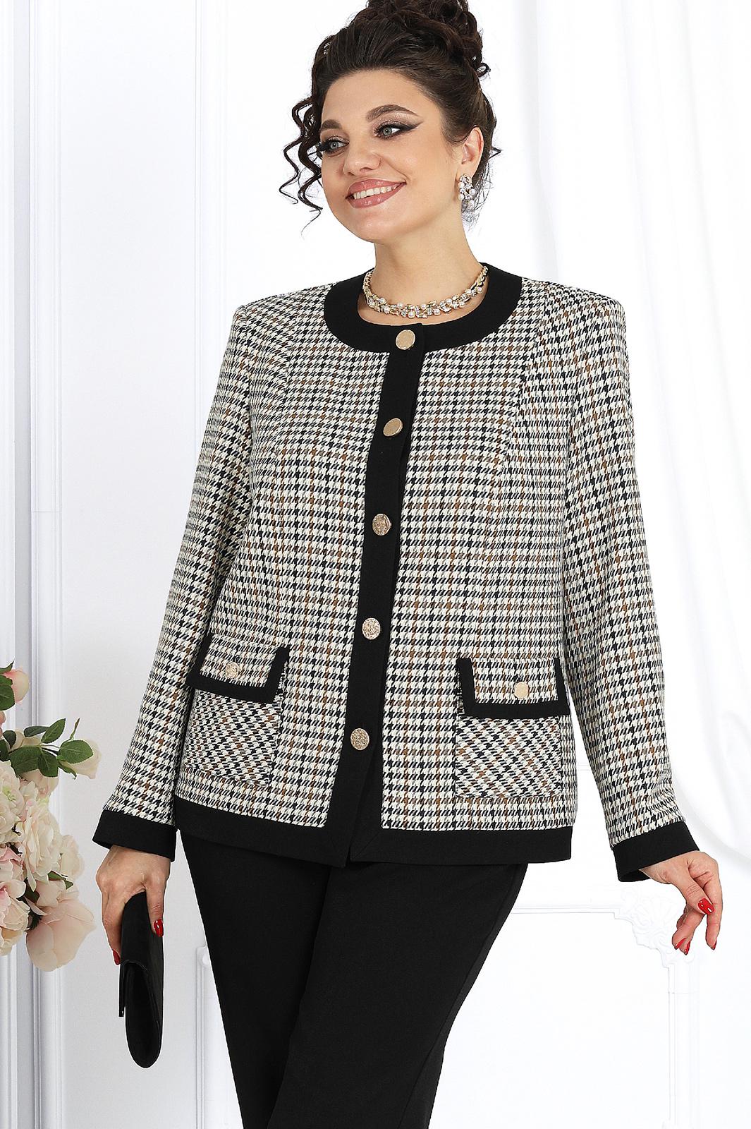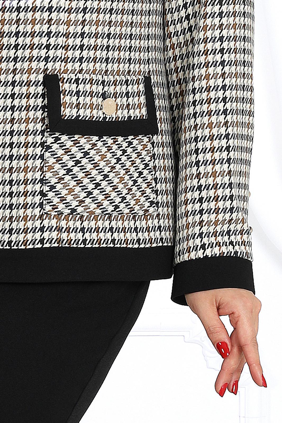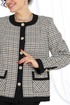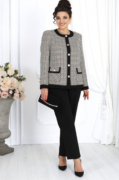 Жакет на подкладке, выполнен из костюмной ткани «гусиная лапка». Модель полуприлегающего силуэта, без воротника, с однобортной застежкой на 5 петель и 5 металлических пуговиц. Перед с рельефными швами, направленными от плечевых швов до низа; в нижней части переда расположены накладные карманы, дополненные клапанами, застегивающимися на петлю и пуговицу. Спинка с рельефными швами, направленными от плечевых швов до низа. Круглая горловина, низ жакета, край клапана и борта обработаны притачными планками из контрастной ткани. Рукав длинный, втачной, двухшовный, с притачной планкой, имитирующей шлицу по локтевому шву с 3-мя пуговицами, и планкой по низу рукава. Длина жакета - 64 см; длина рукава - 62 см.