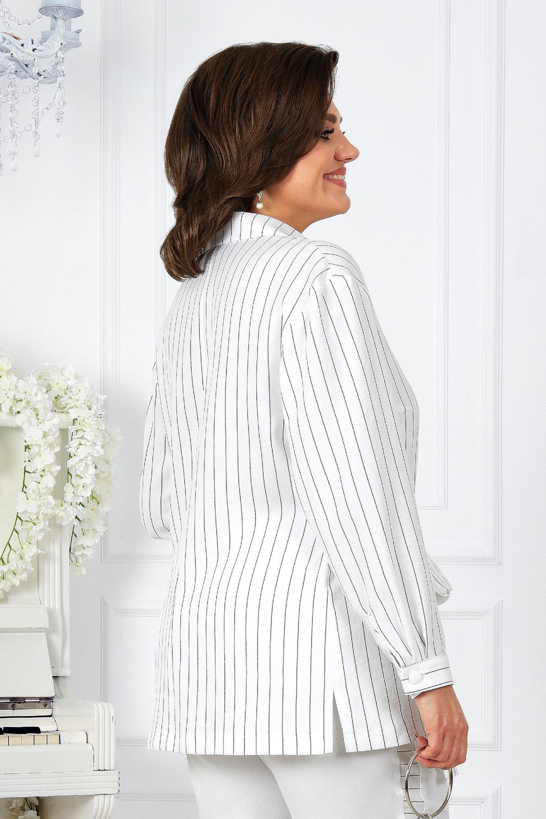 Блузка прямого силуэта, с удлиненной линией плеча, с центральной бортовой застежкой с отрезными планками на 6 петель и 6 пуговиц, со стояче-отложным воротником с отрезной стойкой. Длина изделия по середине спинки 71 см от шва втачивания воротника в горловину.