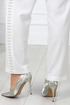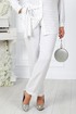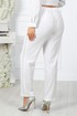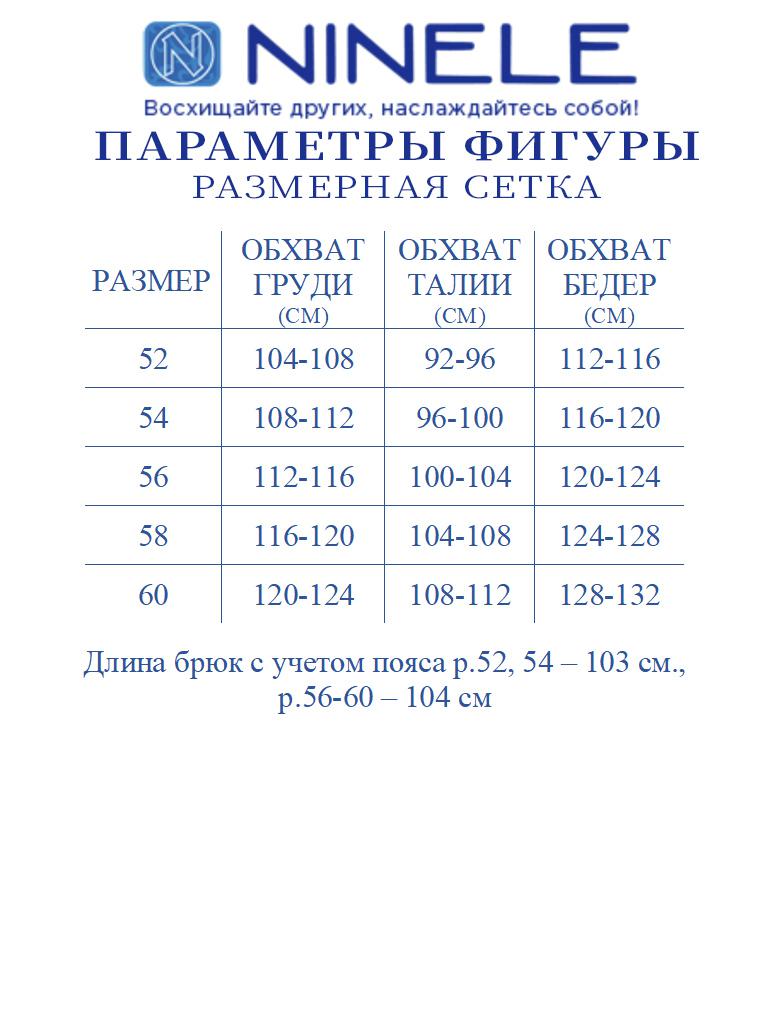 Брюки с посадкой на талии, зауженные к низу, на притачном поясе, с застёжкой на тесьму-«молния», расположенную в среднем шве передних половинок, и 1 петлю и 1 пуговицу на поясе. Задние половинки брюк с талиевыми вытачками, идущими от пояса вниз. Передние половинки брюк с двумя застроченными односторонними складками, идущими от пояса вниз, с наклонными боковыми карманами, с притачными лампасами. Бочки переда и лампасы выполнены из полоски лен вишер. Низа брюк на передних и задних половинках оформлены защипами, идущими от низа вверх на 16 см. Для лучшего прилегания брюк в области талии в поясе со стороны спинки вставлена резинка.