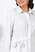 Перед с нагрудными вытачками, выходящими из боковых швов. Направление полосок на правой части переда горизонтальное. В правый боковой шов и в шов соединения правой части переда с планкой на уровне талии вставлены обтачные пояса, которые завязываются между собой. Спинка со средним швом. В боковых швах обработаны разрезы. Рукава втачные, одношовные, с окантованными разрезами, по низу с двумя односторонними складками, с притачными манжетами, застегивающимися на 1 петлю и 1 пуговицу. Длина рукава с манжетой 56,5 см.