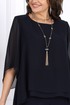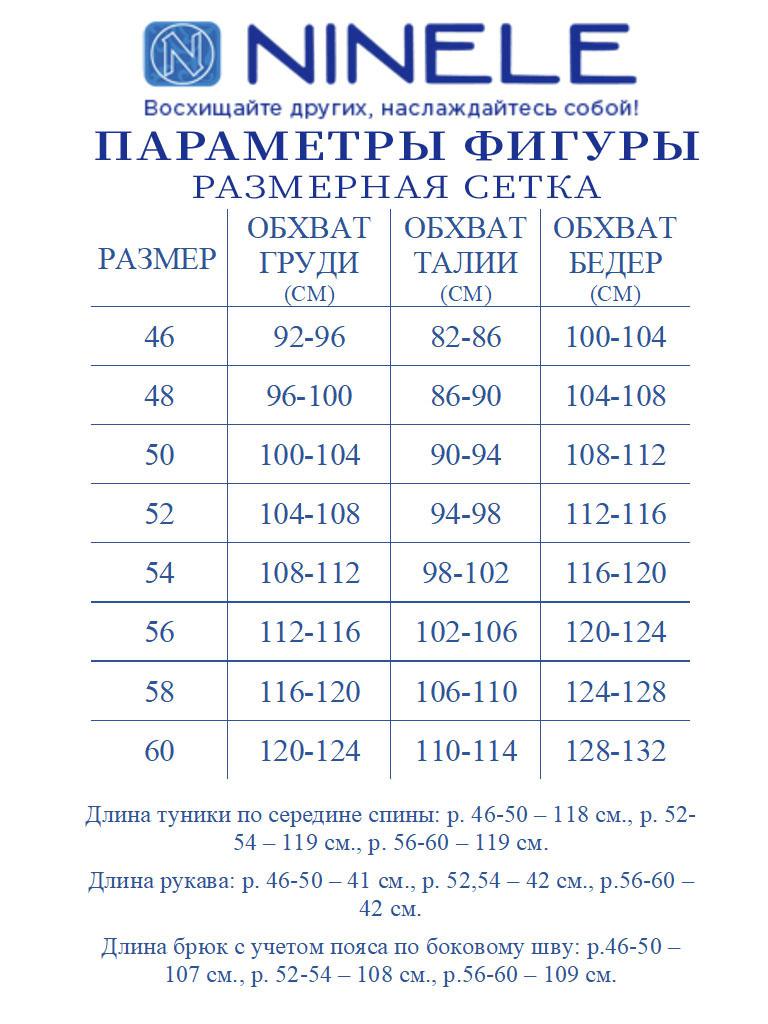 Туника А-образного силуэта, выполнена из шифона. Модель без подкладки и застежки, с плечевыми накладками. Низ туники асимметричной формы: укороченный спереди и удлиненный к центру спинки. Перед и спинка состоят из двух разных по длине слоев: верхний спереди короче нижнего на 4 см, а по спинке на 16 см. Горловина переда и спинки округлая, по переду слегка углубленная. Рукав, втачной, расширенный, с фигурным низом. Длина туники (по середине спинки) – 118 см (46-50 р-р), 119 см (52-60 р-р); длина рукава – 41 см (46-50 р-р), 42 см (52-60 р-р).