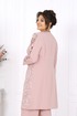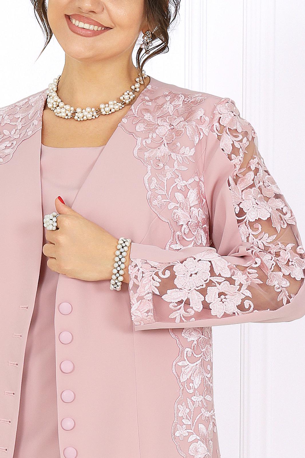 Кардиган полуприлегающего силуэта, выполнен из костюмно-плательной ткани и гипюра. Модель без воротника и плечевых накладок. Перед на подкладке, с рельефными швами, направленными от проймы до низа, и центральной застежкой на 6 прорезных петель и 6 пуговиц. В области горловины, плеча и боковой части переда настрочены декоративные элементы из гипюра с фестонами по краю. Спинка со средним швом и рельефами, направленными от проймы до низа. Горловина округлая по спинке, спереди V-образная, углубленная. Рукав длинный, втачной, со вставкой из гипюра в верхней части. Длина кардигана – 95 см, длина рукава – 60 см.