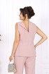 Блузка полуприлегающего силуэта, выполнена из костюмно-плательной ткани. Модель без подкладки, воротника, рукавов и плечевых накладок. Перед с нагрудными вытачками. Спинка с талиевыми вытачками и средним швом, в верхней части которого обработана застежка на потайную тесьму-«молнию» (50 см). Горловина округлая, углубленная спереди. Длина блузки – 65 см.