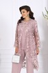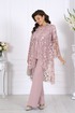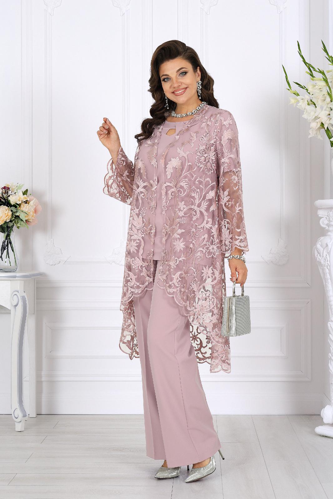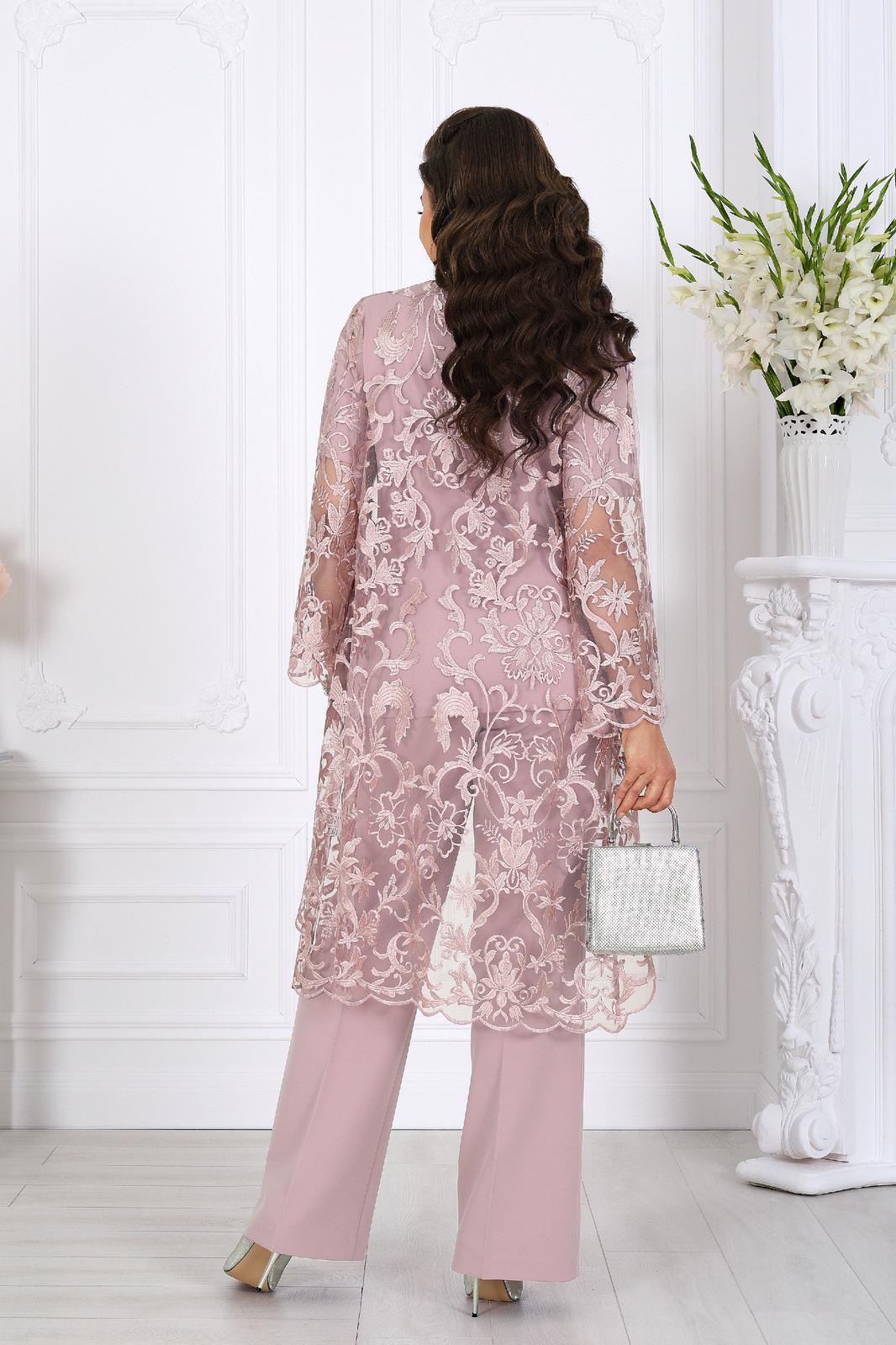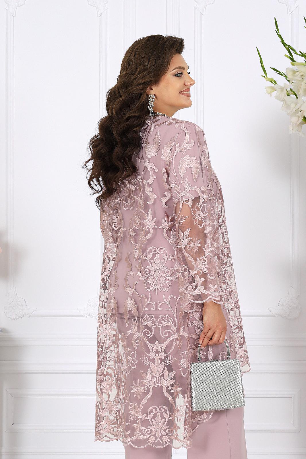 Воздушный гипюровый кардиган прямого силуэта с удлинённой спинкой и фигурными фестонами по краю создаёт лёгкость и утончённость образа. Полуприлегающая блузка из эластичного трикотажа «масло» мягко повторяет линии фигуры, не сковывая движения. Классические прямые брюки из костюмно-плательной ткани со стрелками визуально вытягивают силуэт, формируя изящные пропорции и обеспечивая комфорт в течение всего дня.